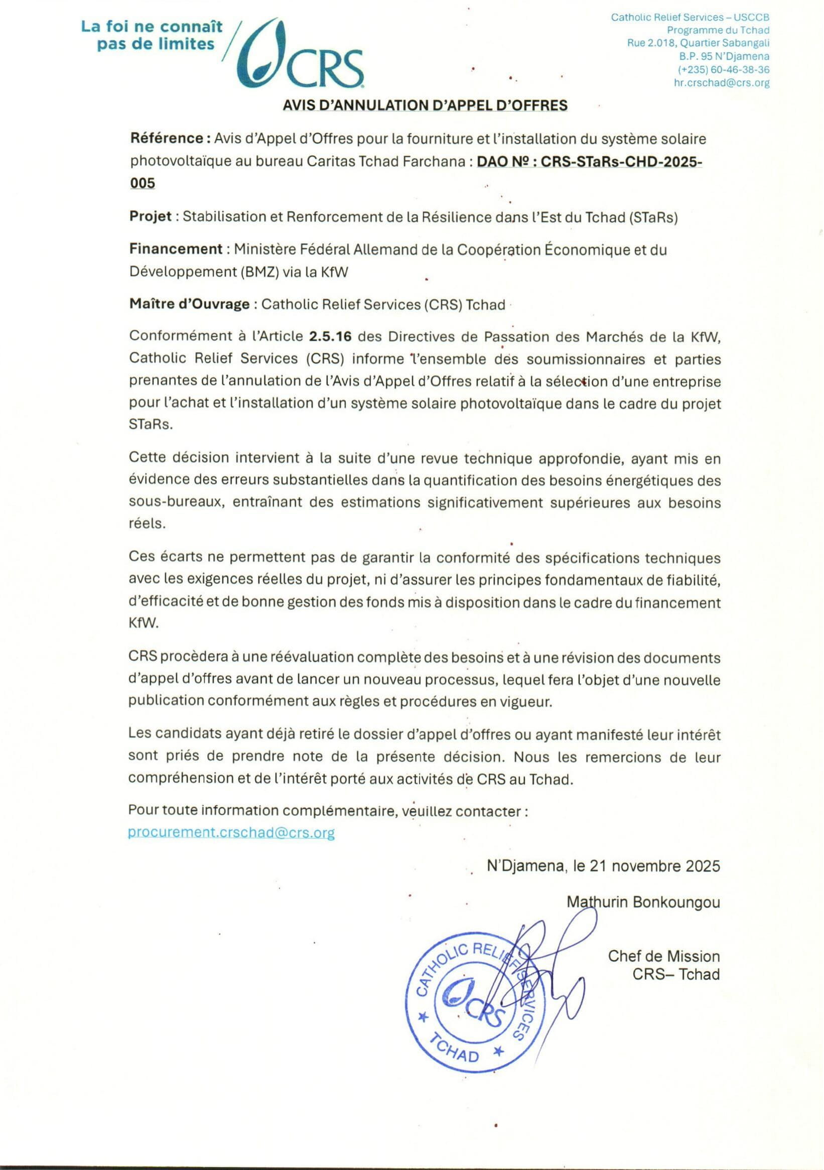 Catholic Relief Services (CRS) annonce l’annulation de l’avis d’appel d’offre pour la fourniture et l’installation du système solaire photovoltaïque au bureau Caritas Tchad de Farchana