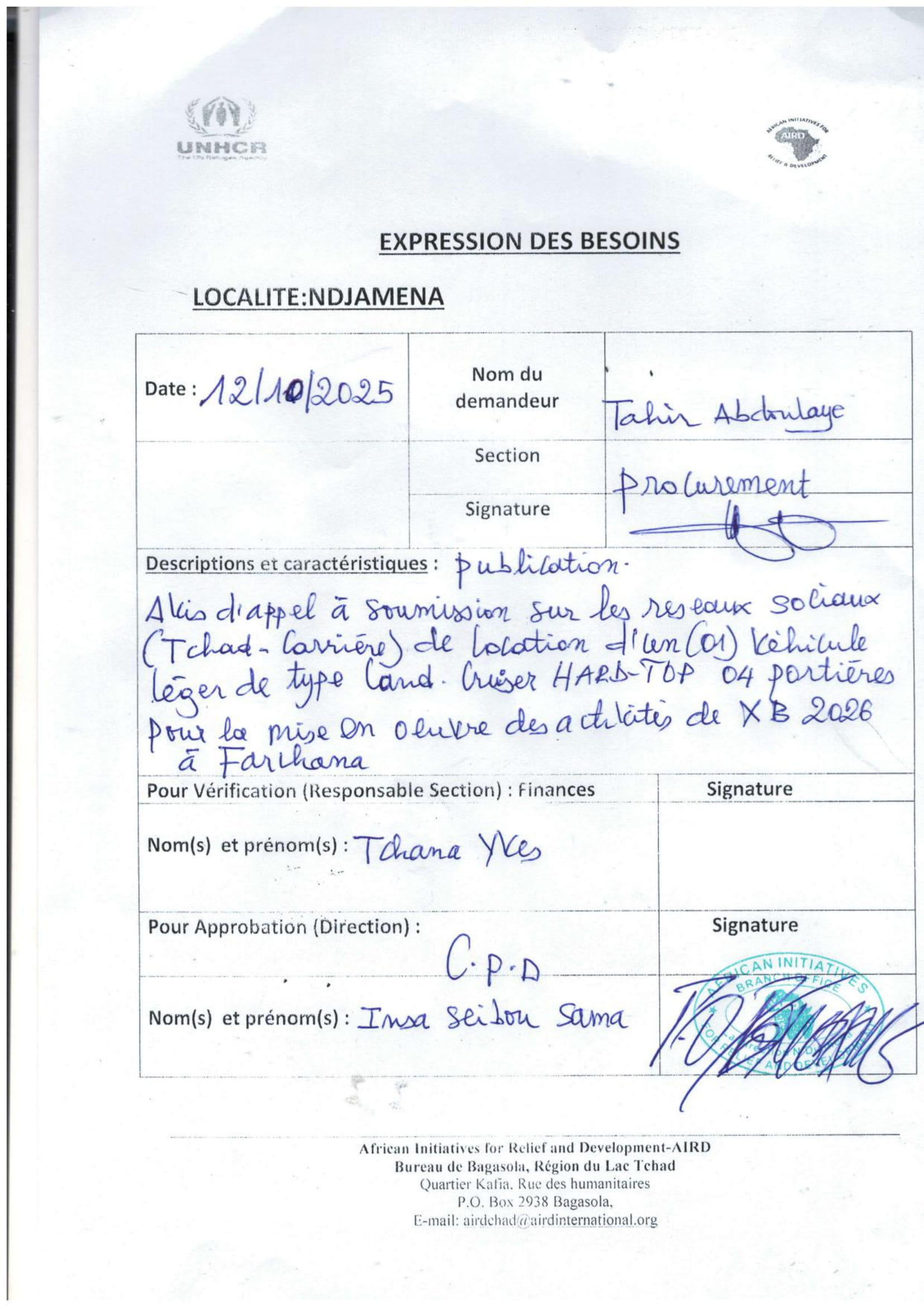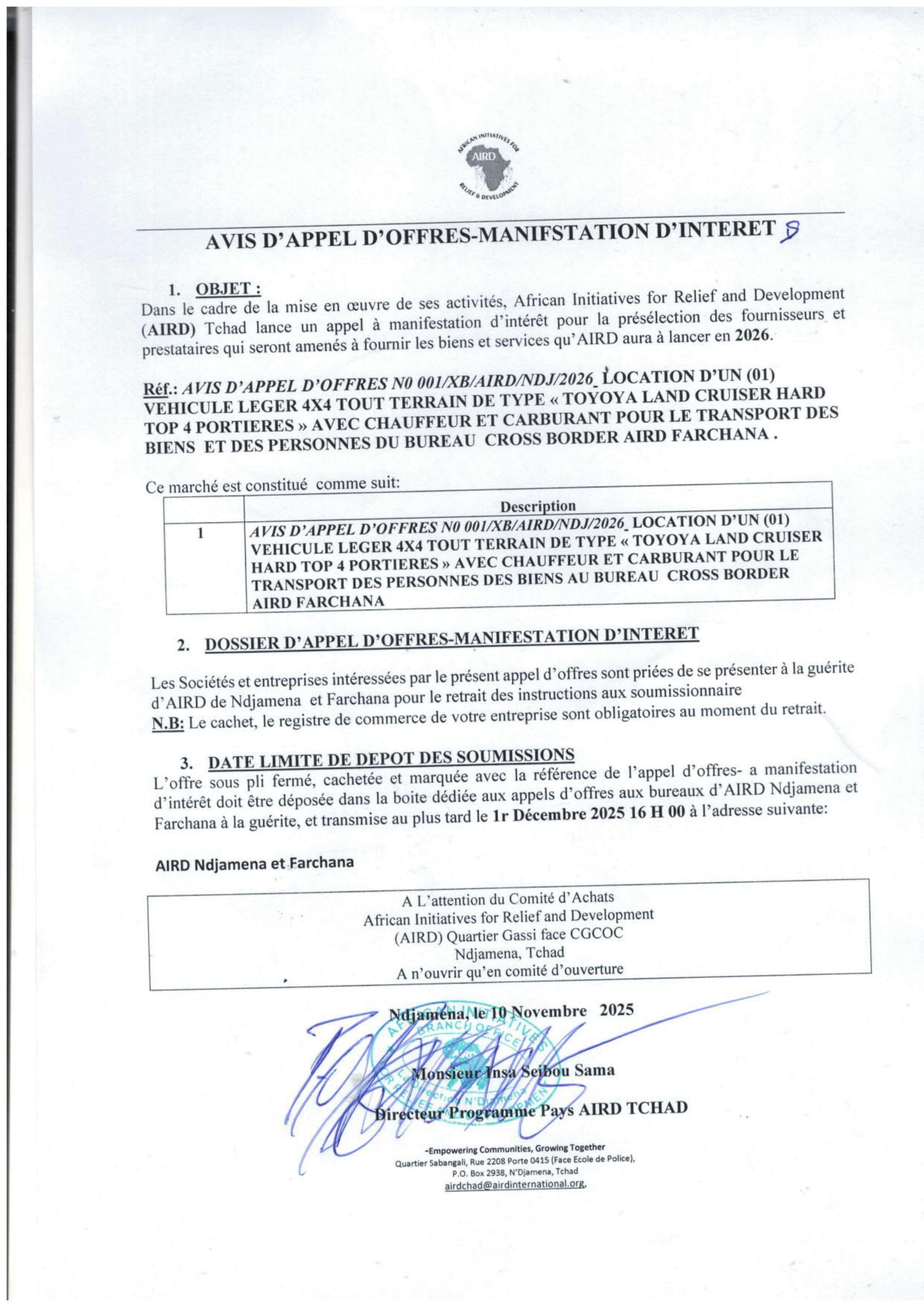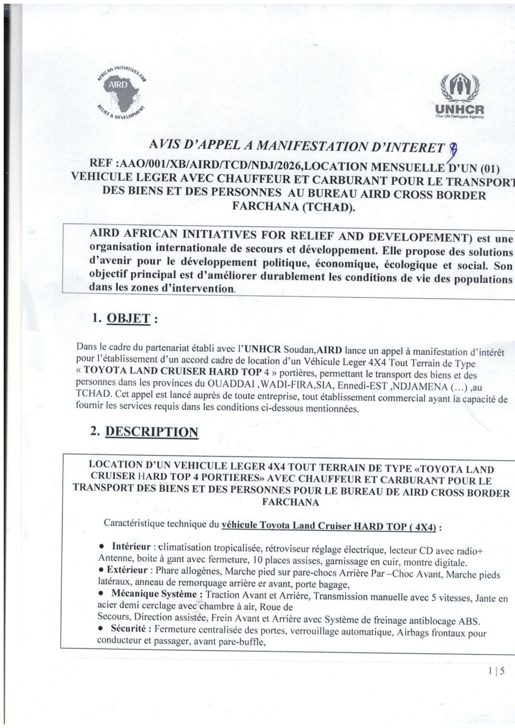 African Initiatives for Relief and Development (AIRD) lance un avis d’appel à manifestation d’intérêt pour la location d’un véhicule Leger 4×4 tout terrain de type Land Cruiser Hard Top 4 portières avec chauffeur et carburant, Farchana, Tchad