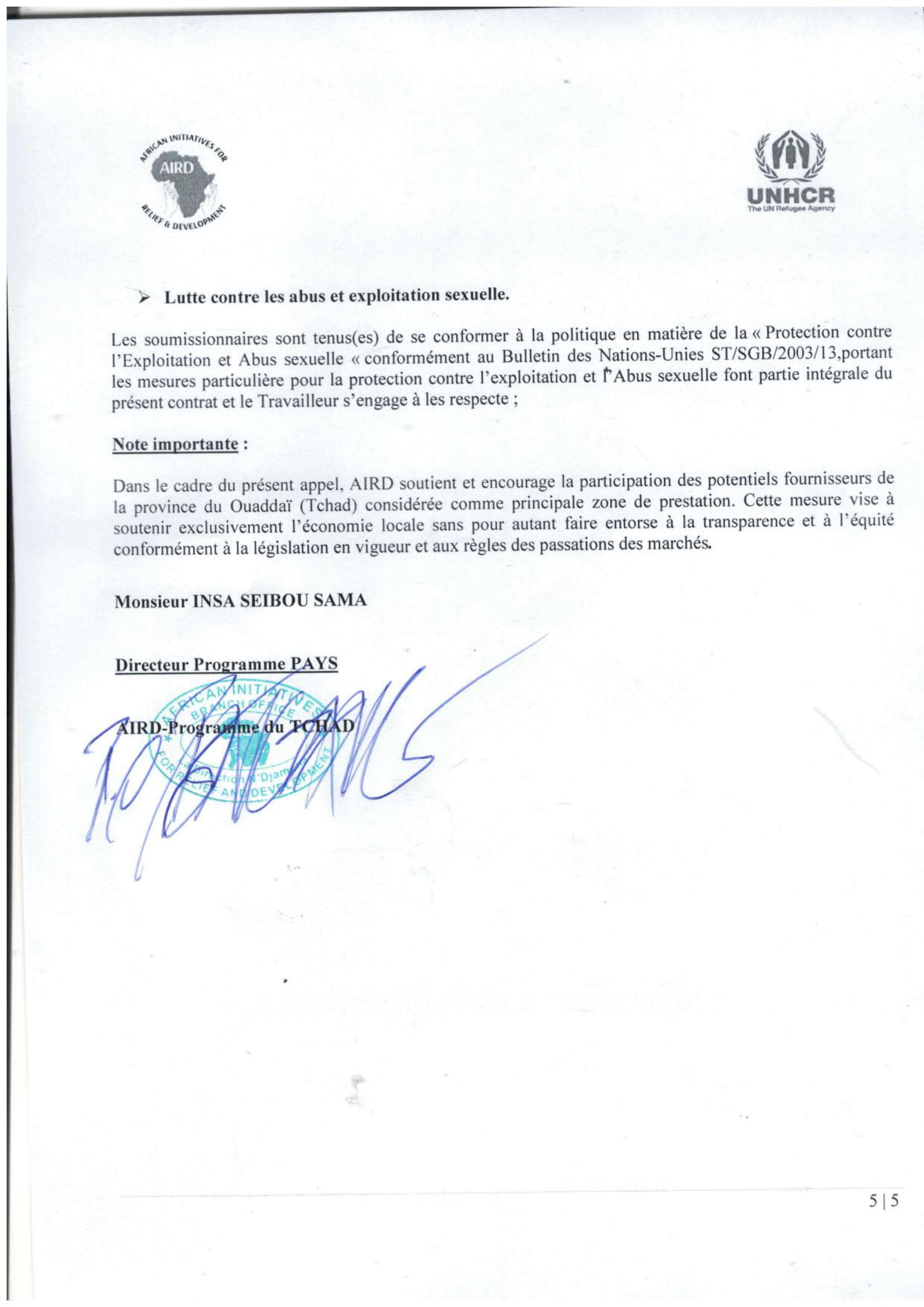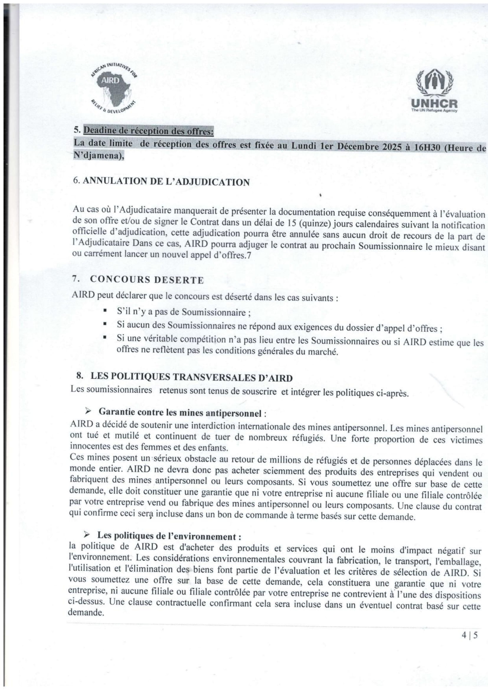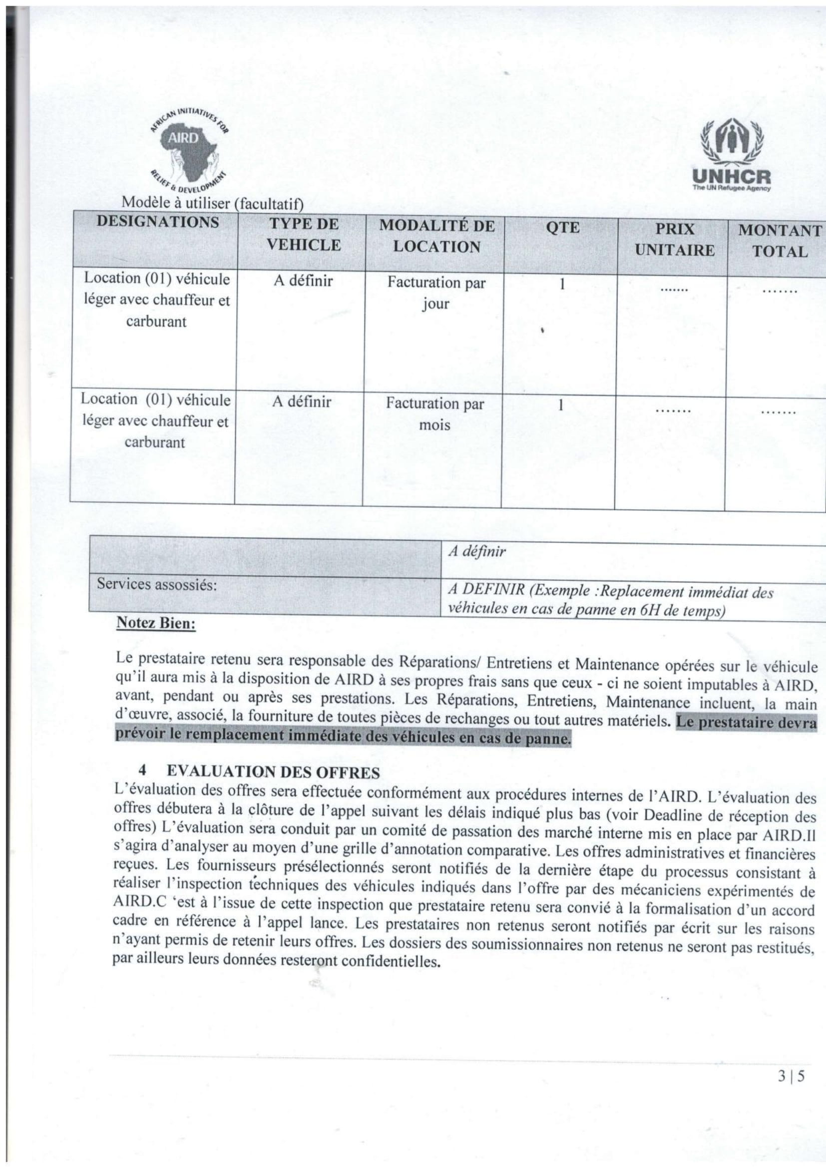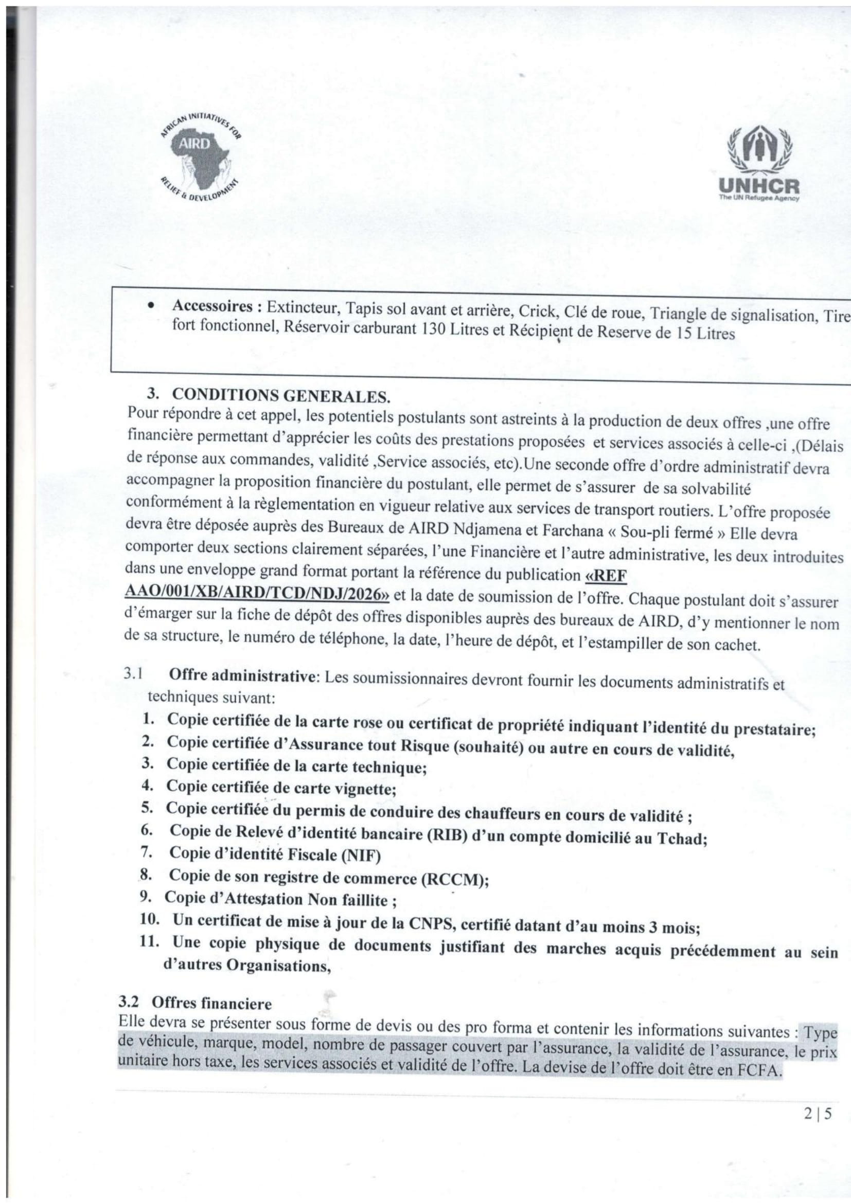 African Initiatives for Relief and Development (AIRD) lance un avis d’appel à manifestation d’intérêt pour la location d’un véhicule Leger 4×4 tout terrain de type Land Cruiser Hard Top 4 portières avec chauffeur et carburant, Farchana, Tchad