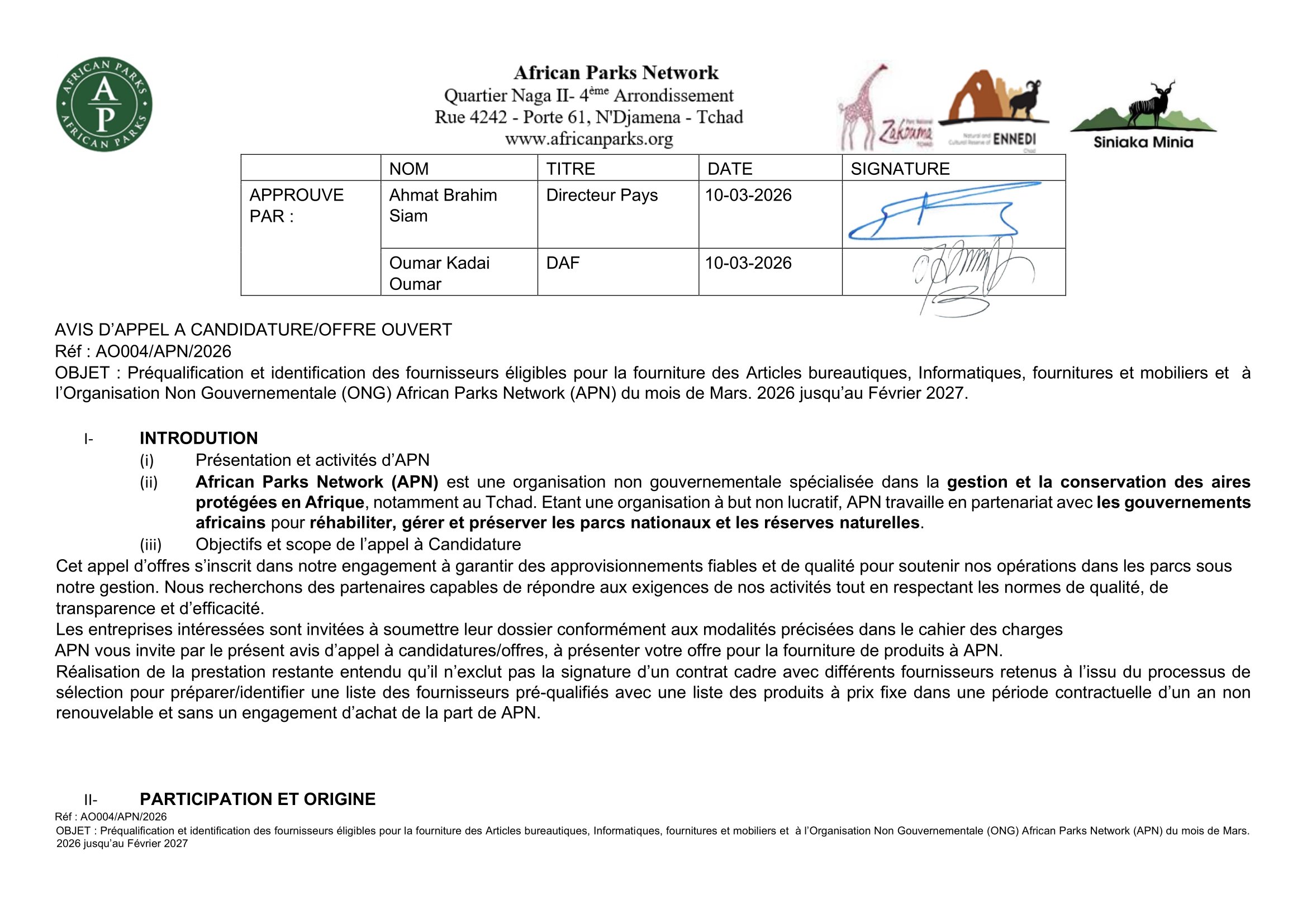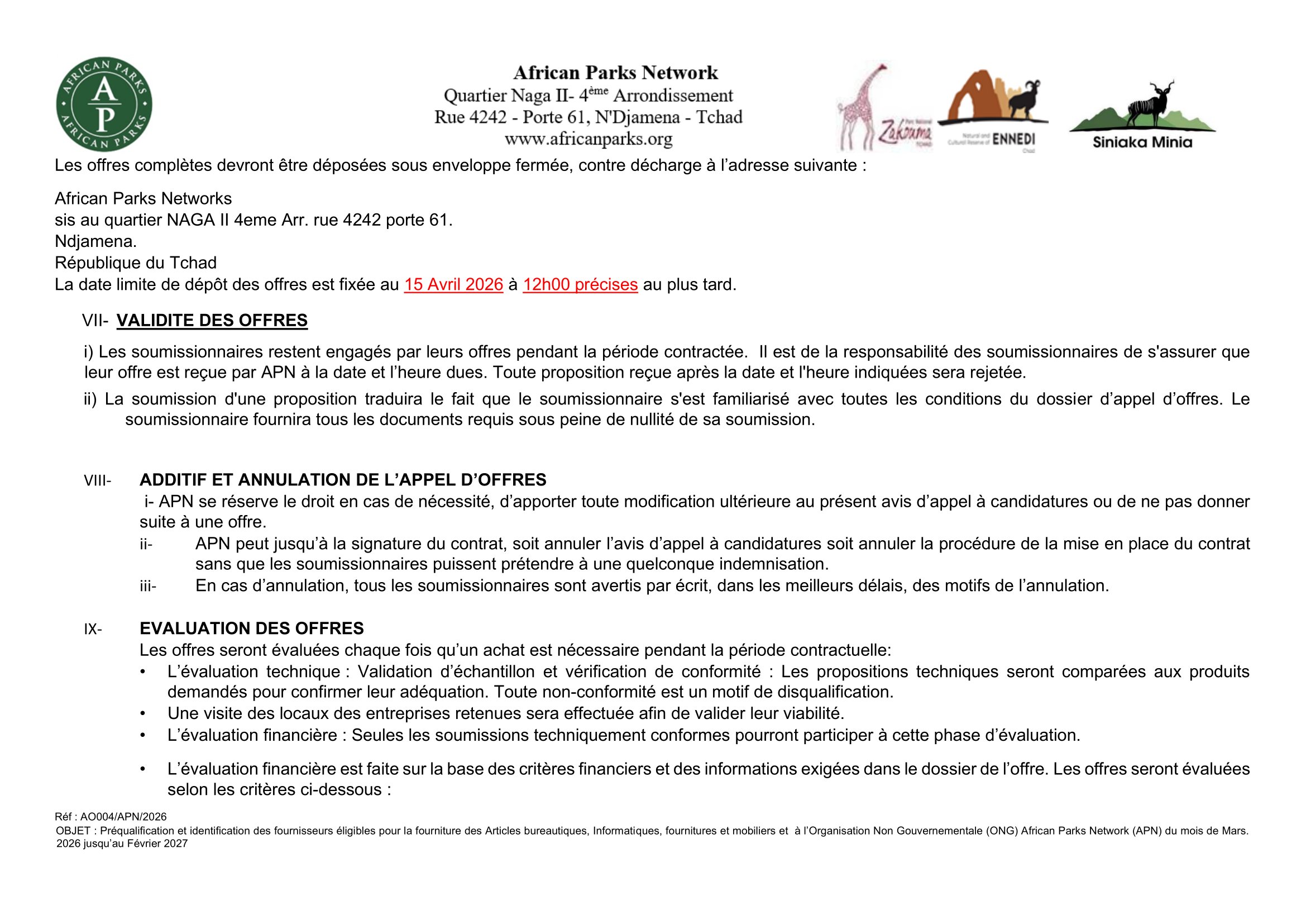 African Parks Network (APN) lance un avis d’appel d’offre pour la préqualification et identification des fournisseurs éligibles pour la fourniture des articles bureautiques, informatiques, fournitures et mobiliers, Tchad