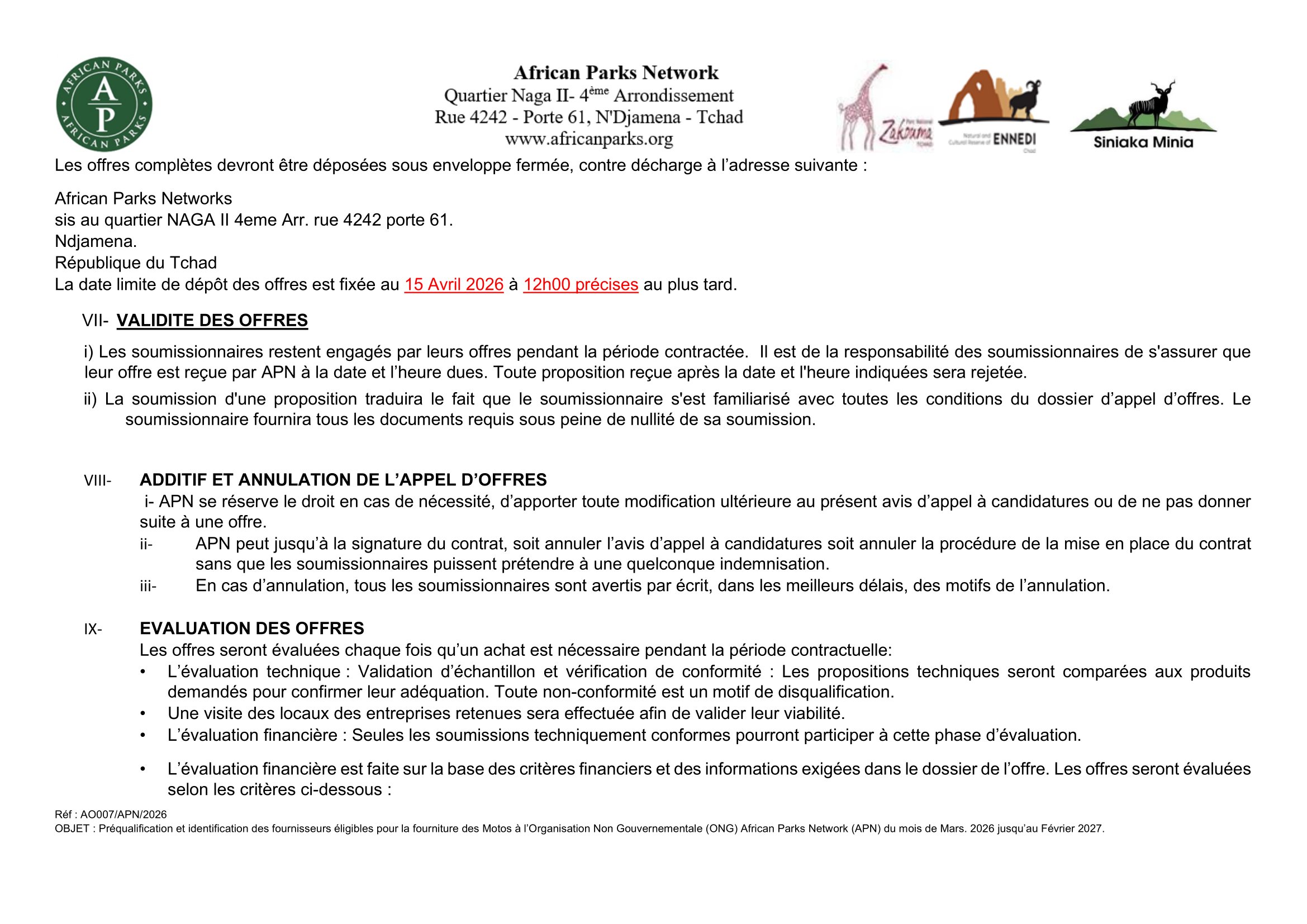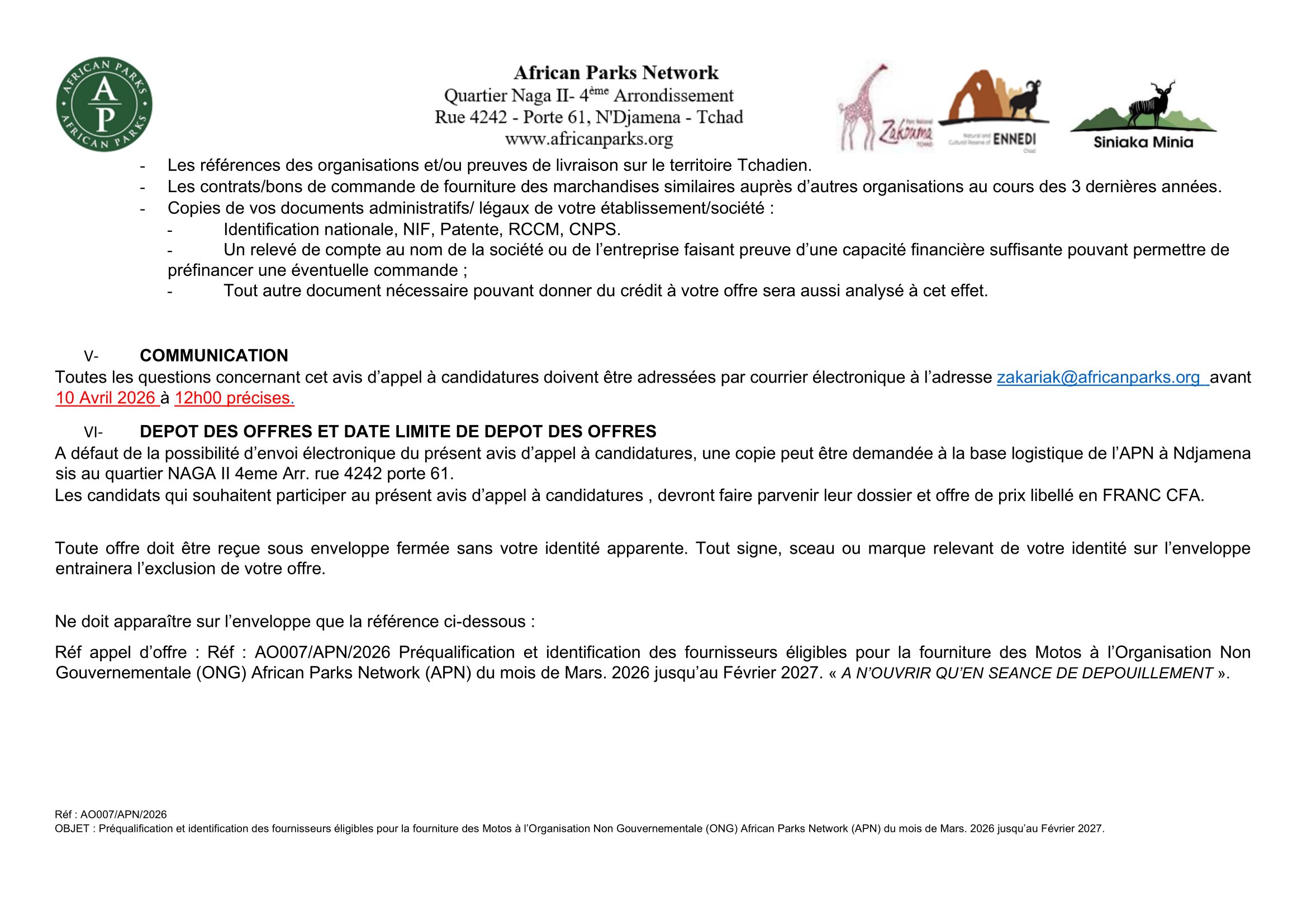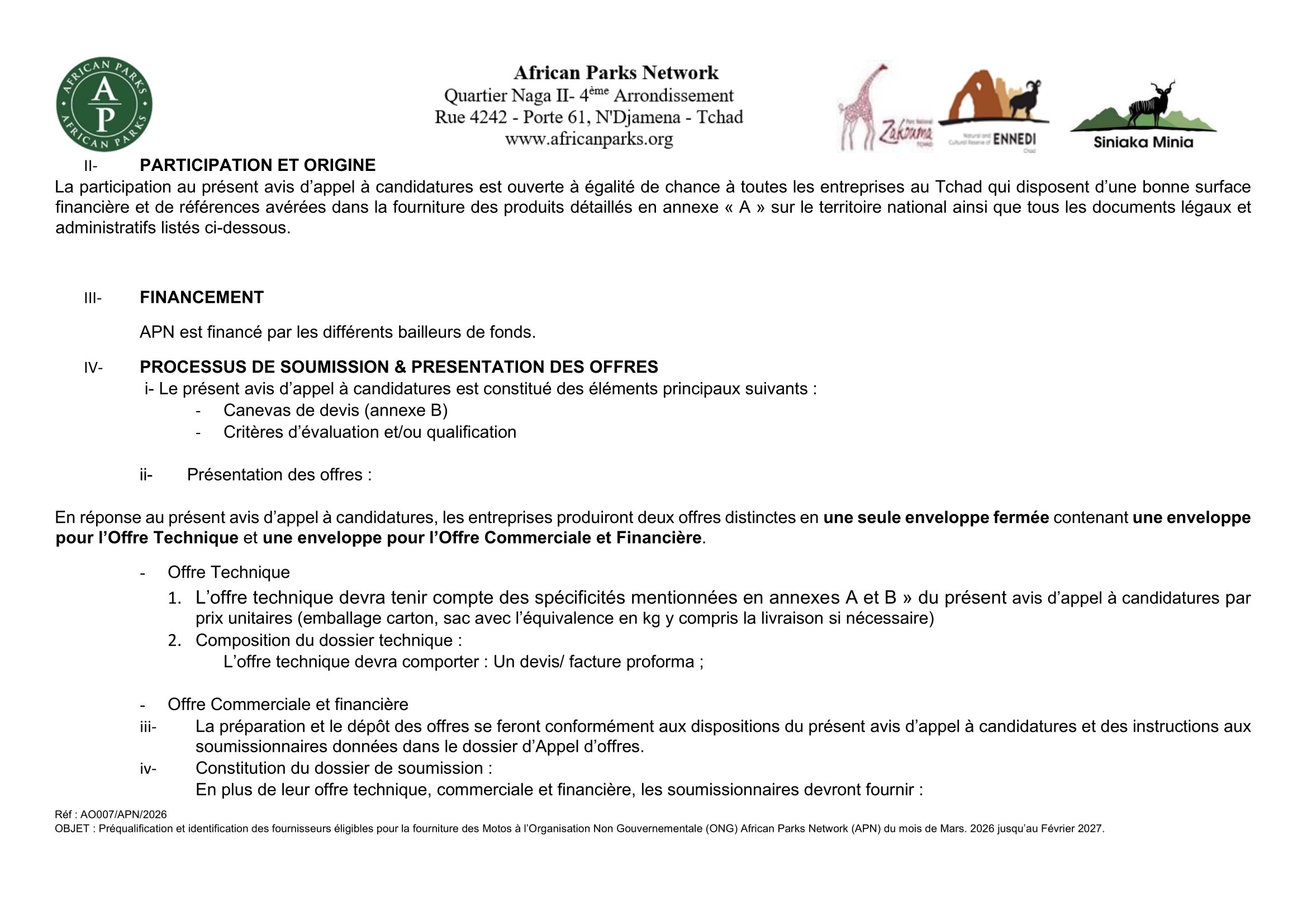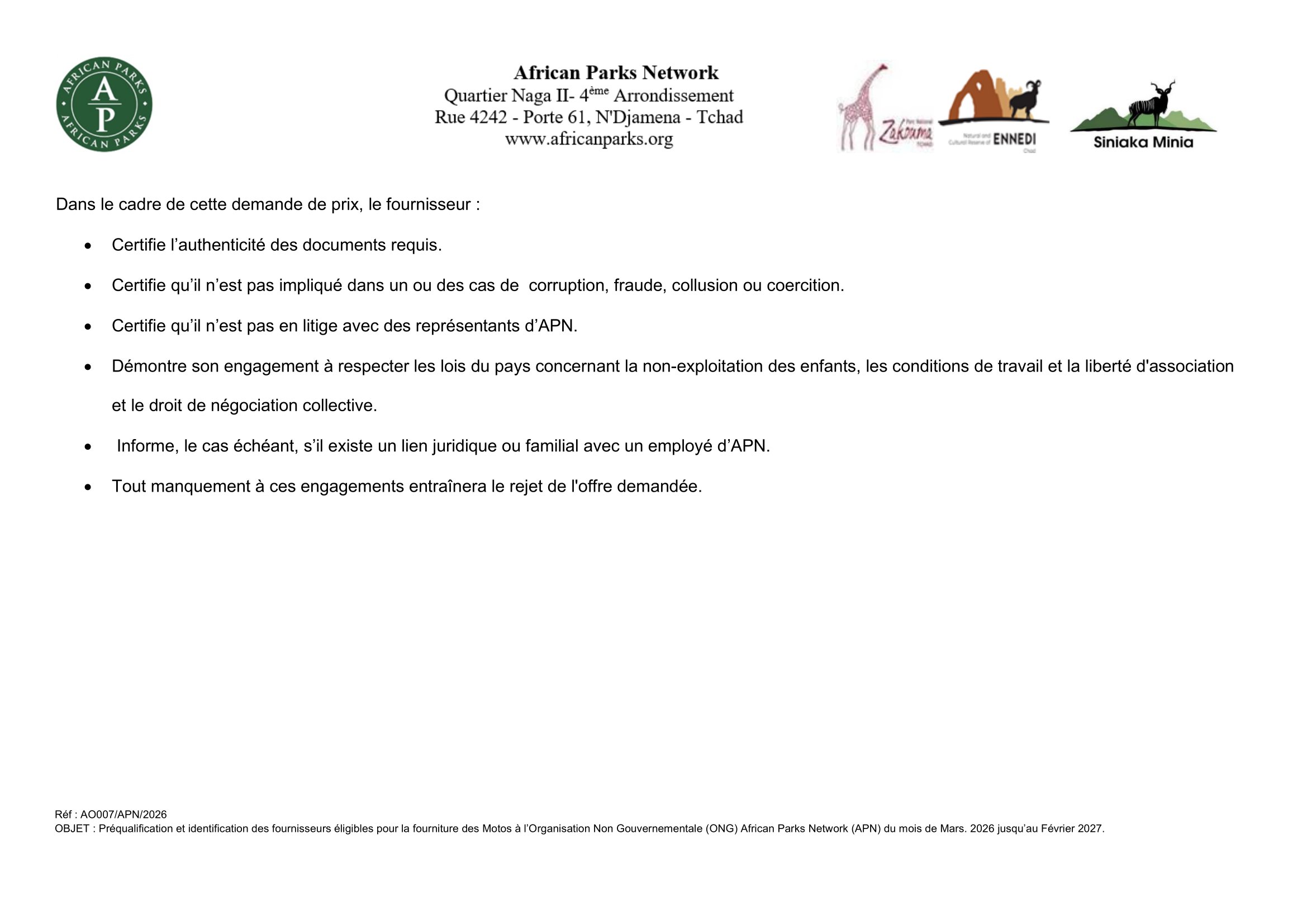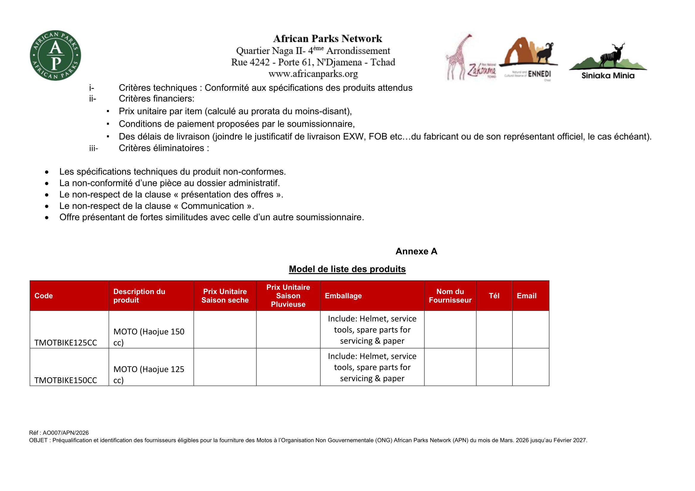 African Parks Network (APN) lance un avis d’appel d’offre pour la préqualification et identification des fournisseurs éligibles pour la fourniture des motos, Tchad