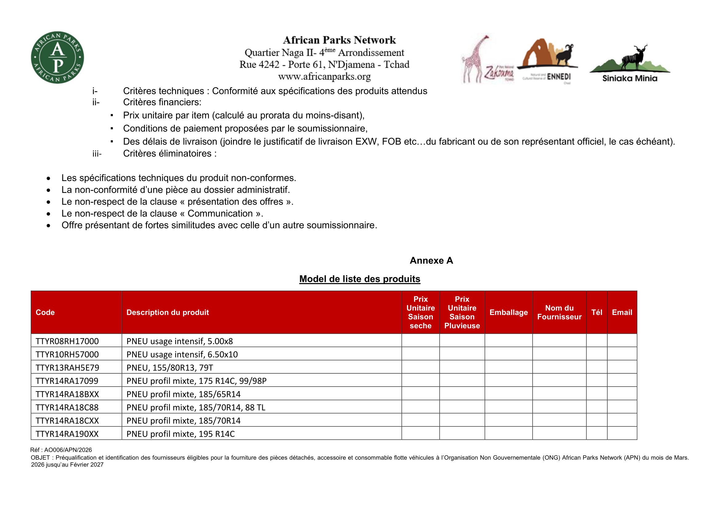 African Parks Network (APN) lance un avis d’appel d’offre pour la préqualification et identification des fournisseurs éligibles pour la fourniture des pièces détachées, accessoire et consommable flotte véhicules, Tchad