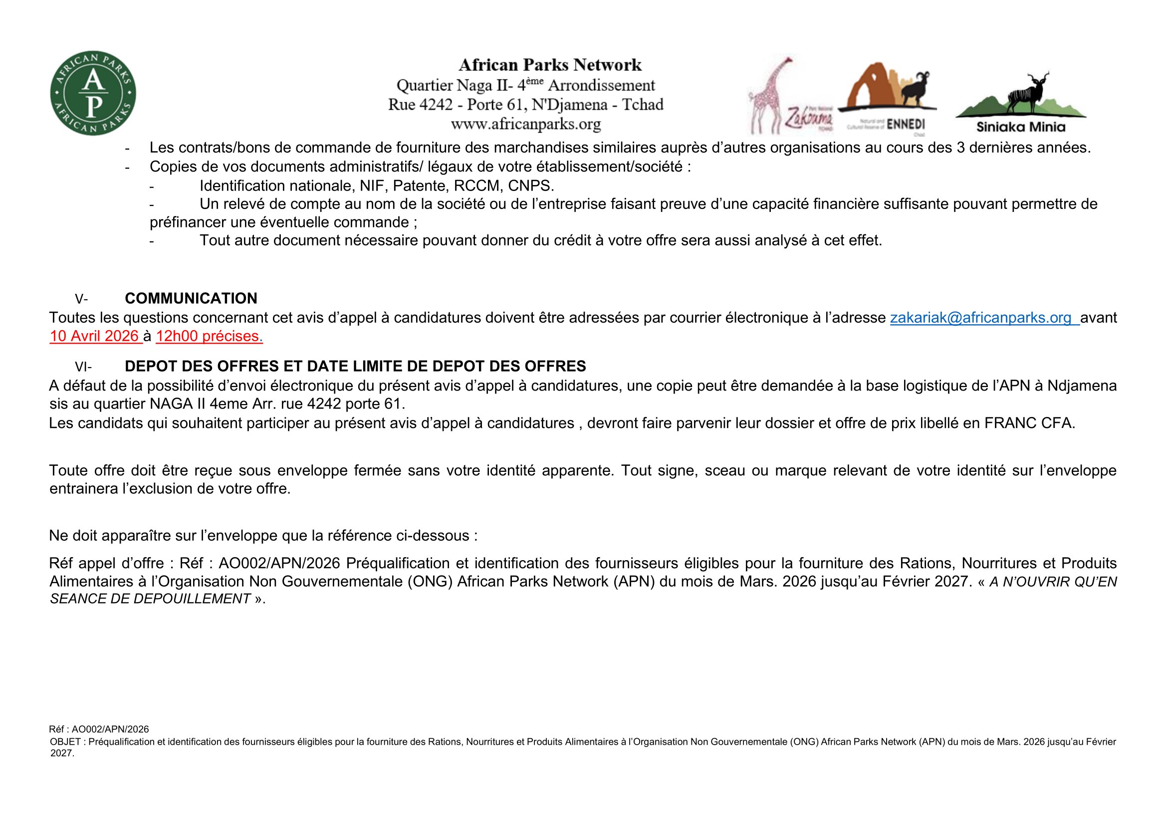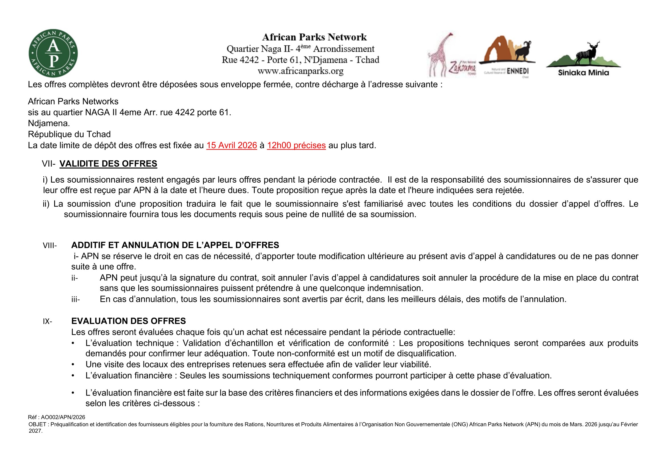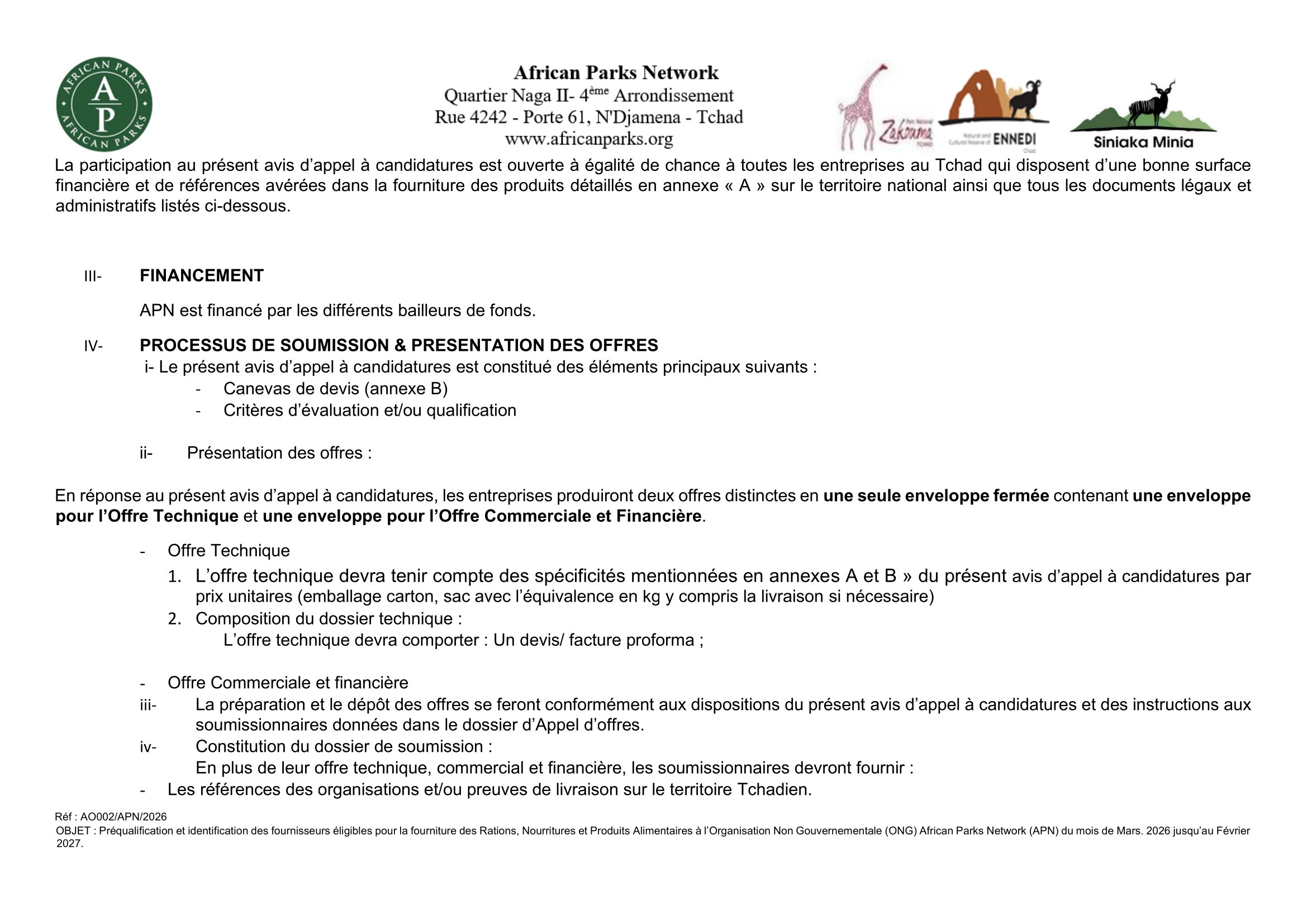 African Parks Network (APN) lance un avis d’appel d’offre pour la préqualification et identification des fournisseurs éligibles pour la fourniture des rations, nourritures et produits alimentaires, Tchad
