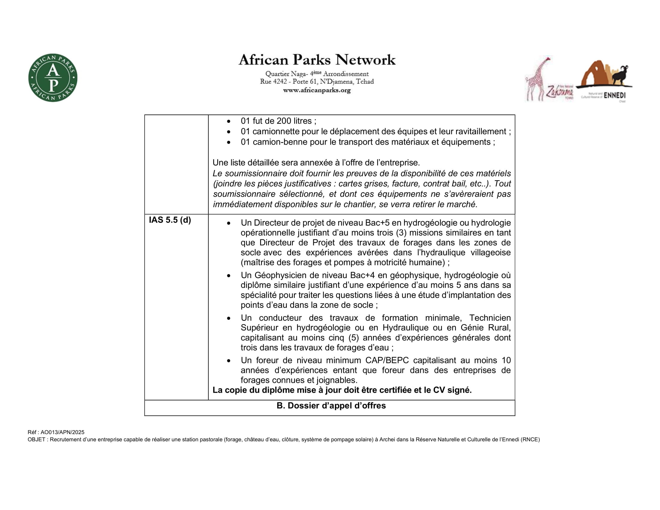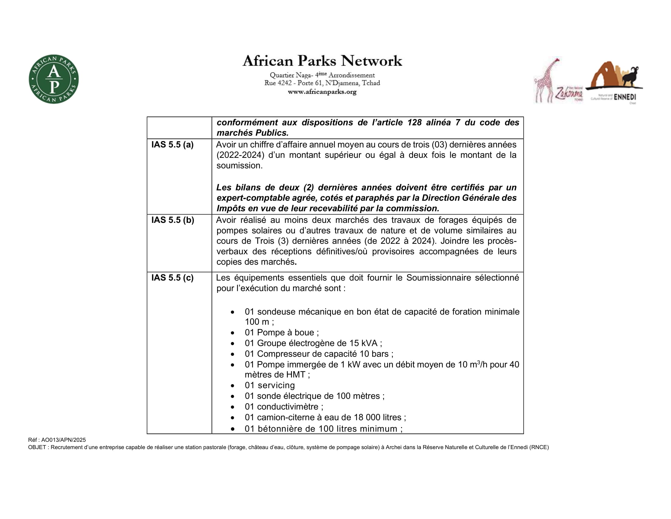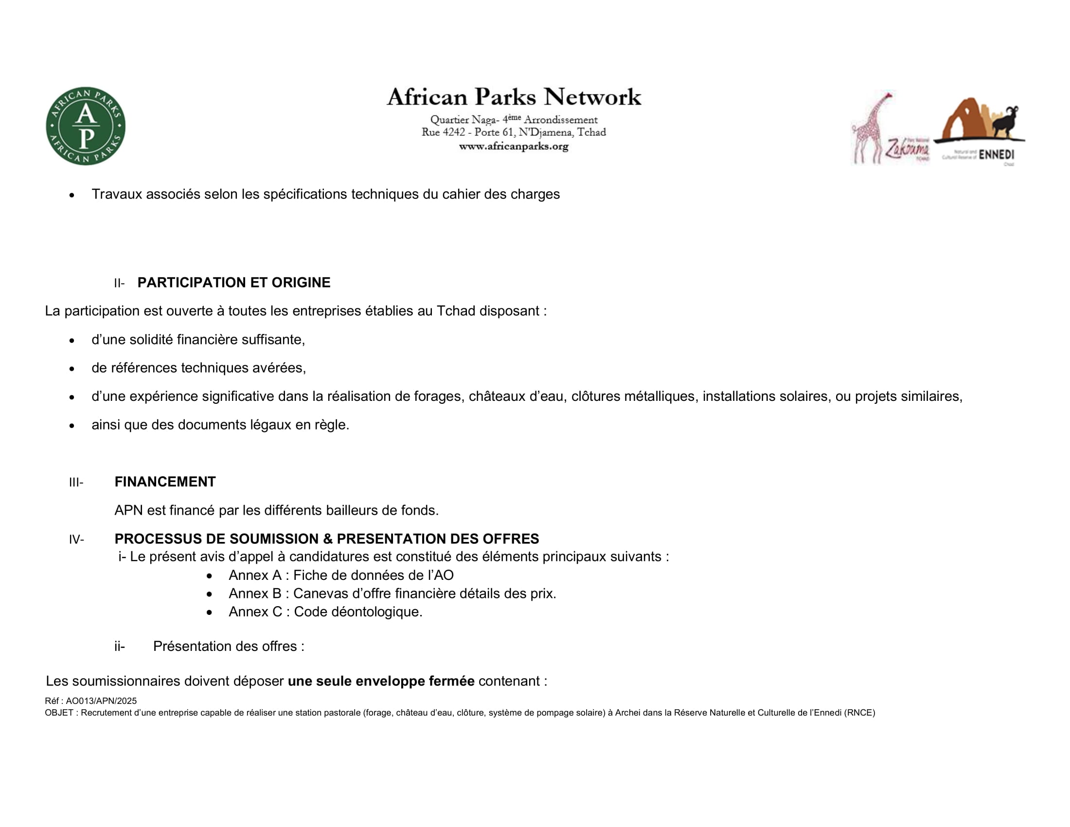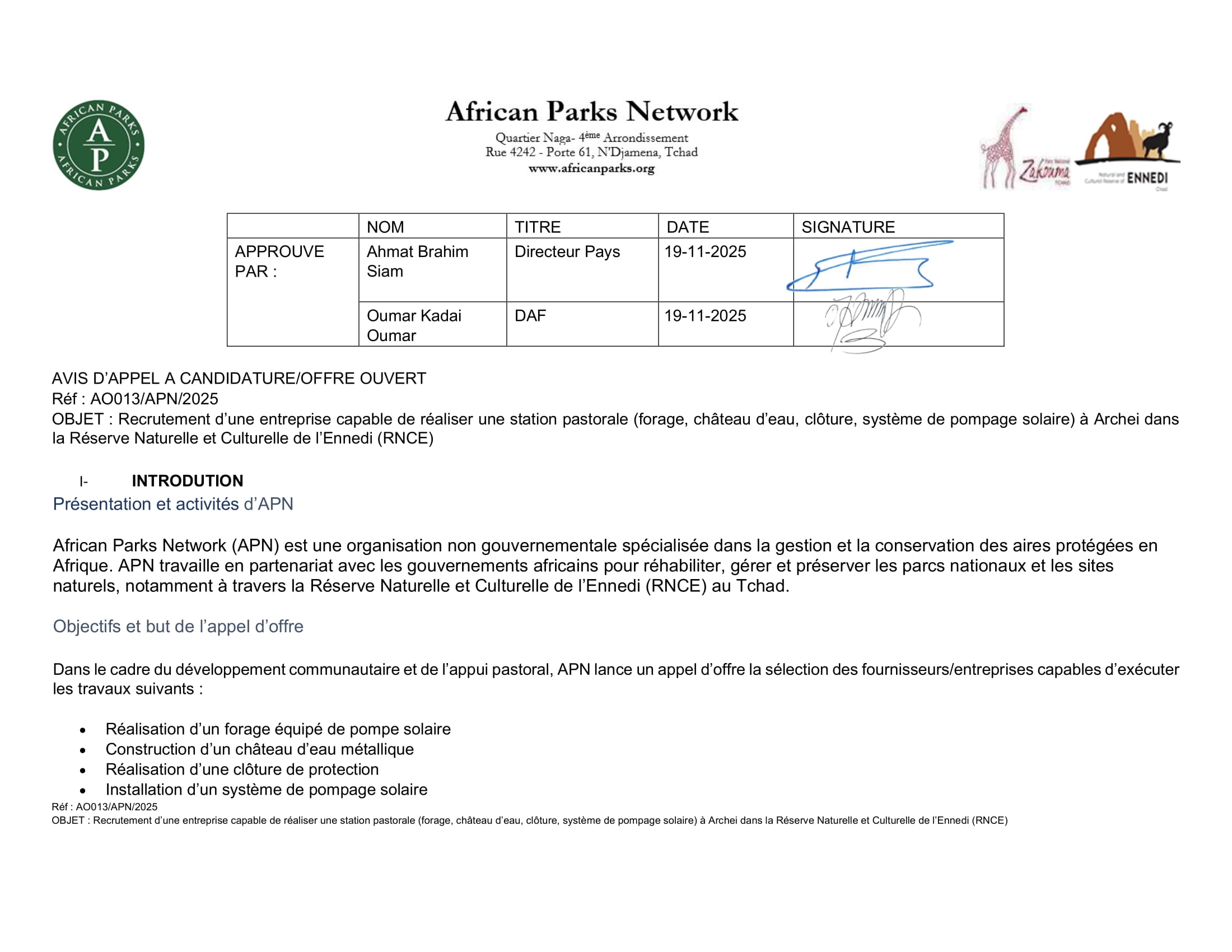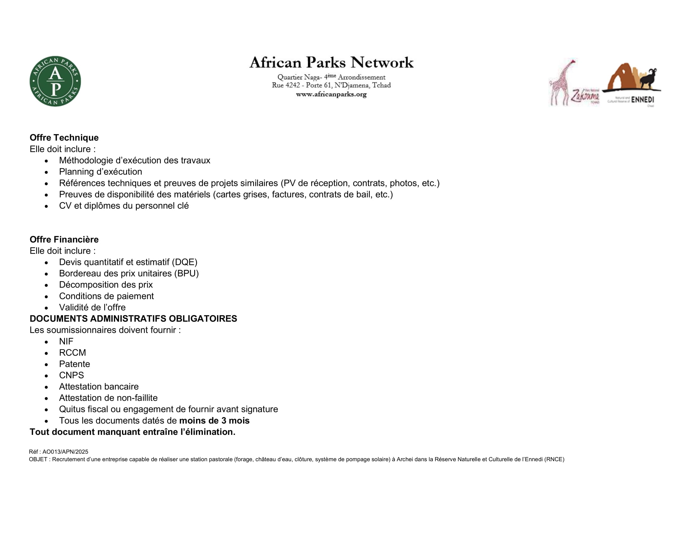 African Parks Network lance un avis d’appel d’offre pour la réalisation d’une station pastorale dans la réserve naturelle et culturelle de l’Ennedi, Tchad