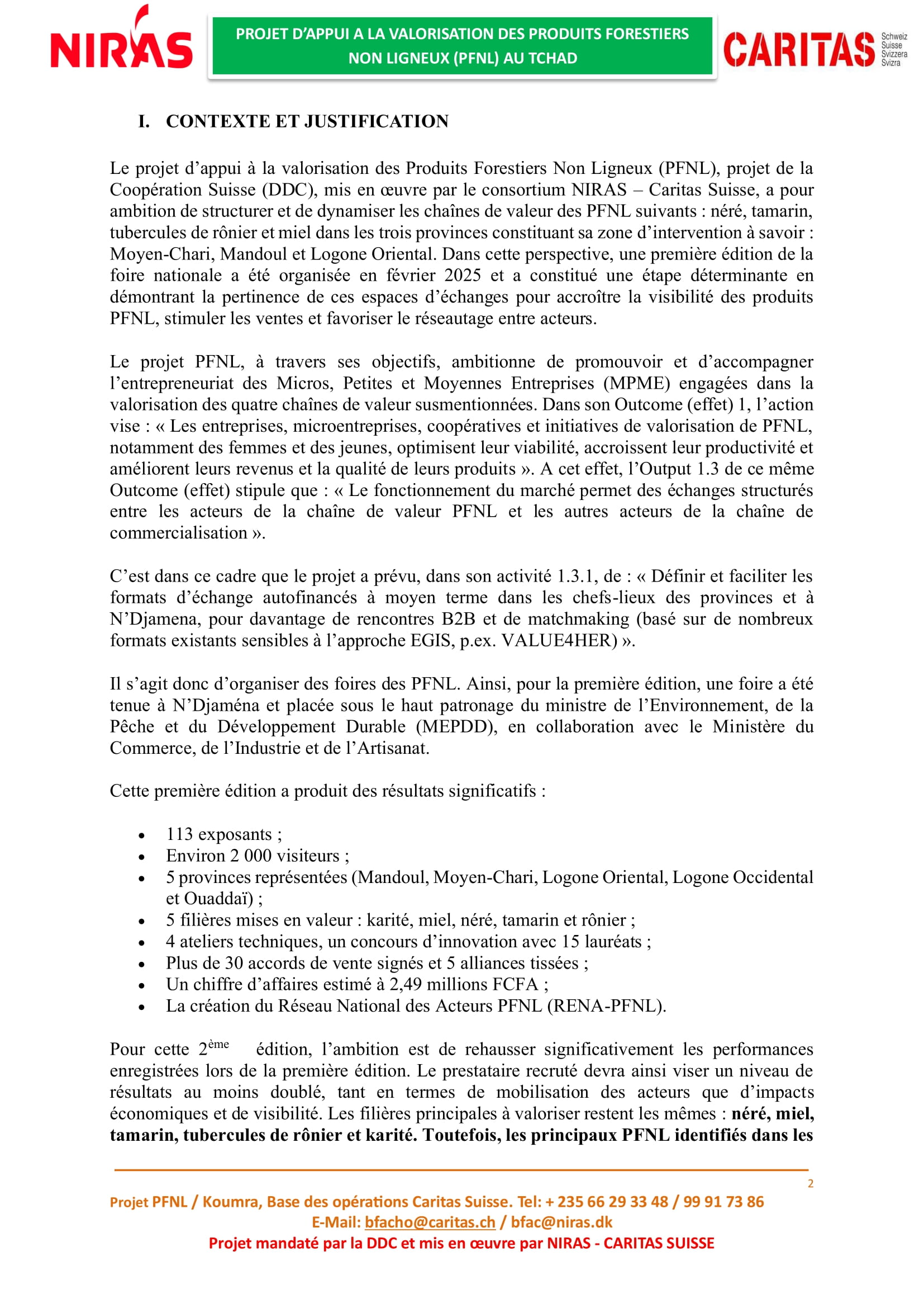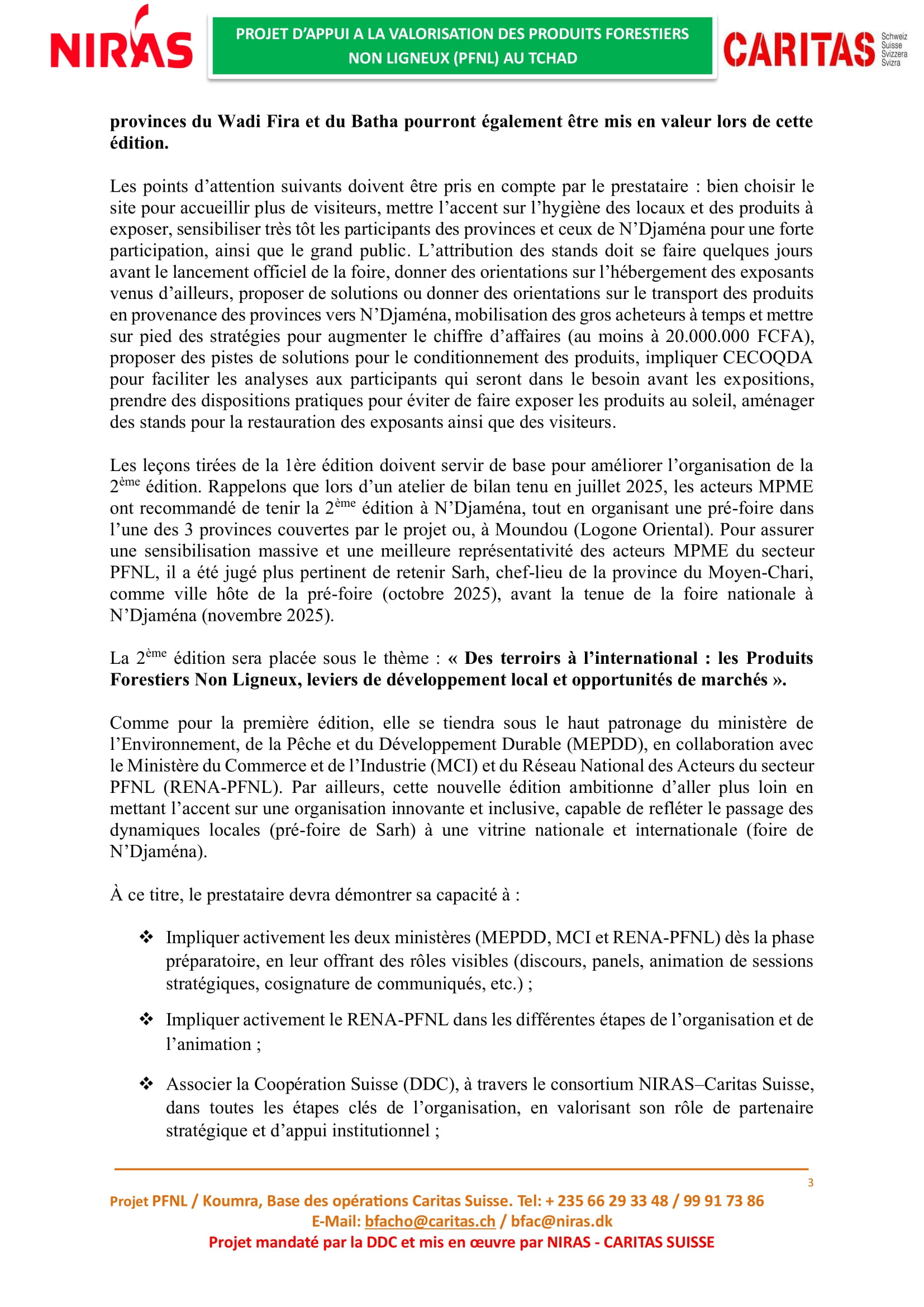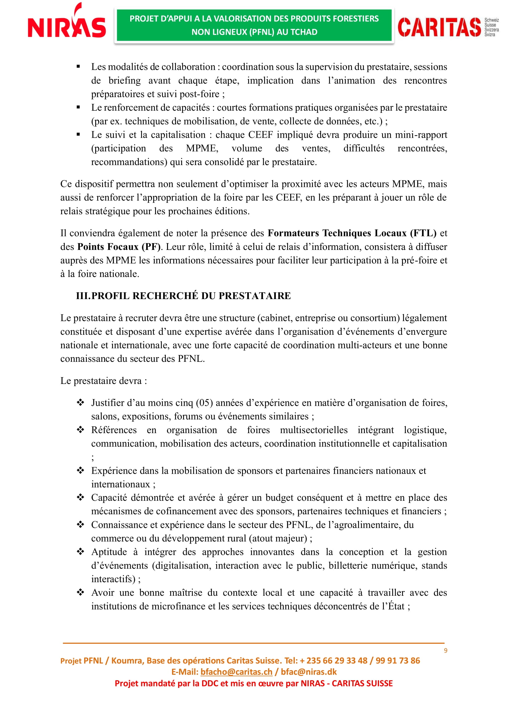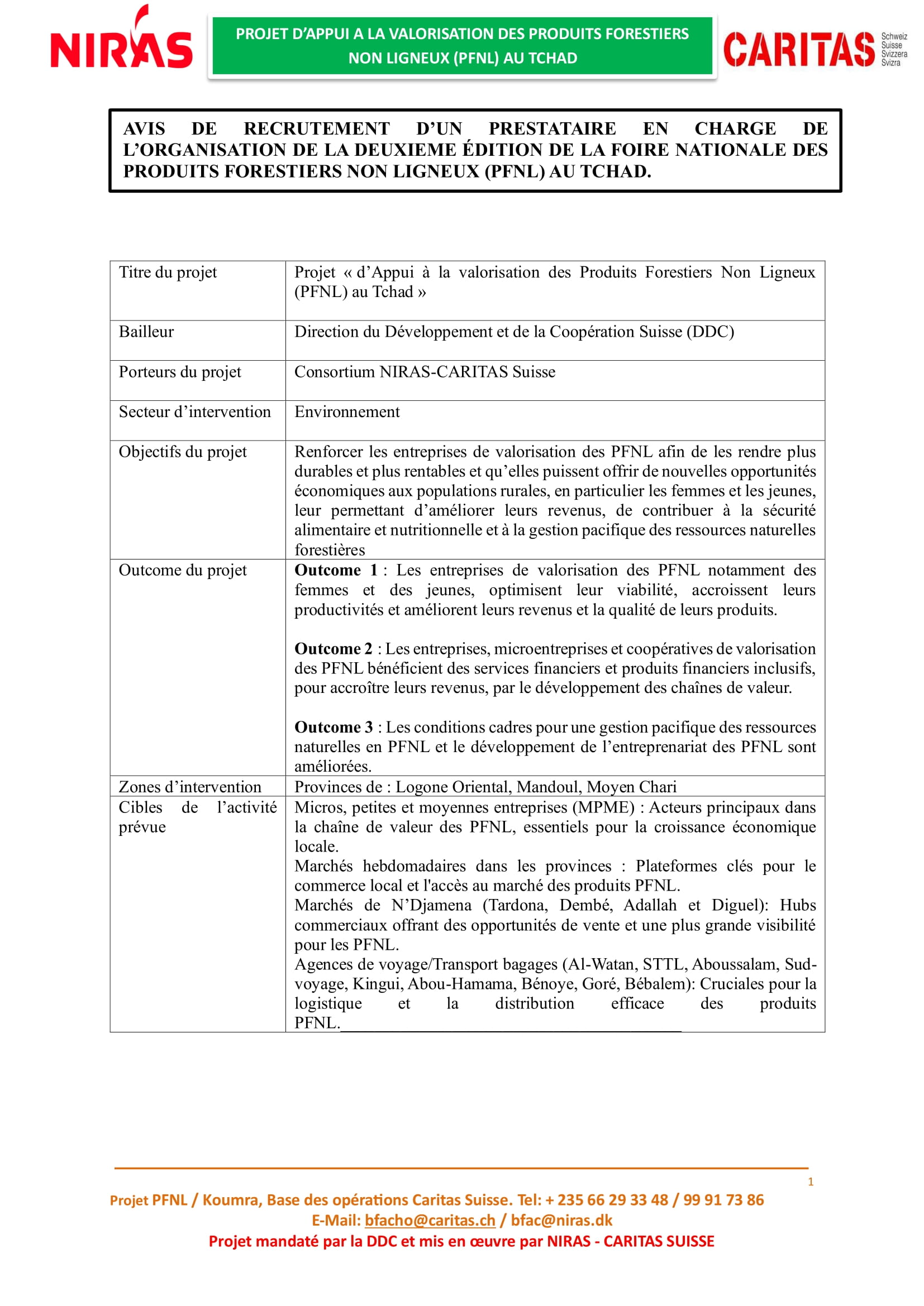 Caritas Suisse recrute un prestataire en charge de l’organisation de la deuxième édition de la foire nationale des Produits Forestiers Non Ligneux (PFNL), Tchad