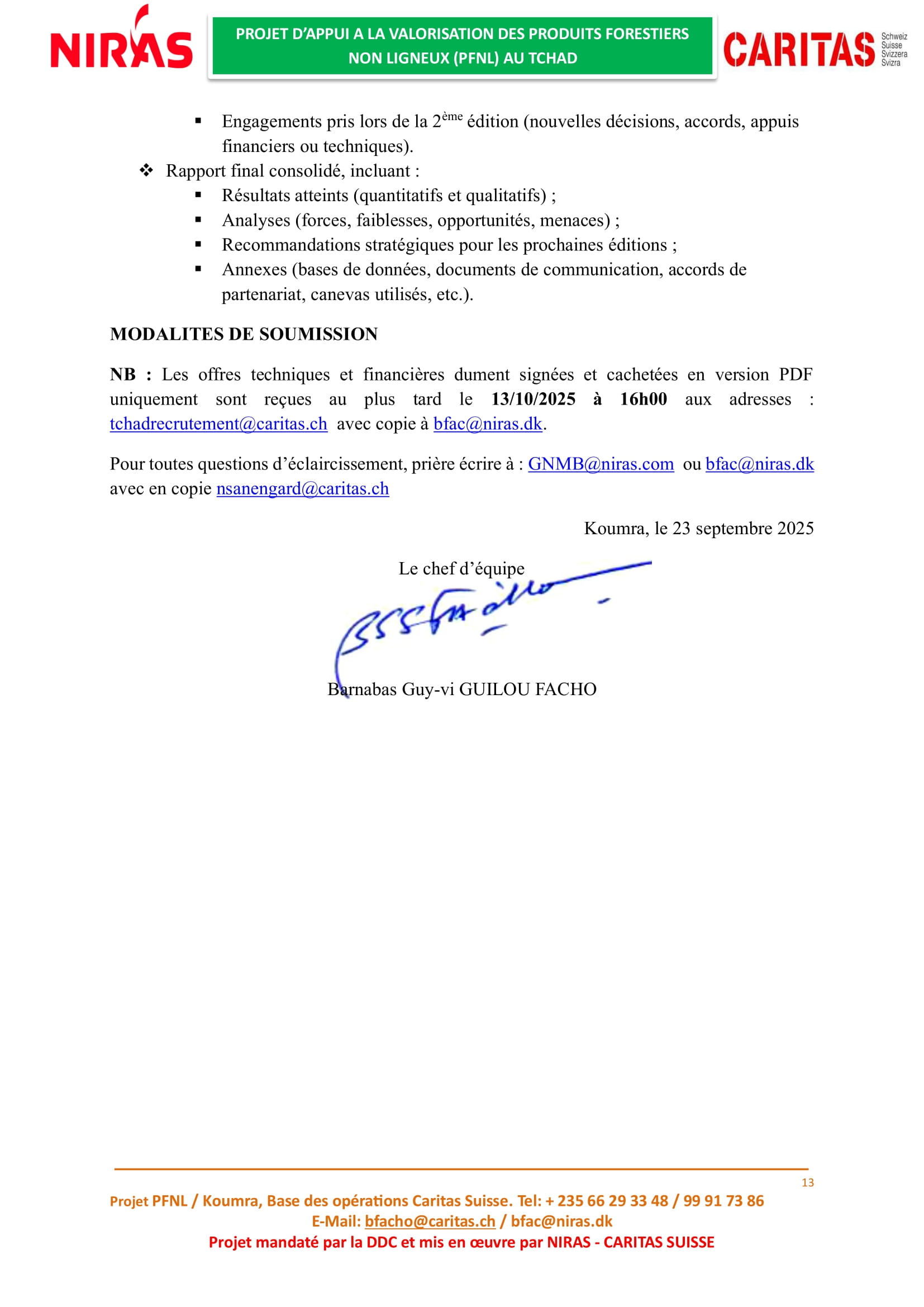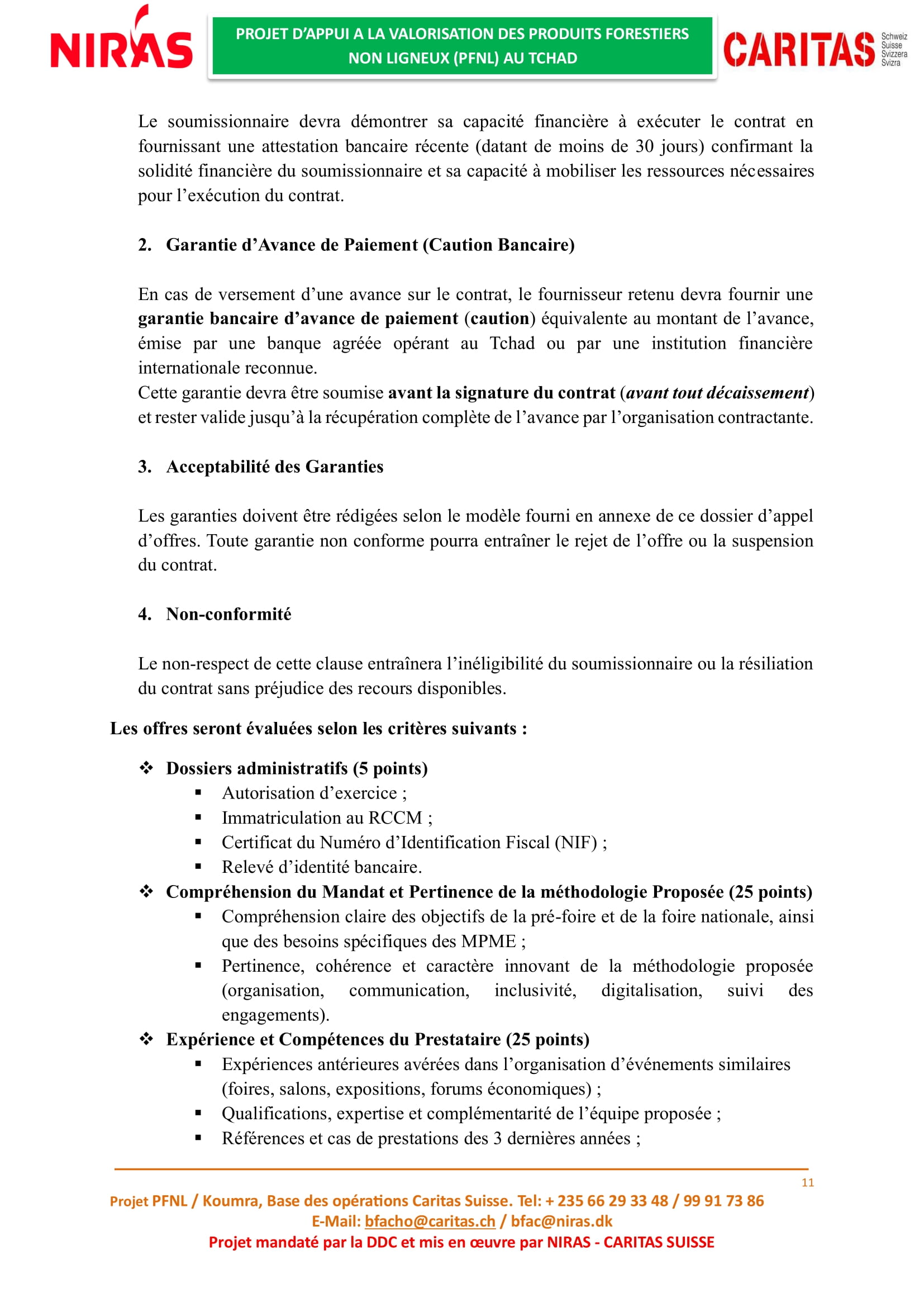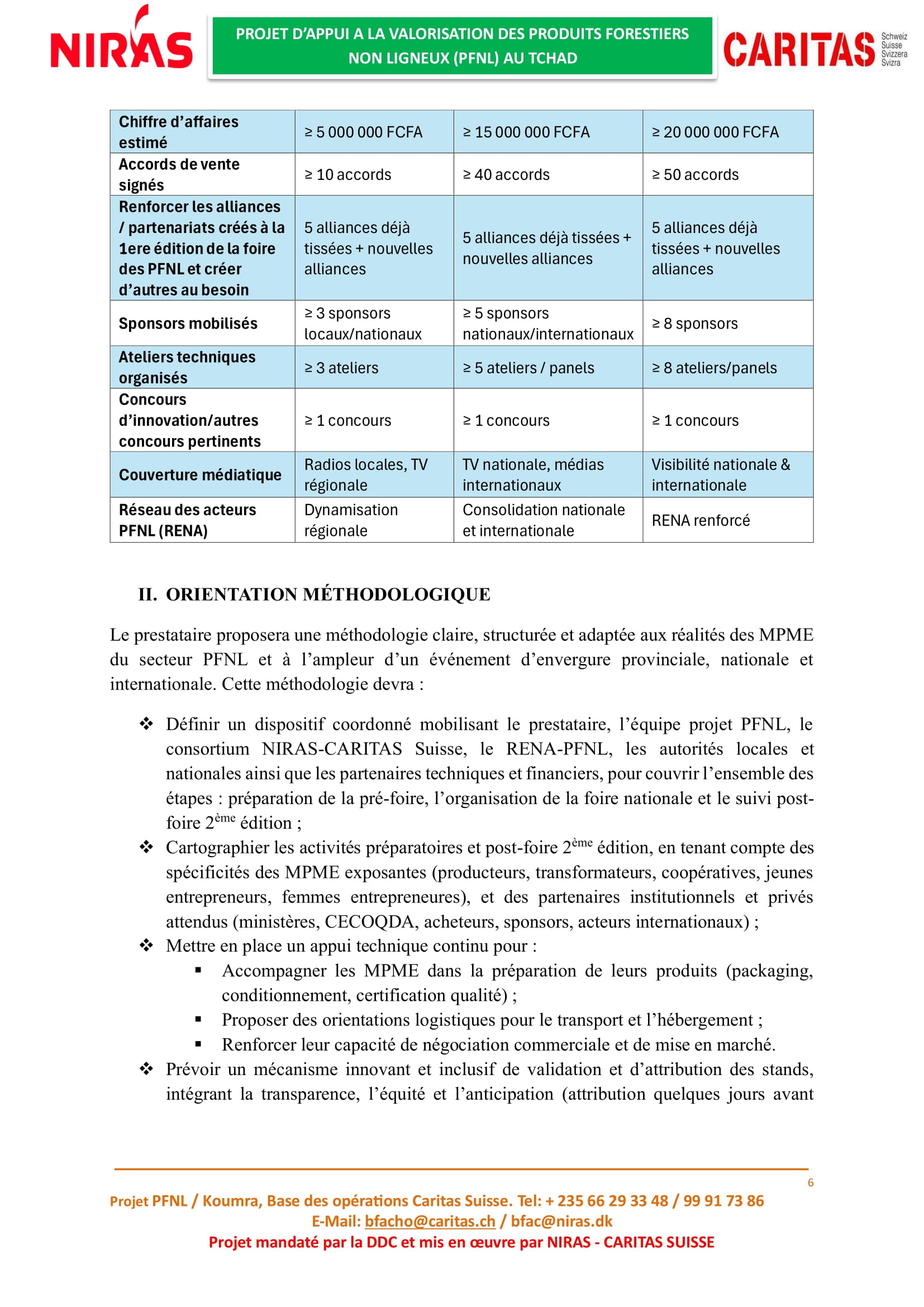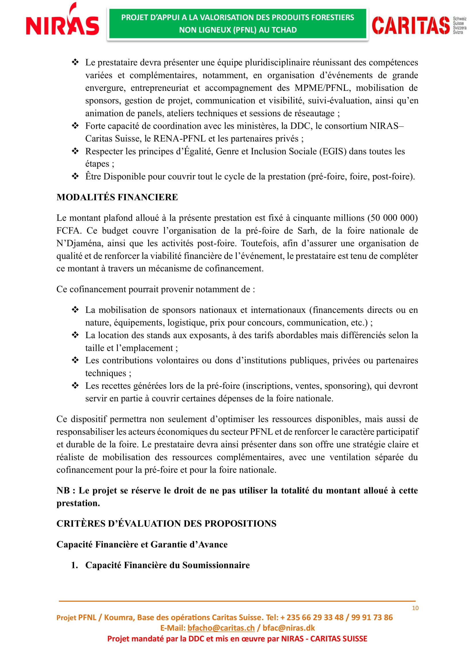 Caritas Suisse recrute un prestataire en charge de l’organisation de la deuxième édition de la foire nationale des Produits Forestiers Non Ligneux (PFNL), Tchad