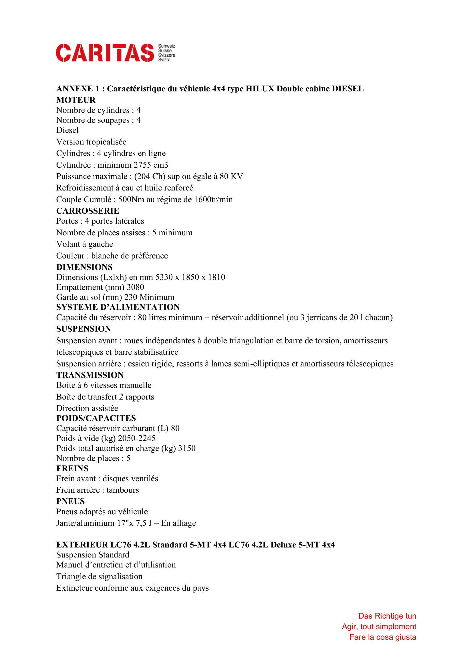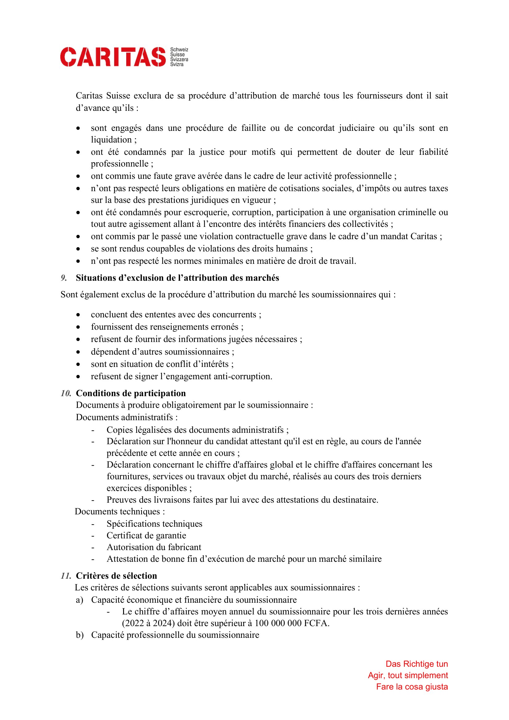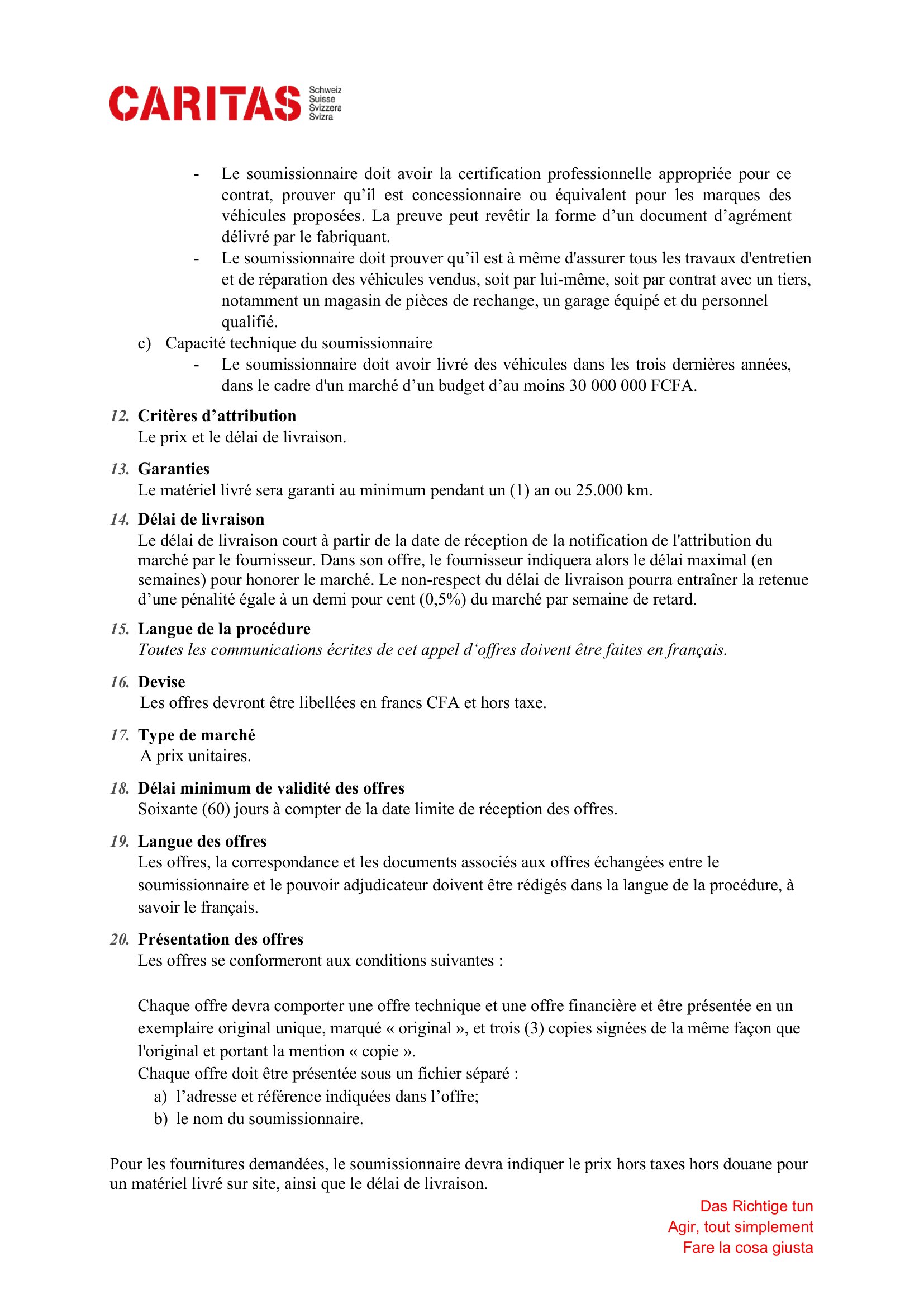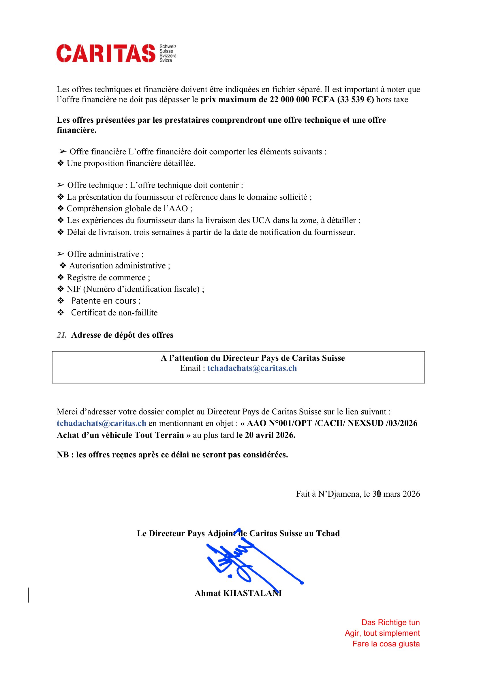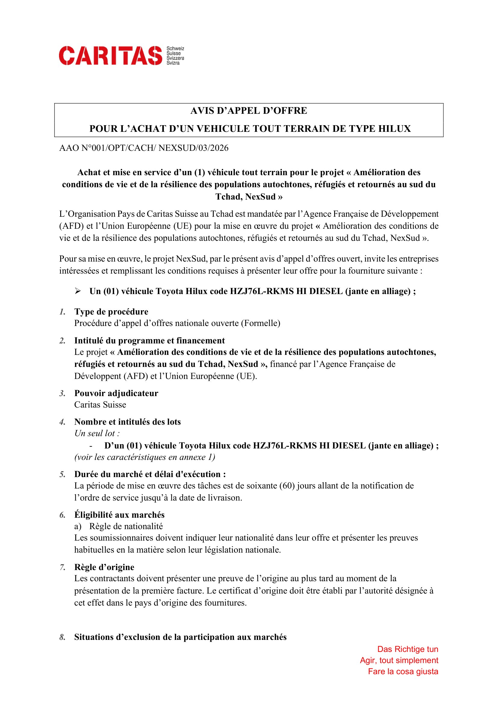 Caritas Suisse, dans la mise en œuvre du projet NexSud, lance un avis d’appel d’offre pour l’achat d’un véhicule tout terrain de type Hilux, Tchad Avr 1, 2026 Caritas Suisse, dans la mise en œuvre du projet NexSud, lance un avis d’appel d’offre pour l’achat d’un véhicule tout terrain de type Hilux, Tchad Share on FacebookTweetFollow usSaveAppel à candidatures pour les bourses d’études à l’Université de Qingdao, ChineOXFAM recrute un chargé santé et droits sexuels reproductifs (SDSR) AMC PRESYS (H/F), Bagasola, Tchad L’association Noé recrute un/e Chargé des Infrastructures, Binder-Léré, TchadL’ONG Suisse Enfants du Monde lance un avis d’appel d’offres national pour la sélection de huit (8) opérateurs chargés de réaliser les activités d’alphabétisation et d’éducation de base non formelle dans les provinces du Logone Oriental, du Mandoul, du Ouaddaï et de Wadi Fira, Tchad