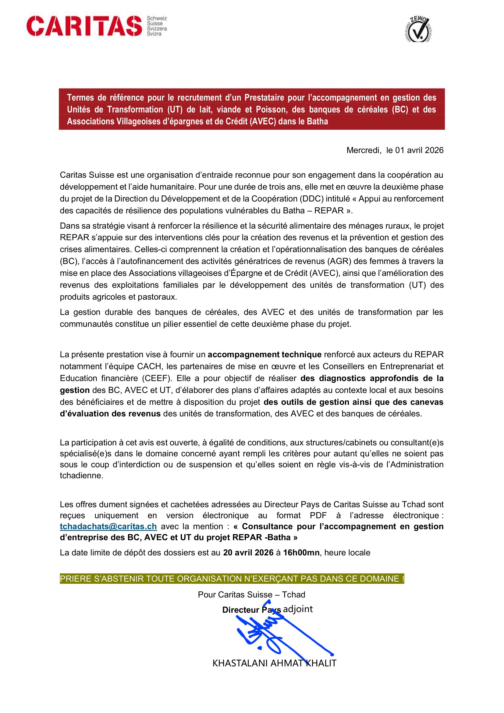 Caritas Suisse lance un avis d’appel d’offre pour le recrutement d’un prestataire pour l’accompagnement en gestion des Unités de Transformation (UT) de lait, viande et poisson, des banques de céréales (BC) et des Associations Villageoise d’épargnes et de crédit (AVEC), Batha, Tchad