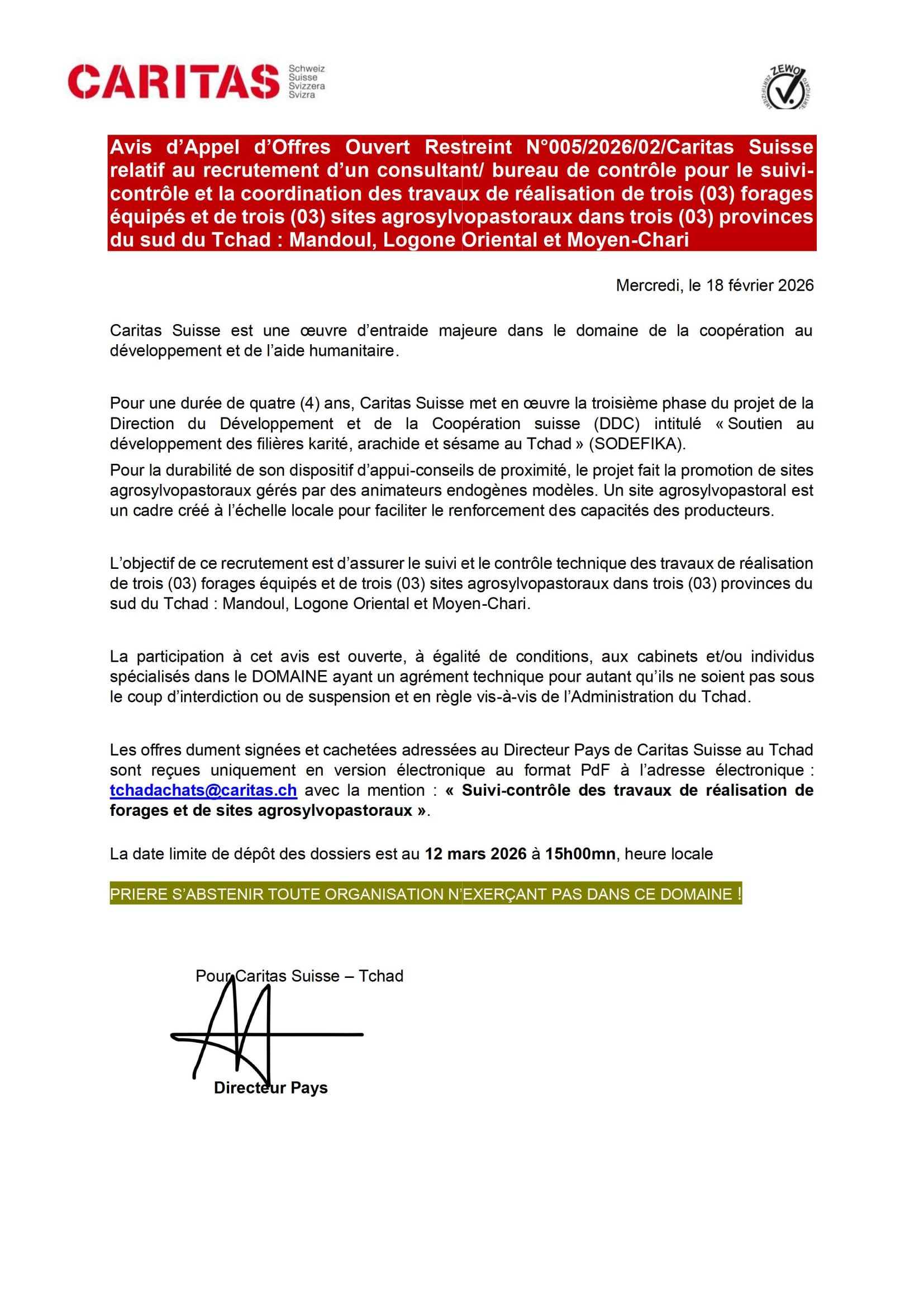 Caritas Suisse lance un avis d’appel d’offres pour le recrutement d’un Consultant/bureau de contrôle pour le suivi-contrôle et la coordination des travaux de réalisation de trois (03) forages équipés de trois (03)) sites agrosylvopastoraux, Logone Oriental Mandoul, Moyen Chari, Tchad