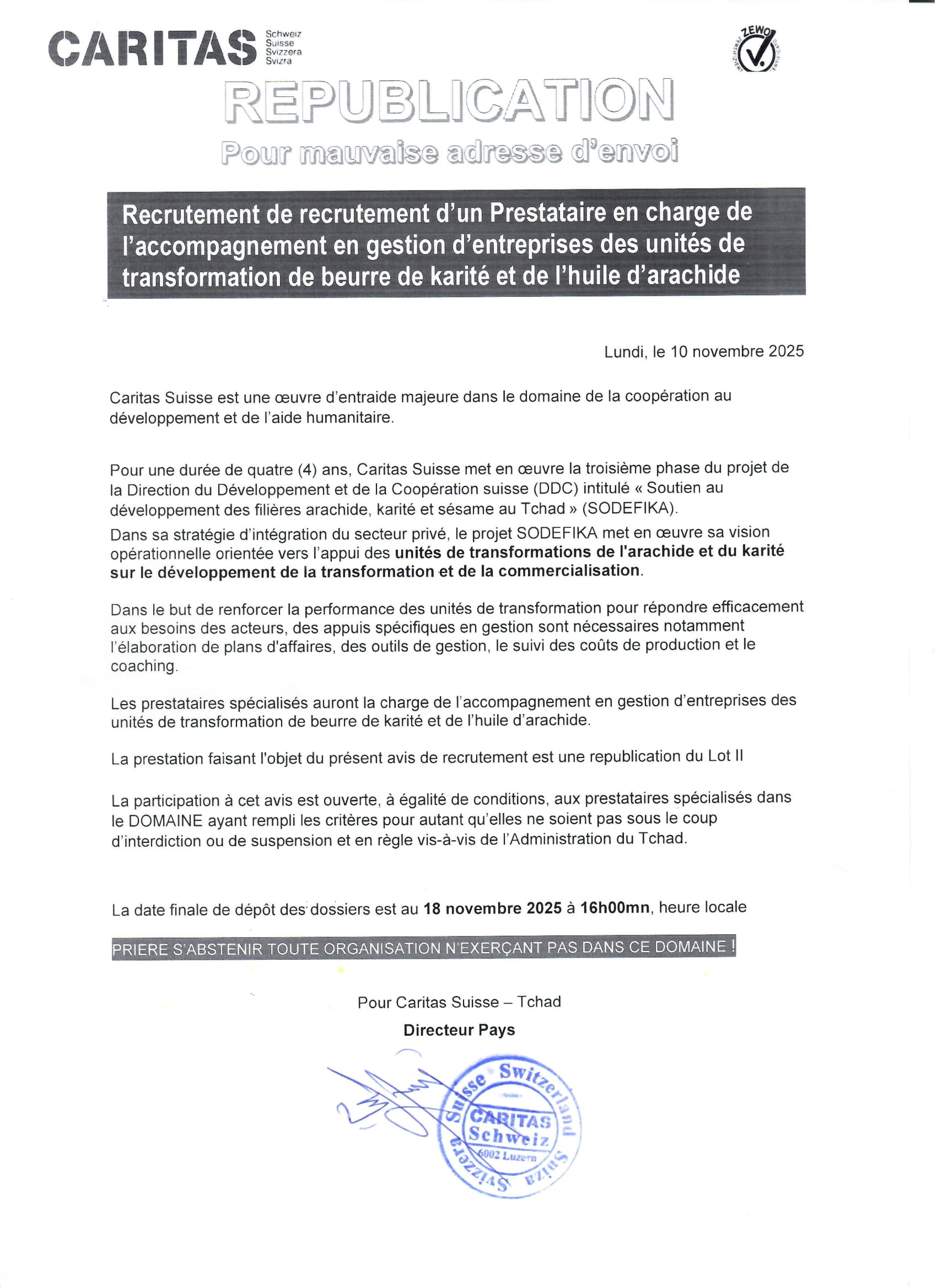Caritas Suisse recrute un prestataire en charge de l’accompagnement en gestion d’entreprises des unités de transformation de beurre de karité et de l’huile d’arachide, Tchad