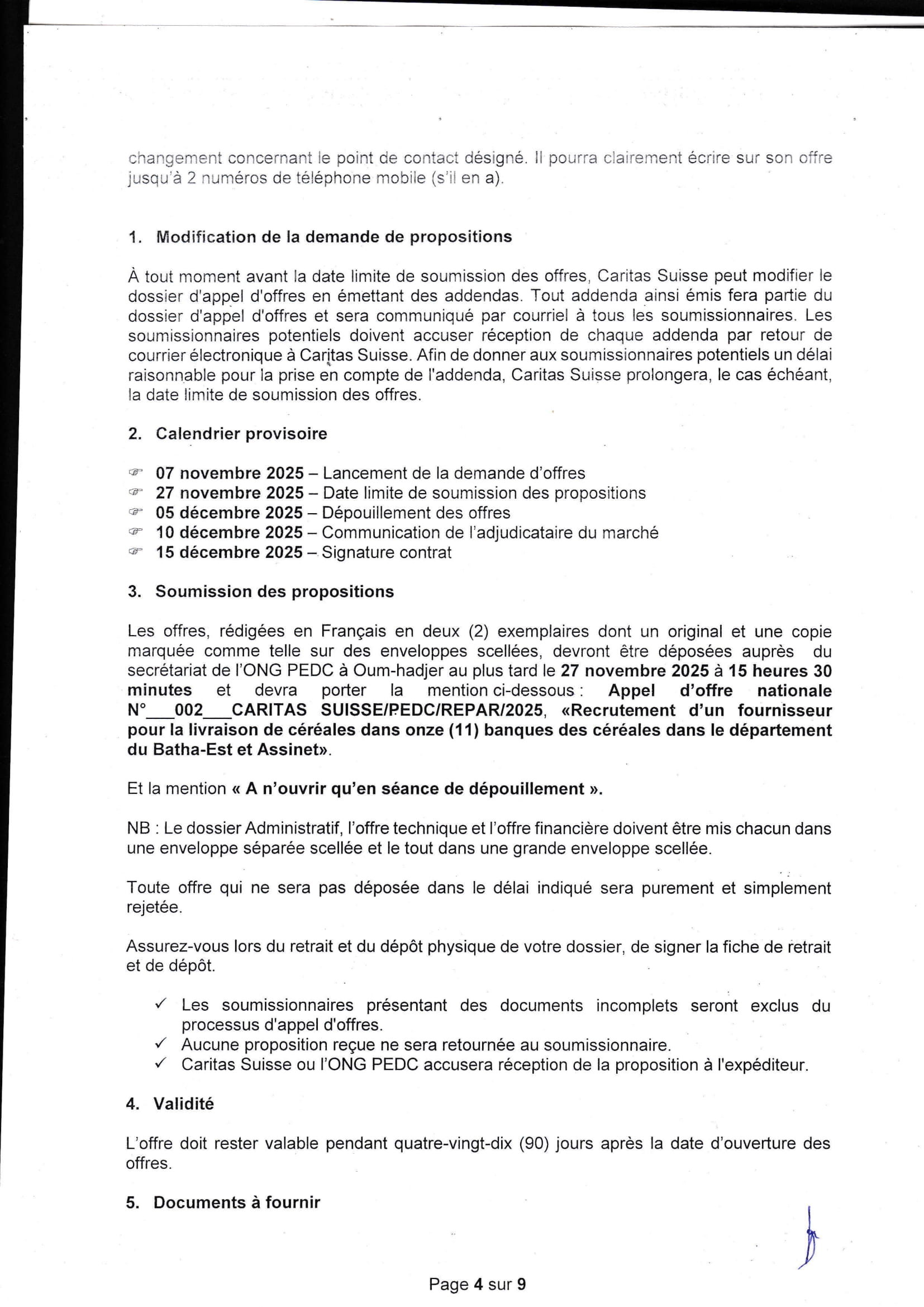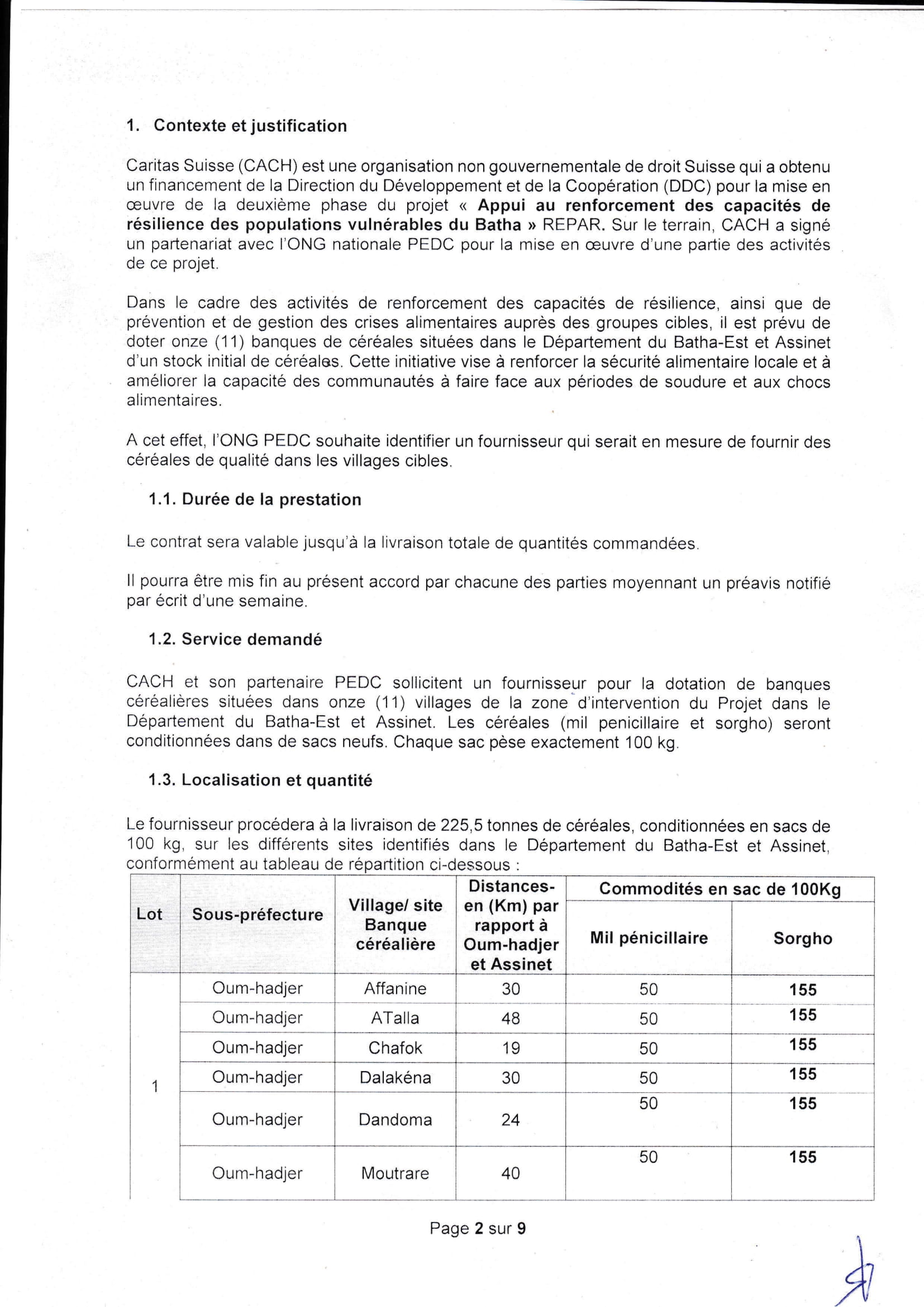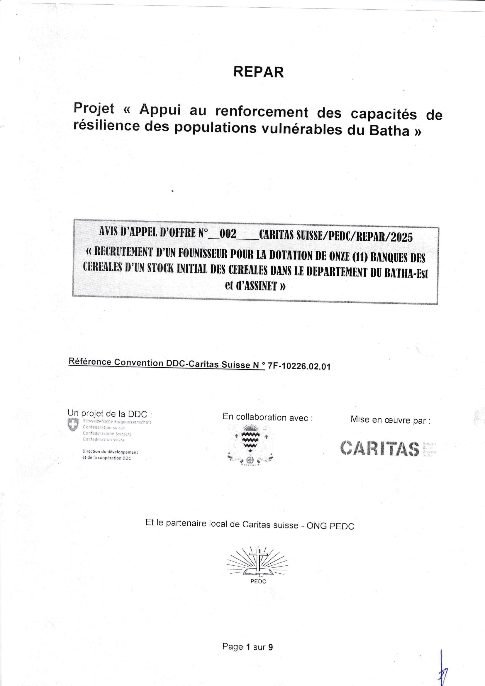 Caritass Suisse lance un appel d’offre pour le recrutement d’un fournisseur pour la livraison de céréales dans 11 banques, Batha Est et Assinet , Tchad