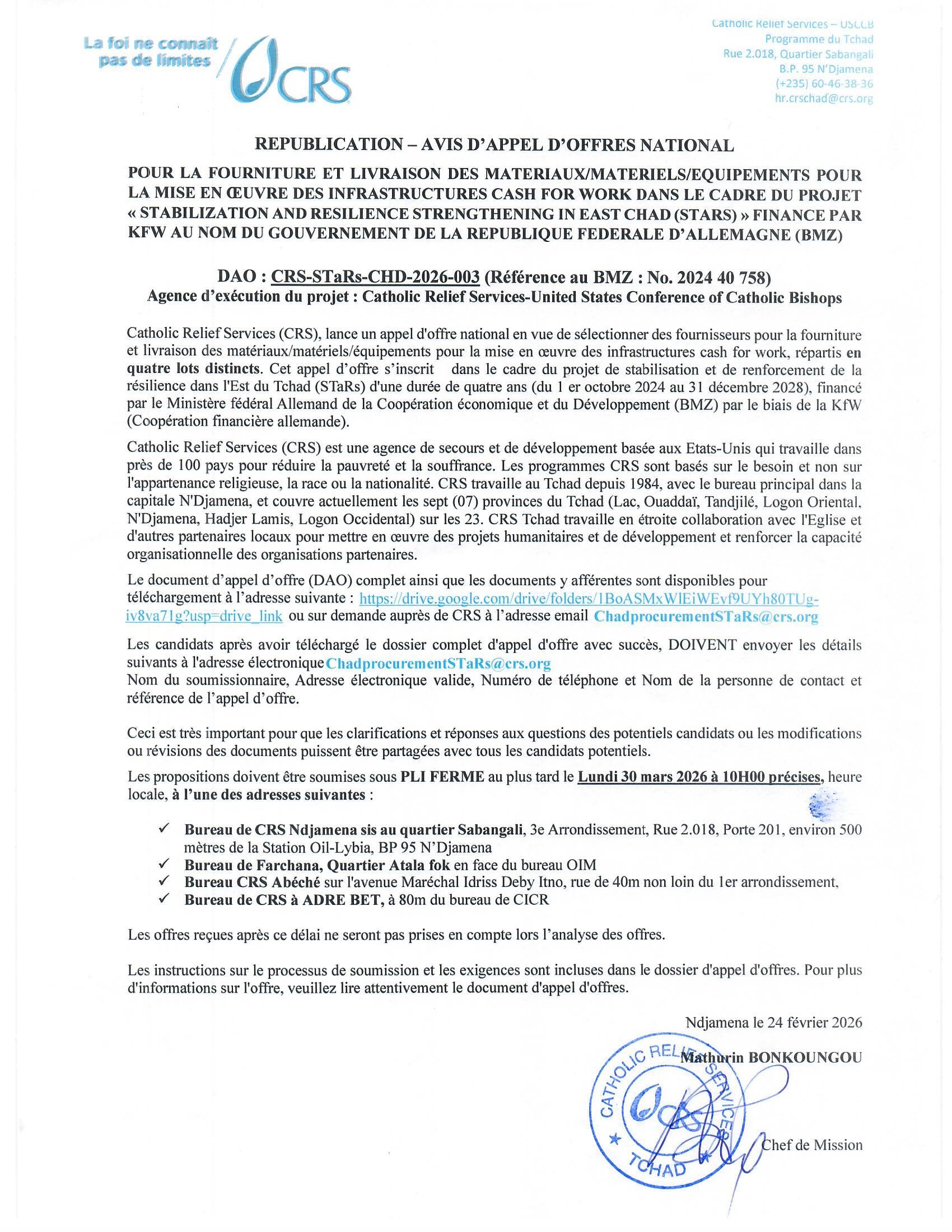 Catholic Relief Services (CRS) annonce la republication de l’avis d’appel d’offres national pour la sélection des fournisseurs pour la fourniture et livraison des matériaux/ matériels/ équipements pour la mise en œuvre des infrastructures cash for work, répartis en quatre lots distincts