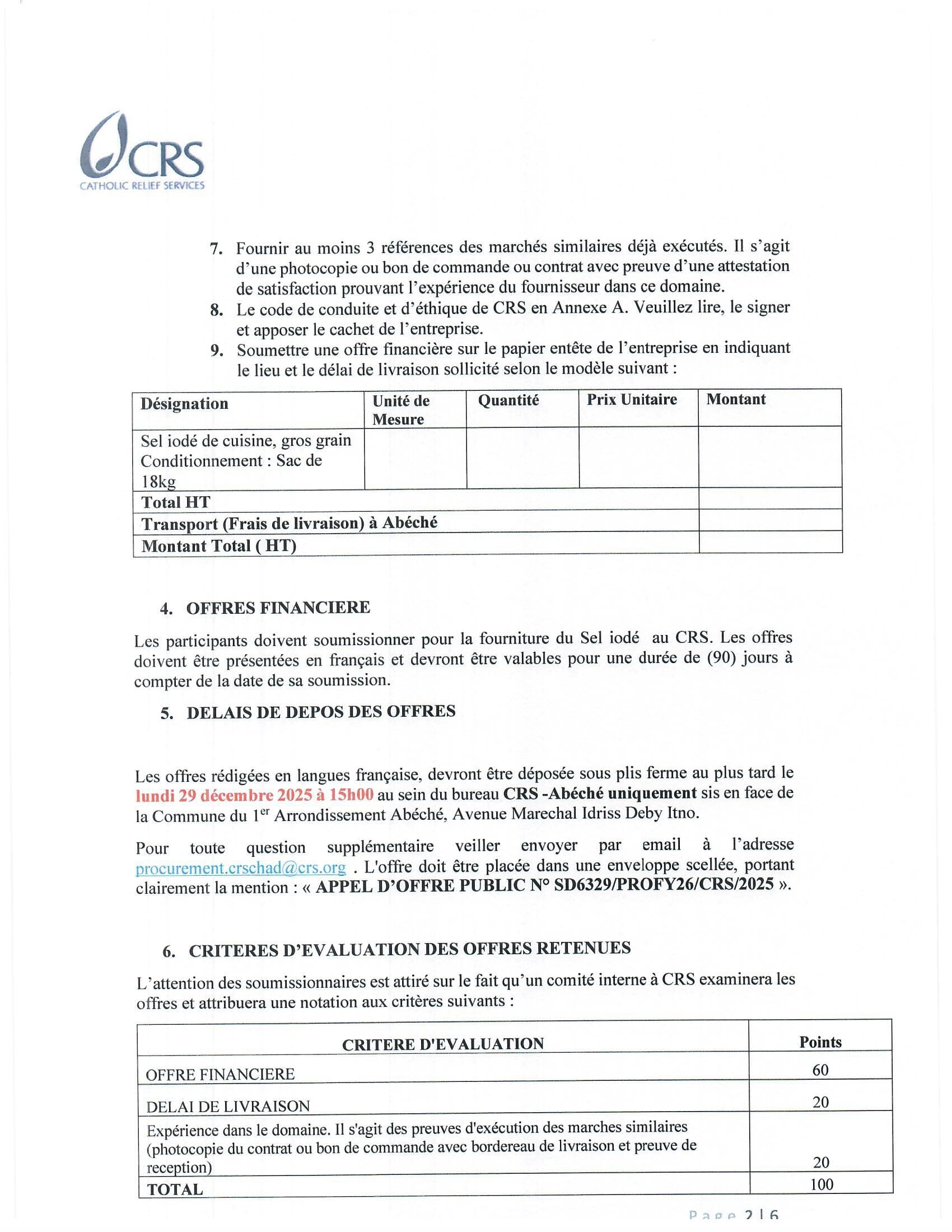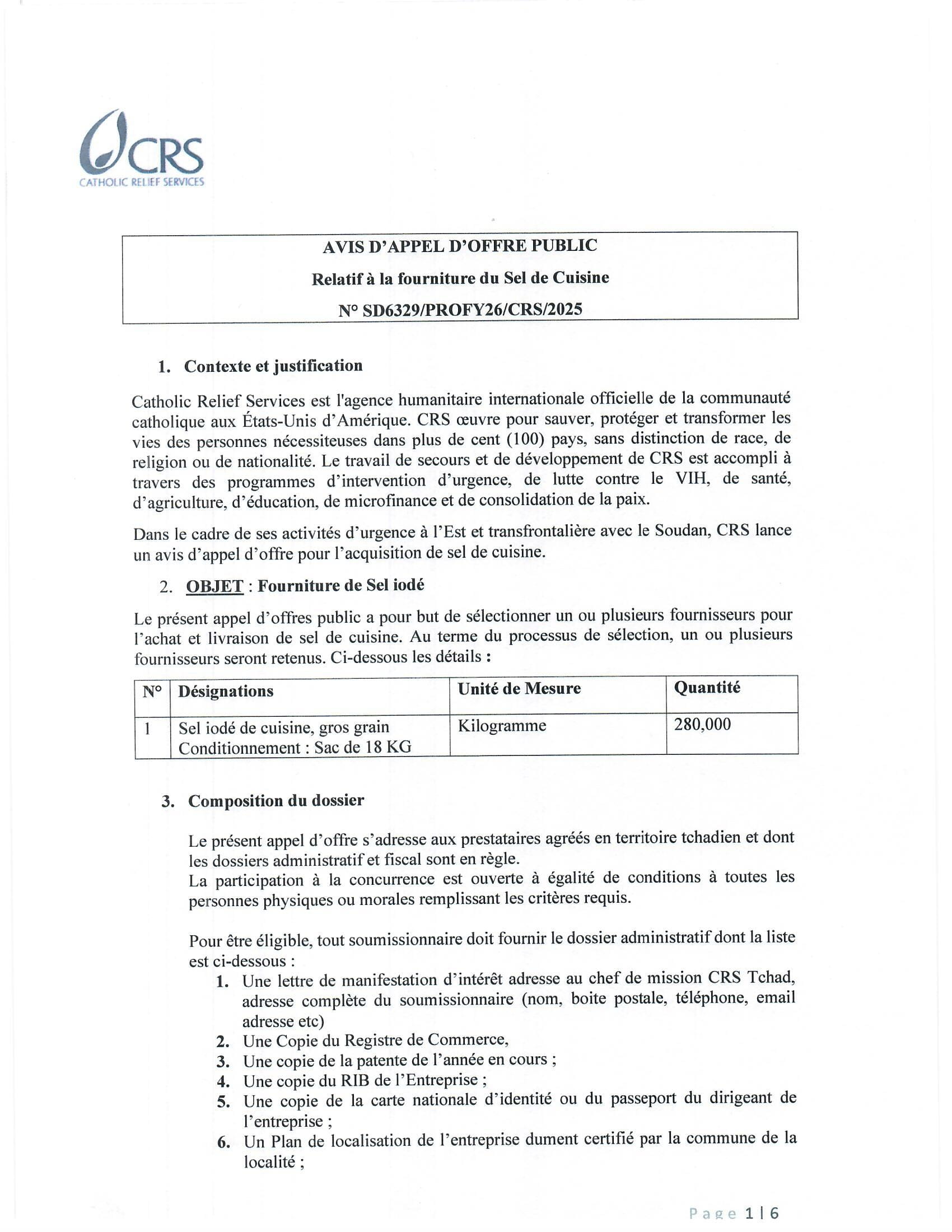 Catholic Relief Services (CRS) lance un avis d’appel d’offre public relatif à la fourniture du sel de cuisine, Abéché, Tchad Déc 16, 2025 Catholic Relief Services (CRS) lance un avis d’appel d’offre public relatif à la fourniture du sel de cuisine, Abéché, Tchad Share on FacebookTweetFollow usSaveGIZ recrute un conseiller(e) en gouvernance locale, Moundou, TchadCICR recrute deux comptables (H/F) basé(e)s à Adré/Bagasola, TchadUNICEF recrute un(e) Chargé(e) de programme Nutrition, Bol, TchadSolidaridad West Africa lance un avis de recrutement externe de Gestionnaire de centre de service rural Moundou ou Kelo, Tchad