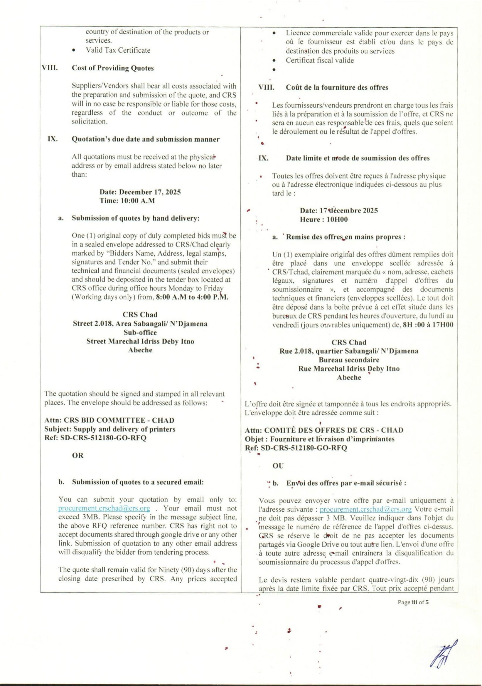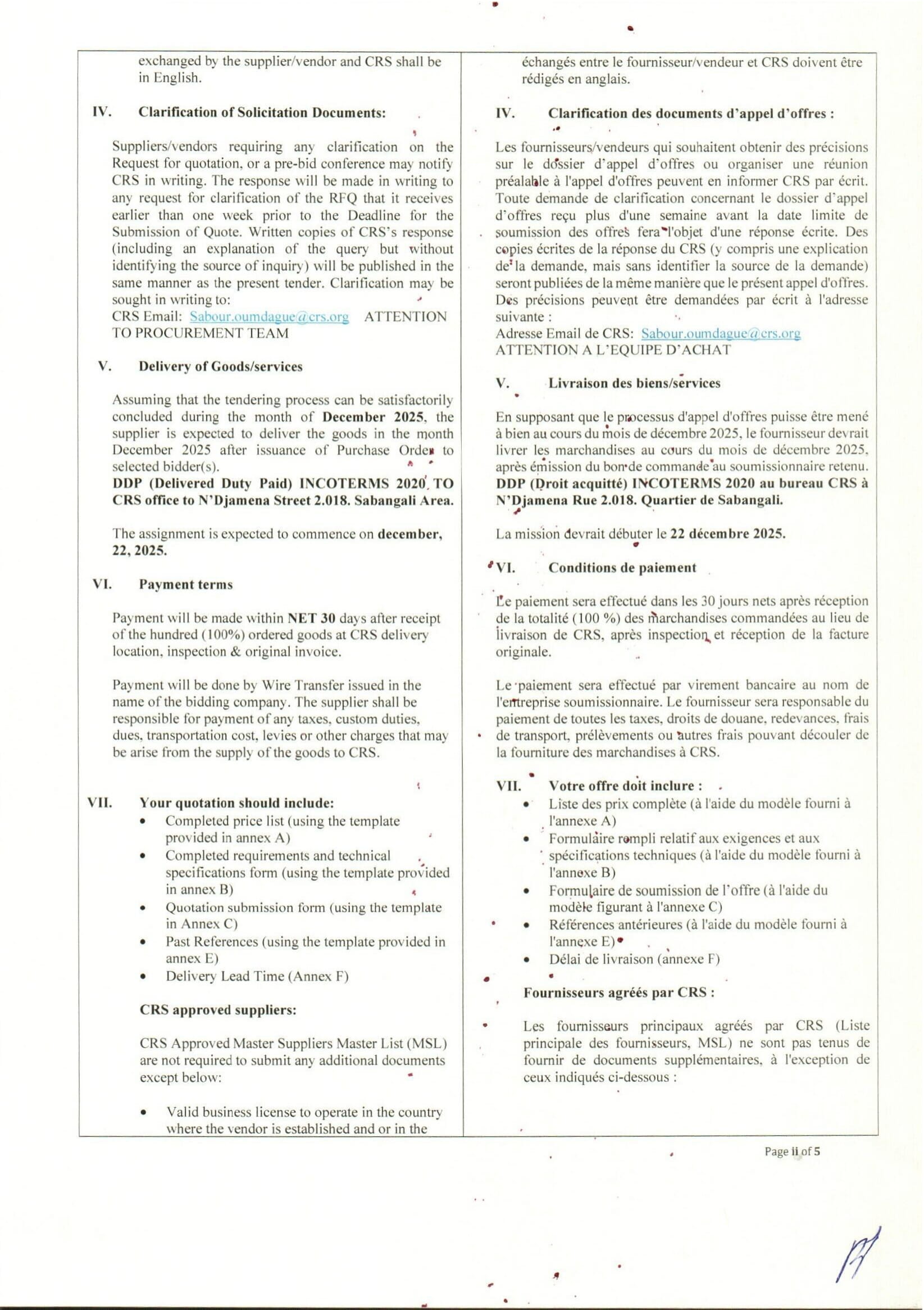 Catholic Relief Services (CRS) lance un avis d’appel d’offres pour la fourniture et la livraison de neuf imprimantes, N’Djamena, Tchad Déc 5, 2025 Catholic Relief Services (CRS) lance un avis d’appel d’offres pour la fourniture et la livraison de neuf imprimantes, N’Djamena, Tchad Share on FacebookTweetFollow usSaveLe Groupe accueil et solidarité (GAS) recrute un stagiaire accompagnement juridique des réfugiés et demandeurs d’asile vers le logement, Villejuif, FranceOXFAM recrute un coordinateur influence, campagnes et engagement citoyen (H/F), N’Djamena, TchadInternational Rescue Committee lance un avis d’appel d’offre pour la sélection d’un cabinet d’étude pour réaliser une étude d’évaluation de GAPS de couverture des besoins dans la zone d’intervention du programme respect, N’Djamena, Tchad Avis de formation pour l’obtention de la certification en techniques bancaires et financières : 100% en ligne