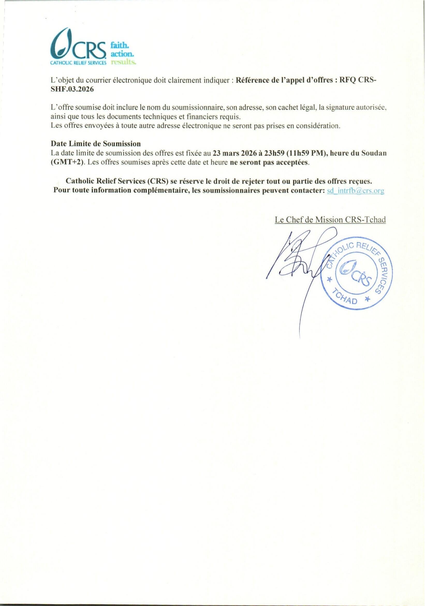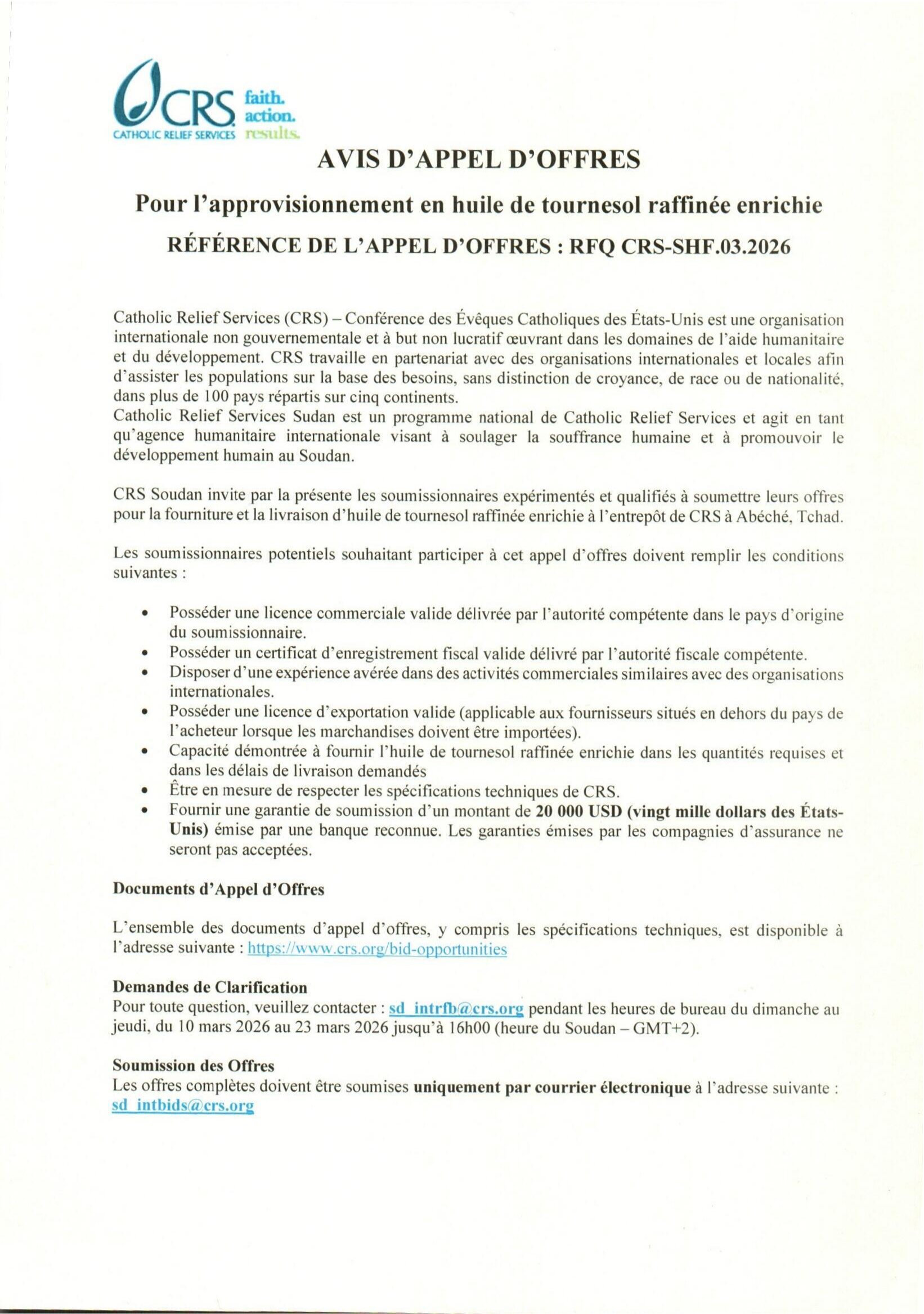 Catholic Relief Services (CRS) lance un avis d’appel d’offres pour l’approvisionnement en huile de tournesol raffinée enrichie, Tchad Mar 10, 2026 Catholic Relief Services (CRS) lance un avis d’appel d’offres pour l’approvisionnement en huile de tournesol raffinée enrichie, Tchad Share on FacebookTweetFollow usSaveCRS recrute un chargé de projet restauration des terres (H/F), Bol, TchadLe Réseau Accès aux Médicaments Essentiels (RAME) lance un appel à candidatures pour le recrutement d’un(e) stagiaire en Suivi-évaluation et gestion des données, Ouagadougou, Burkina FasoCEFOREP SARL organise une formation sur le suivi et évaluation des projets, Kobo collect et SPSS, N’Djamena, Tchad Acted recrute un stagiaire en contrôle de gestion, Paris, France