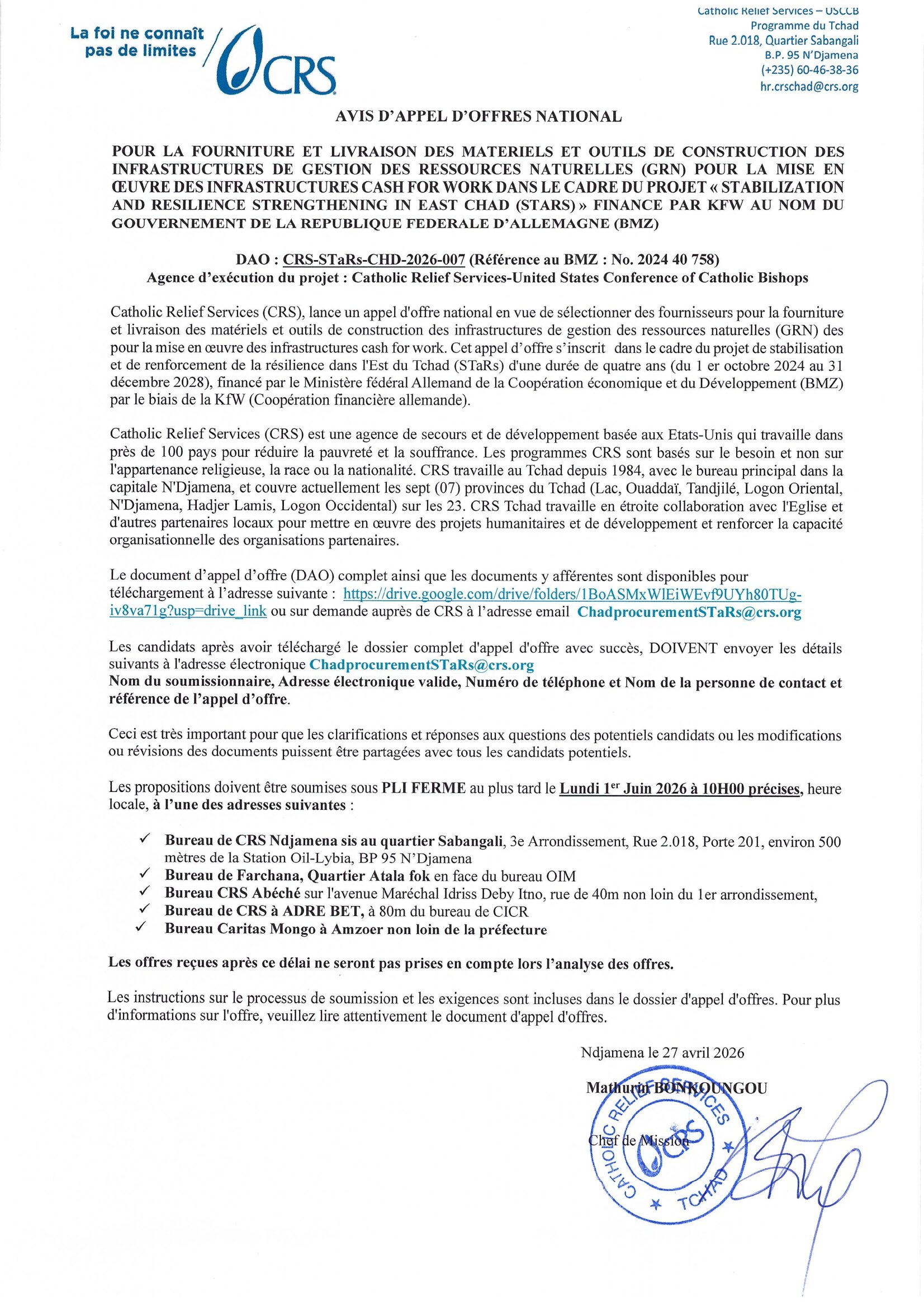 Catholic Relief Services lance un avis d’appel d’offre pour la fourniture et livraison des matériels et outils de construction des infrastructures de gestion des ressources naturelles (GRN) pour la mise en œuvre des infrastructures cash for work