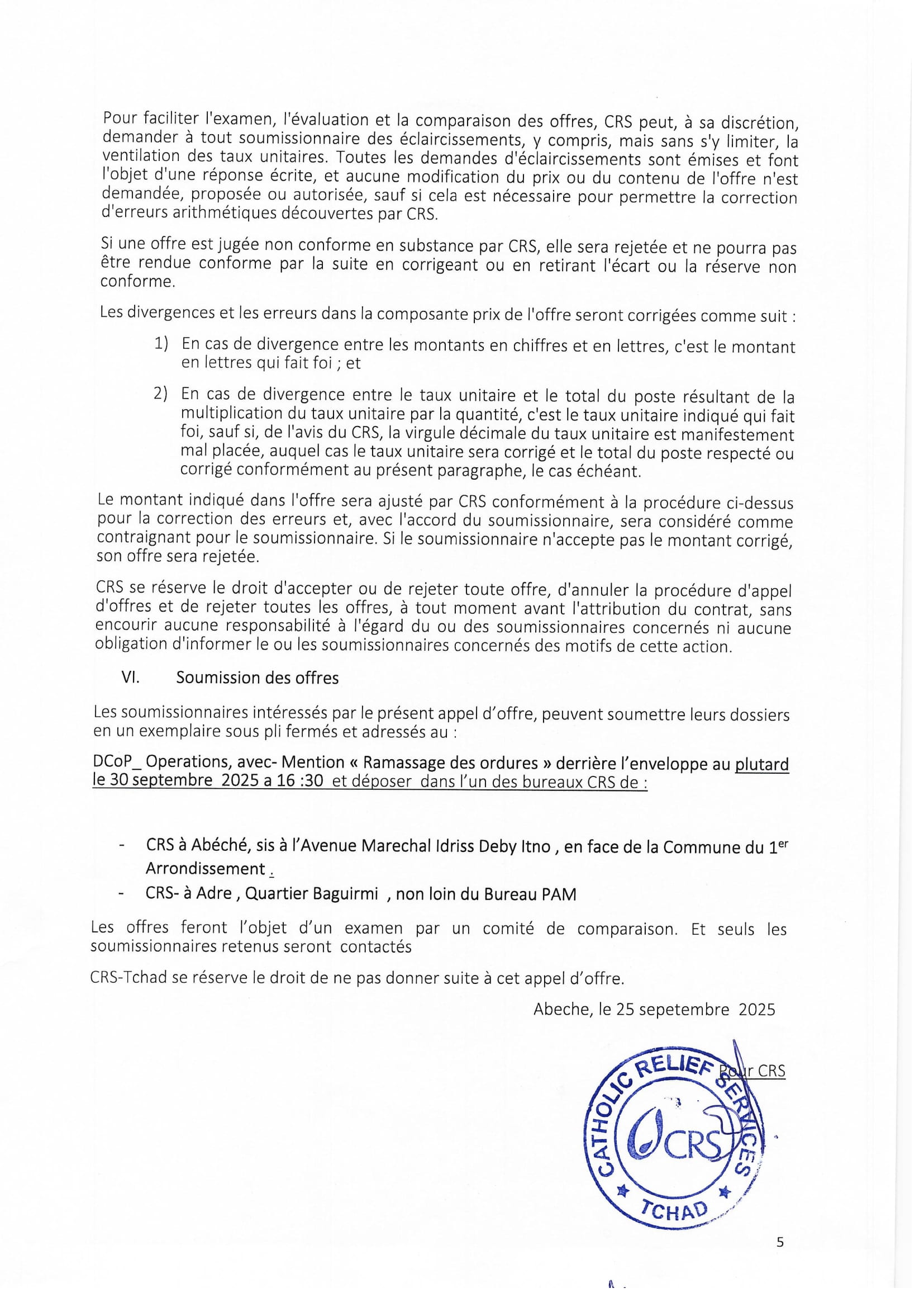 Catholic Relief Services lance un avis d’appel d’offre pour la prestation de service de ramassages des ordures, Abéché, Adré, Tchad Sep 29, 2025 Catholic Relief Services lance un avis d’appel d’offre pour la prestation de service de ramassages des ordures, Abéché, Adré, Tchad Share on FacebookTweetFollow usSaveCatholic Relief Services recrute un assistant administratif (H/F), Amzoer, TchadLe Conseil danois pour les réfugiés (DRC) recrute un(e) Stagiaire en consolidation de la paix – Travailleur temporaire, LibyeRecod Solutions IT recrute un stagiaire développeur (H/F), Dakar, SénégalAfrican Parks recrute un(e) Responsable Financier(e), Park National de Zakouma, Tchad
