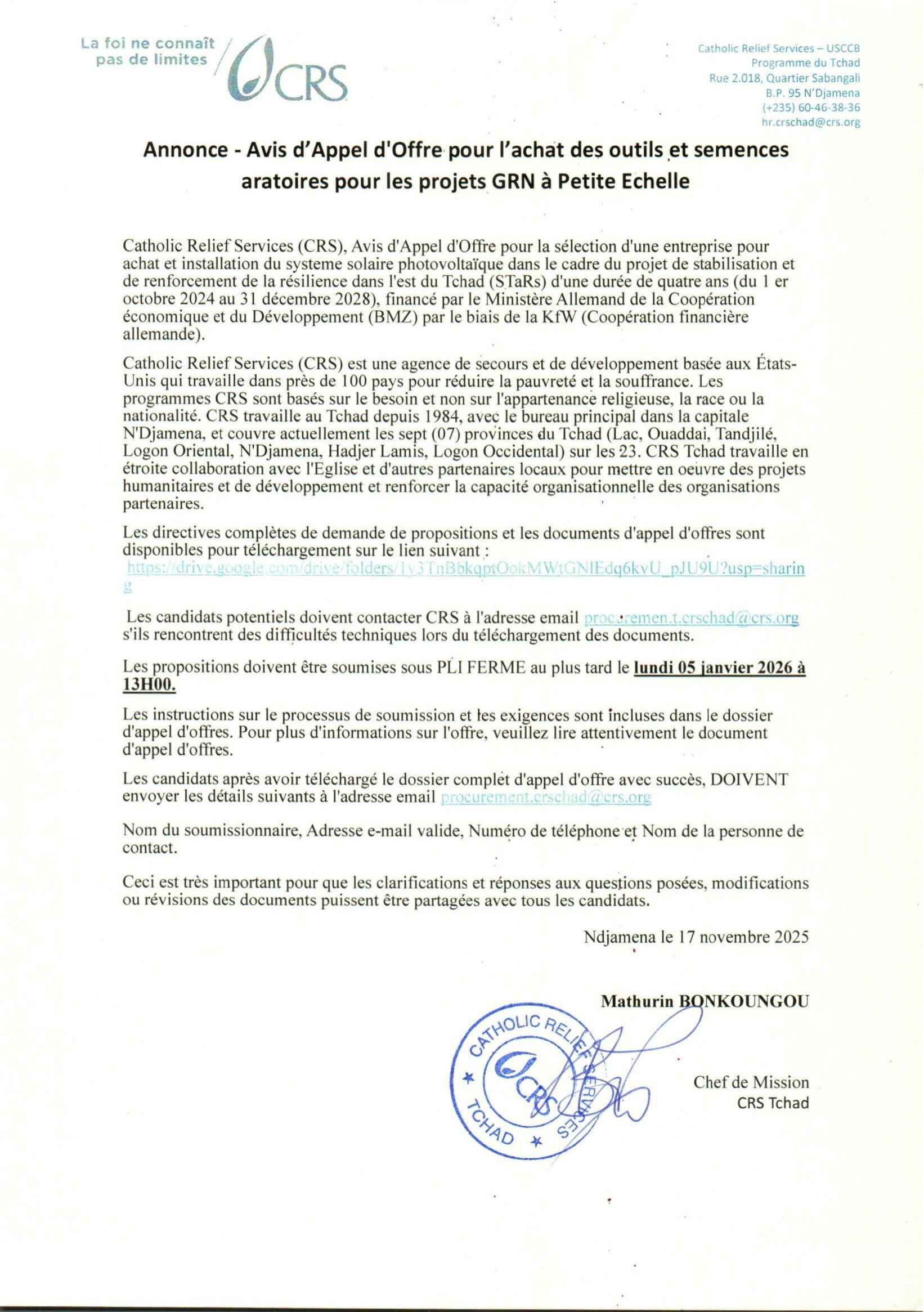 Catholic Relief Services lance un avis d’appel d’offre pour l’achat des outils et semences aratoires, N’Djamena, Tchad Nov 17, 2025 Catholic Relief Services lance un avis d’appel d’offre pour l’achat des outils et semences aratoires, N’Djamena, Tchad Share on FacebookTweetFollow usSaveCOOPI recrute un(e) Administrateur(trice) financier, Sila, TchadConcern Worldwide lance un avis d’appel d’offre pour les travaux de construction infrastructures environnementales volet 1, Tchad Appel à candidature pour les bourses à l’université de Drake aux USA en 2024Republication d’appel d’offre pour la clôture des sites maraichers, projet NexSud, Tchad