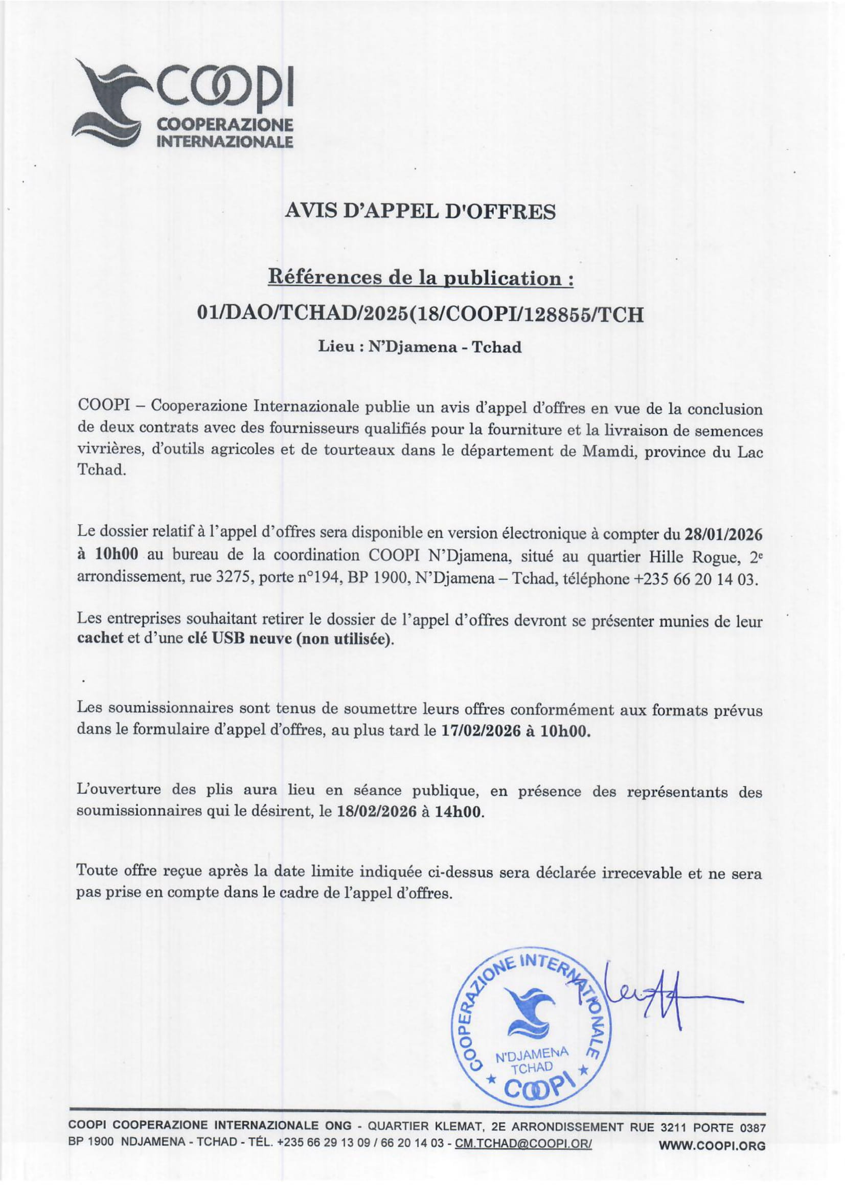 Cooperazione Internazionale (COOPI) lance un avis d’appel d’offres pour la signature de deux contrats avec des fournisseurs qualifiés pour la fourniture et livraison de semences, d’outils agricoles et tourteaux dans le département de Mamdi, Province du Lac Tchad