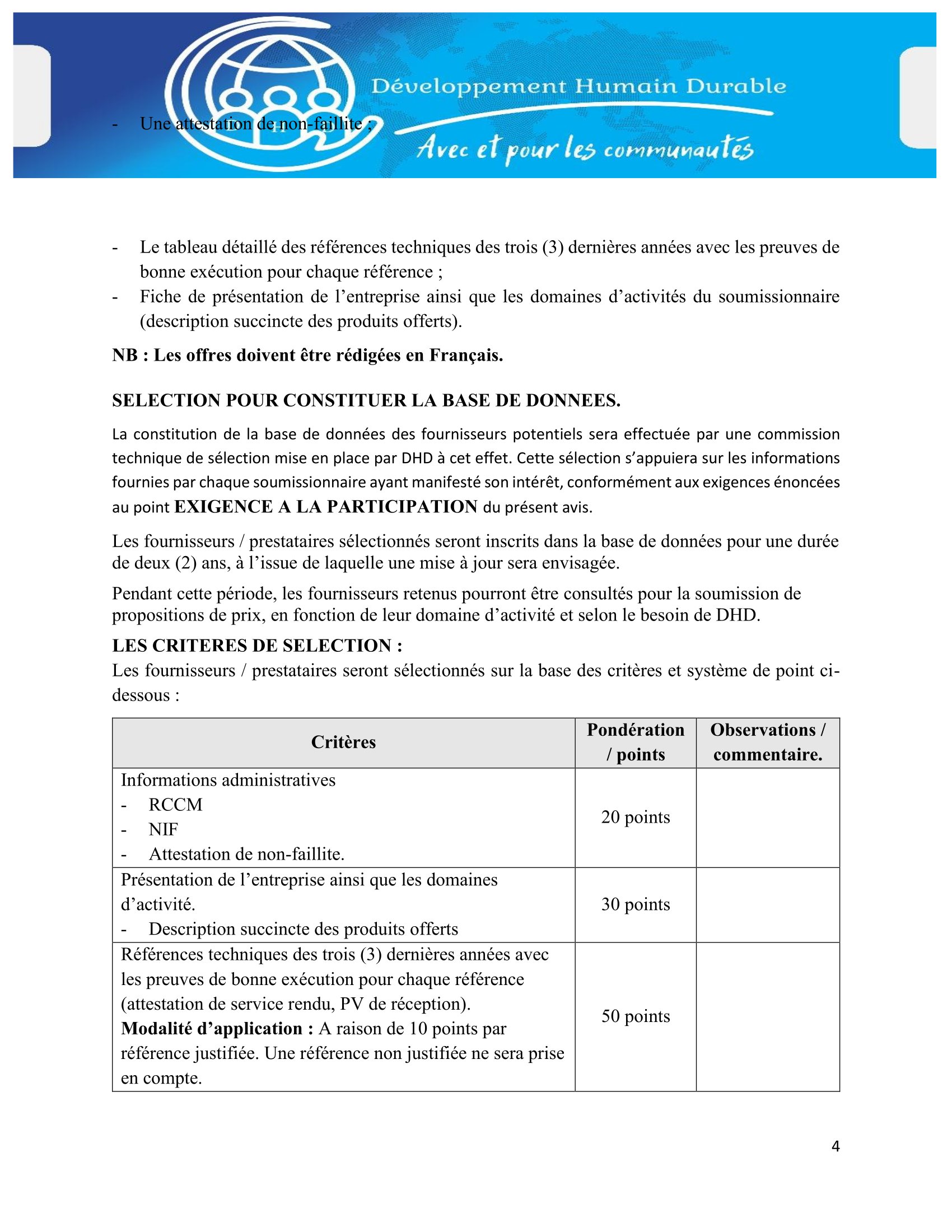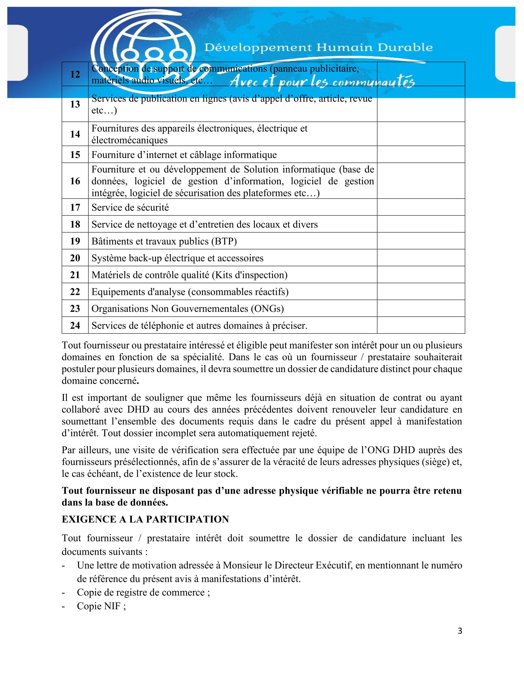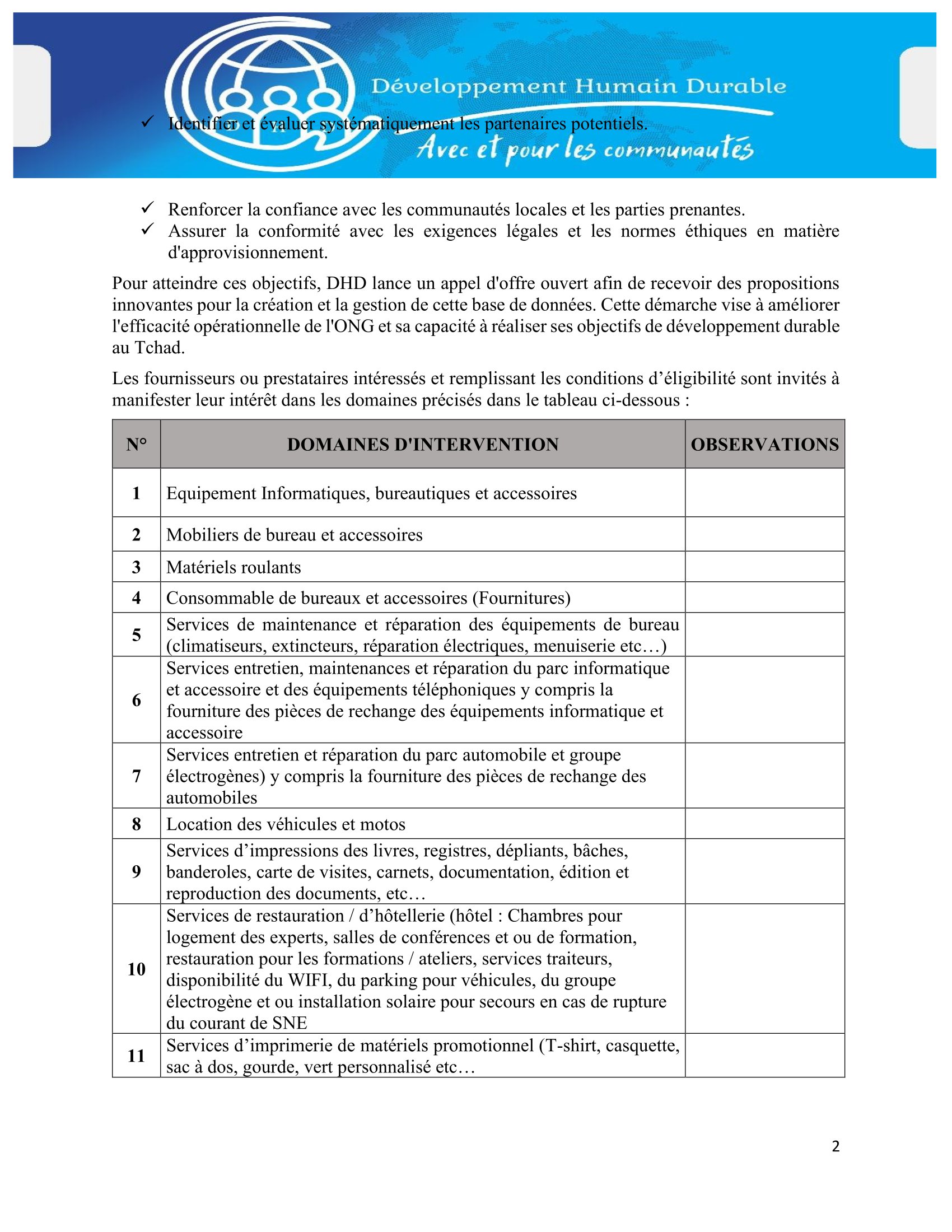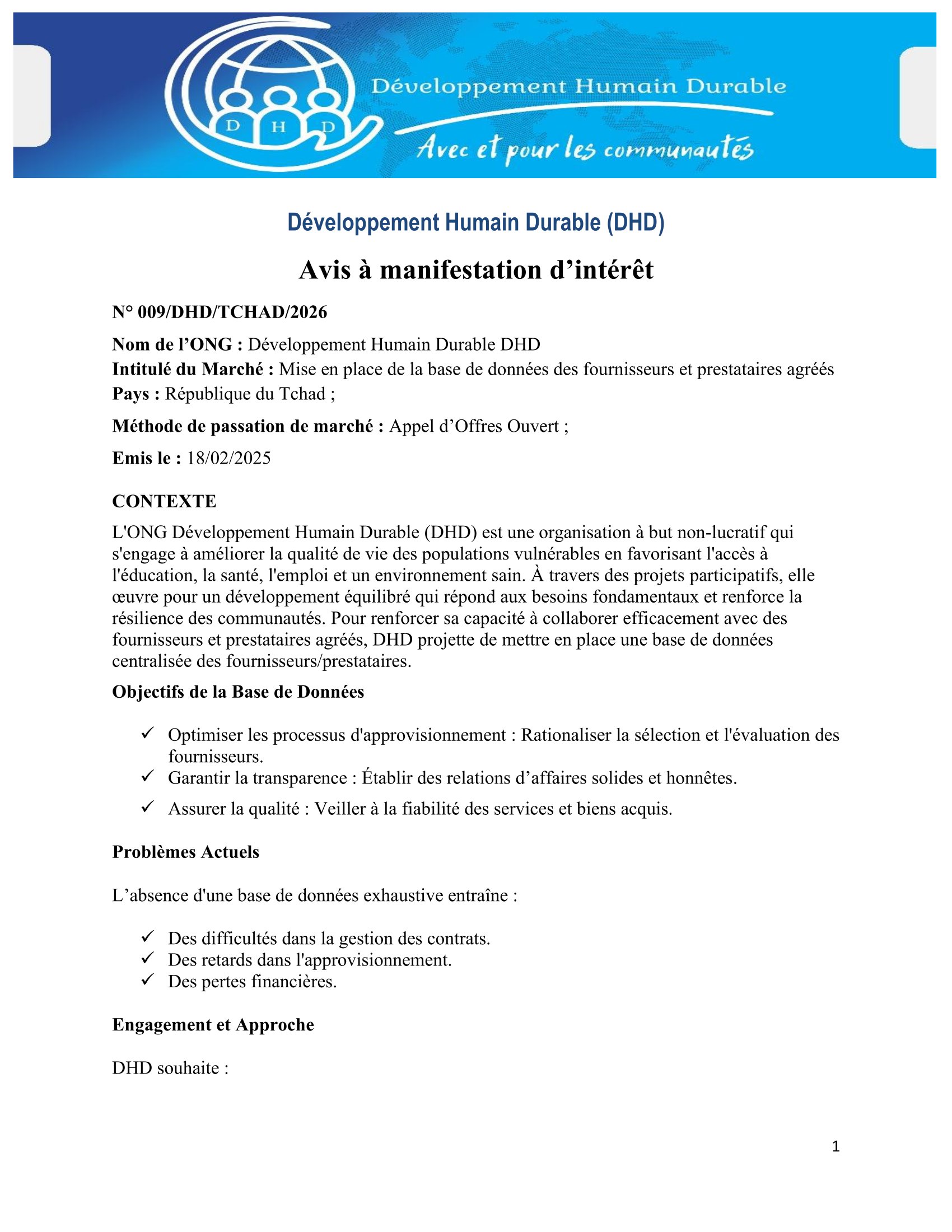 Développement Humain Durable (DHD) lance un avis à manifestation d’intérêt pour la mise en place de la base de données des fournisseurs et prestataires agréés, N’Djamena, Tchad