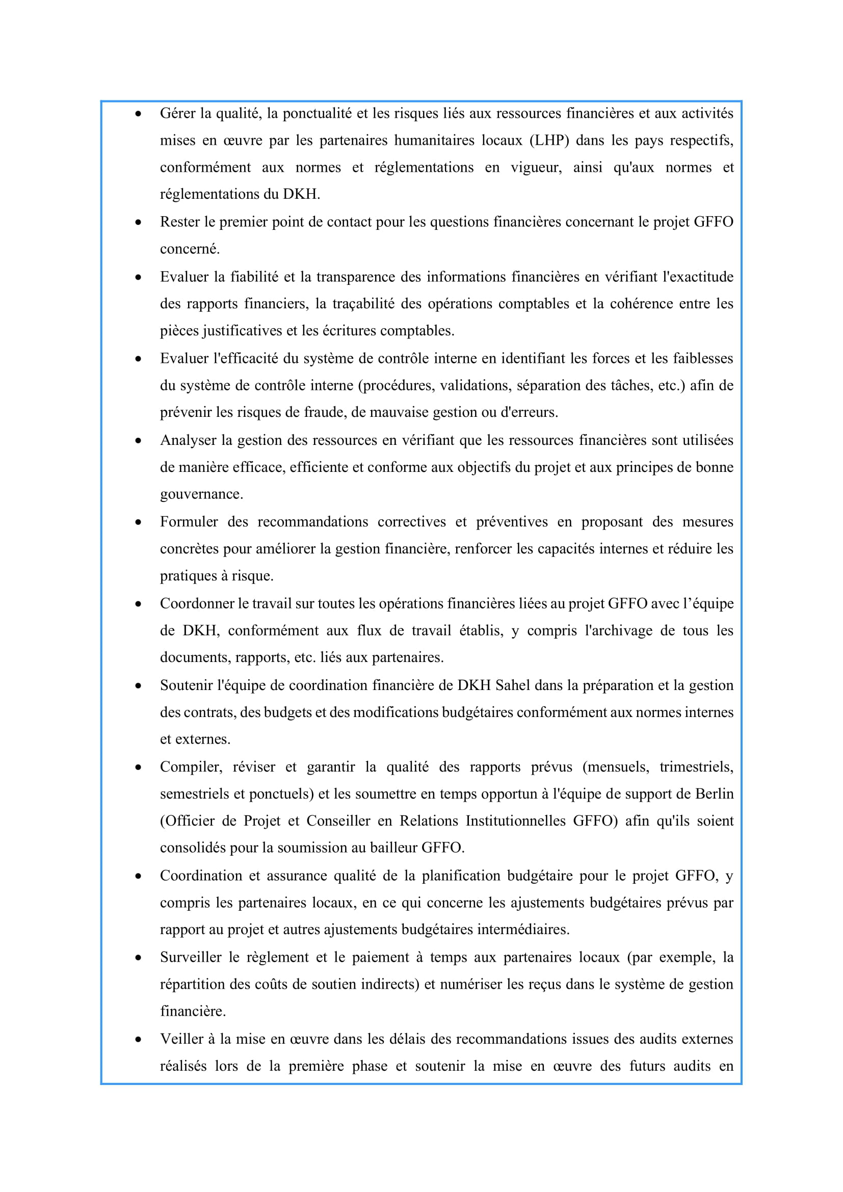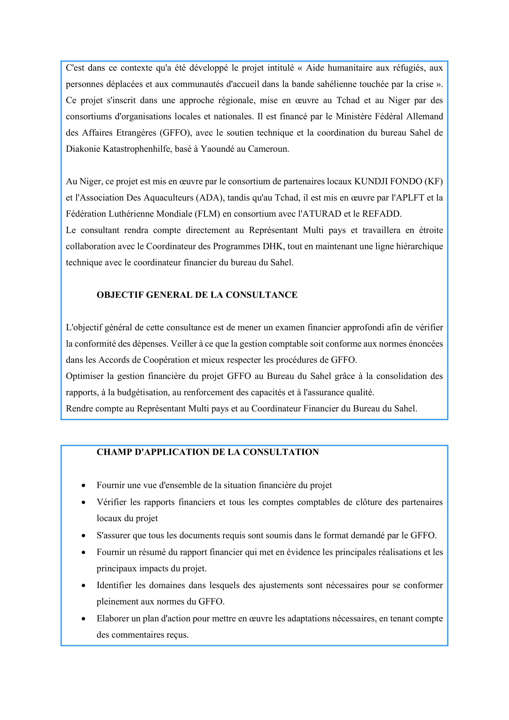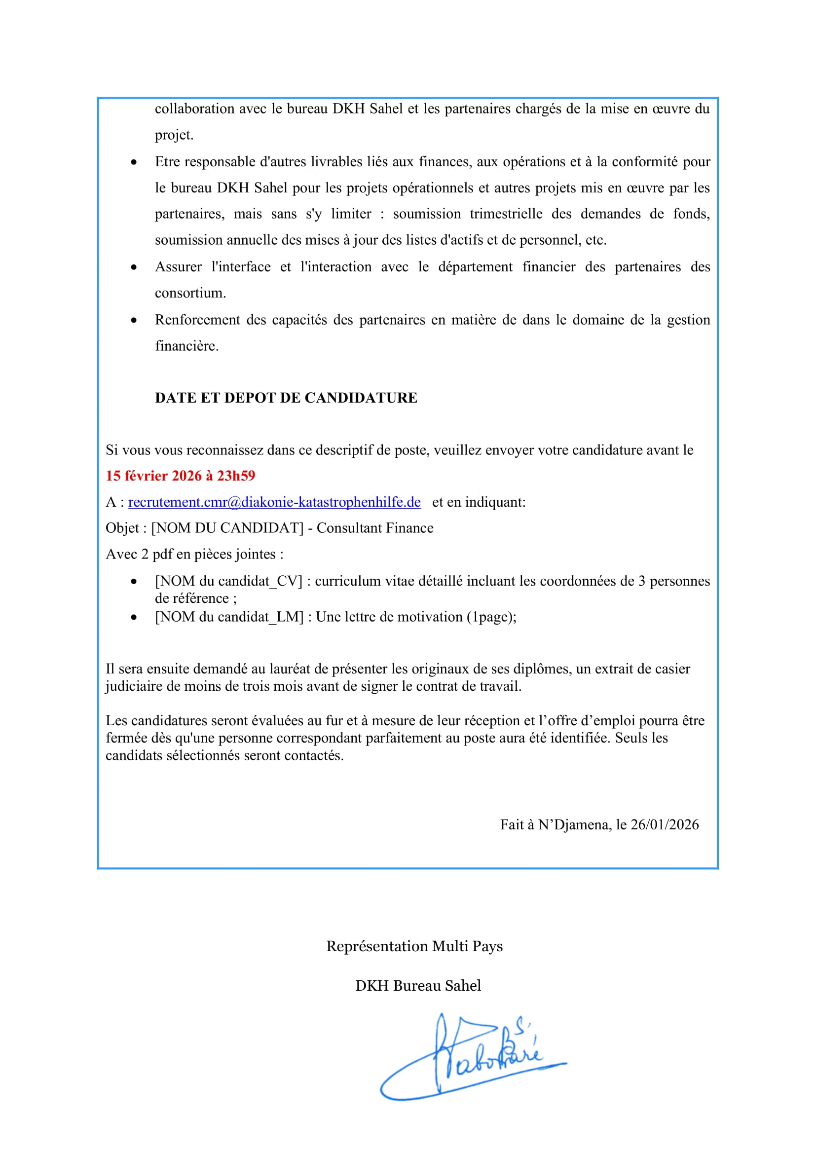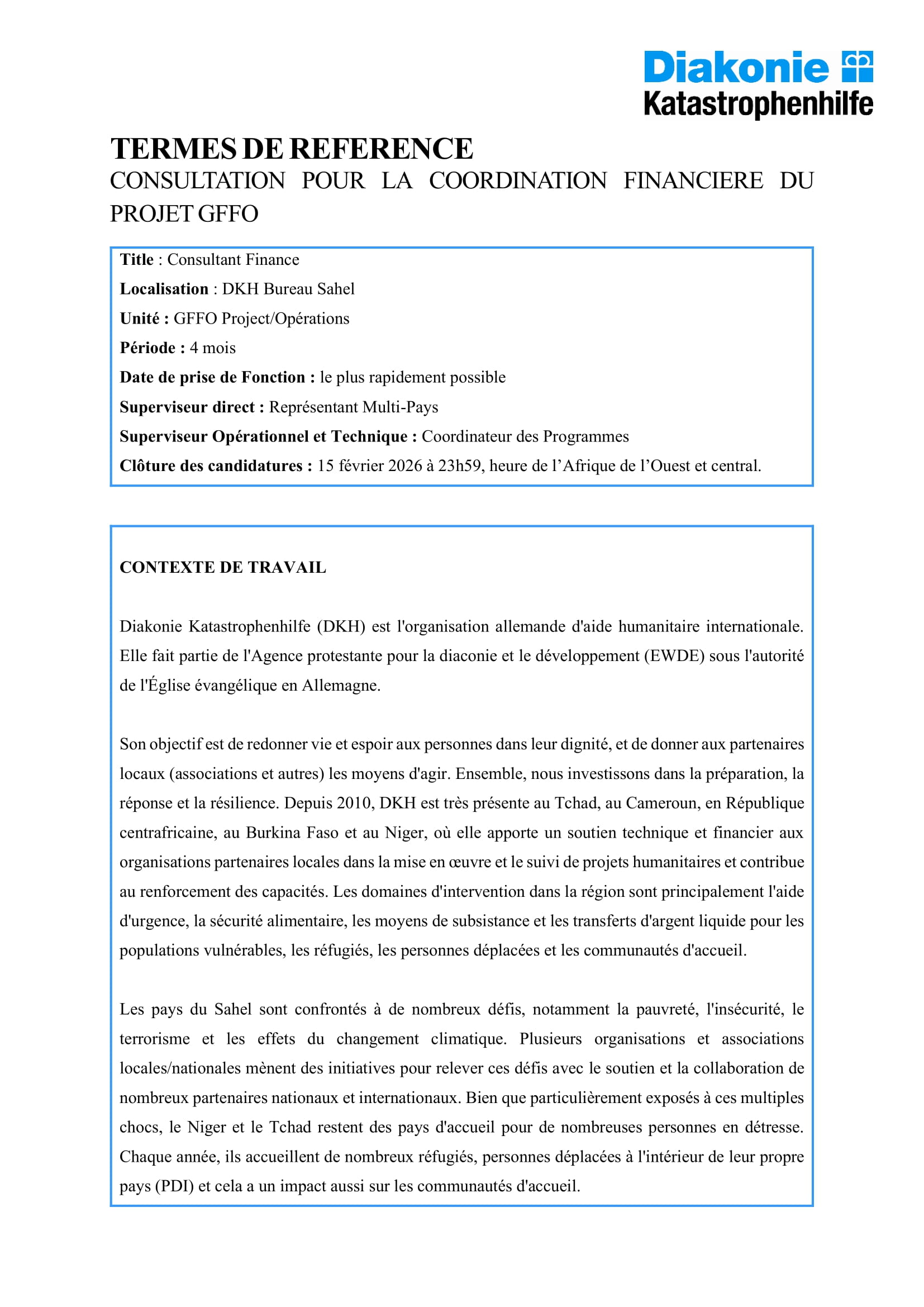 Diakonie Katastrophenhilfe annonce la mise à jour de l’avis d’appel d’offre pour le recrutement d’un Consultant Finance Jan 28, 2026 Diakonie Katastrophenhilfe annonce la mise à jour de l’avis d’appel d’offre pour le recrutement d’un Consultant Finance Share on FacebookTweetFollow usSaveLe Conseil Norvégien pour les Réfugiés recrute un(e) HR & Administration Manager, N’Djamena, TchadDans le cadre du projet RAPAR, la CARITAS Suisse lance un avis d’appel d’offres pour le recrutement d’un prestataire de services financiers pour la distribution du cash aux ménages vulnérables du département du Batha-Est et Assinet, TchadCatholic Relief Services recrute pour le poste de Deputy Chief of Party-Programming/Chef de Bureau, Farchana, TchadAppel à candidatures pour les bourses Erasmus Mundus EMLE, Europe