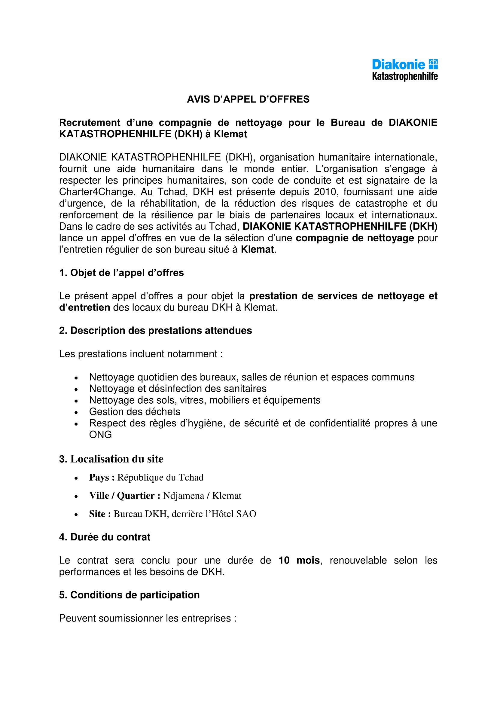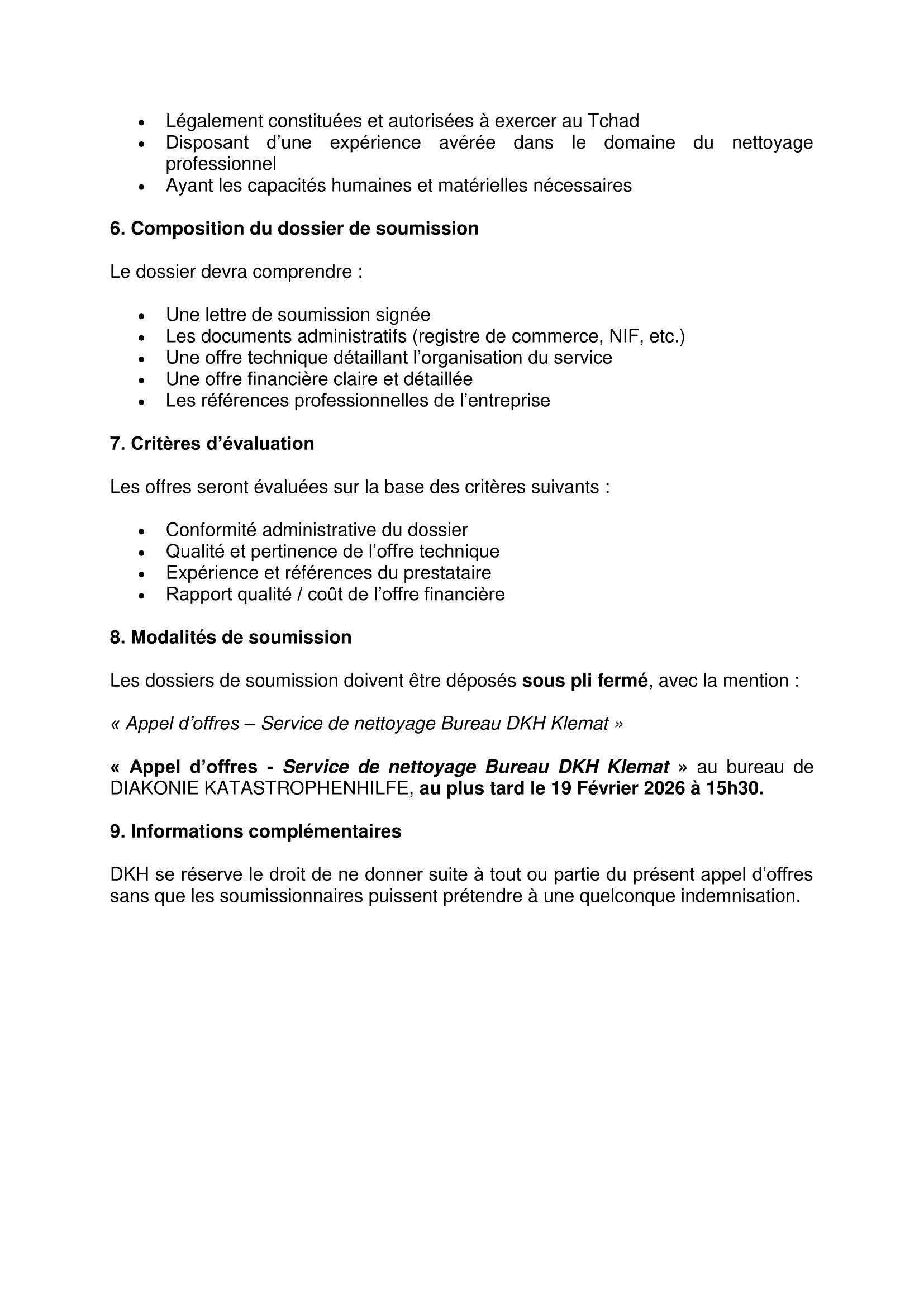 DIAKONIE KATASTROPHENHILFE (DKH) lance un avis d’appel d’offres pour le recrutement d’une compagnie de nettoyage, N’Djamena, Tchad Fév 6, 2026 DIAKONIE KATASTROPHENHILFE (DKH) lance un avis d’appel d’offres pour le recrutement d’une compagnie de nettoyage, N’Djamena, Tchad Share on FacebookTweetFollow usSaveAppel à candidatures pour les bourses d’études de la Fondation Heinrich Boll, AllemagneL’Ambassade de France en Tanzanie a lancé un appel à candidatures pour le programme de bourses du gouvernement Français pour des Étudiants Tanzaniens.L’Académie mondiale des sciences (TWAS), en collaboration avec le Centre international des sciences chimiques et biologiques (ICCBS) de l’Université de Karachi, au Pakistan, propose le programme de bourses d’études supérieures TWAS-ICCBS 2025African Parks Network recrute un Coordinateur du développement commercial, Fada, Tchad