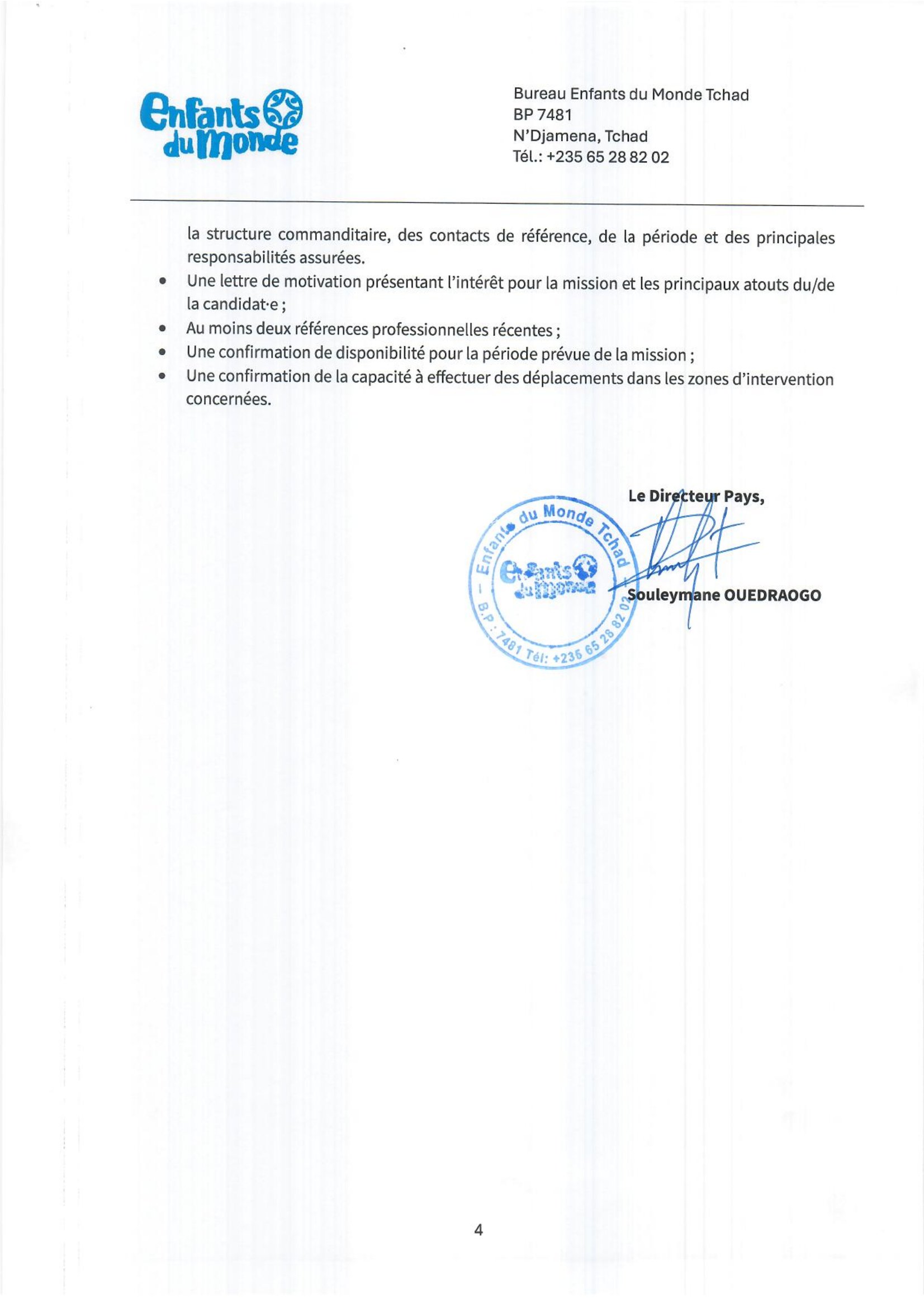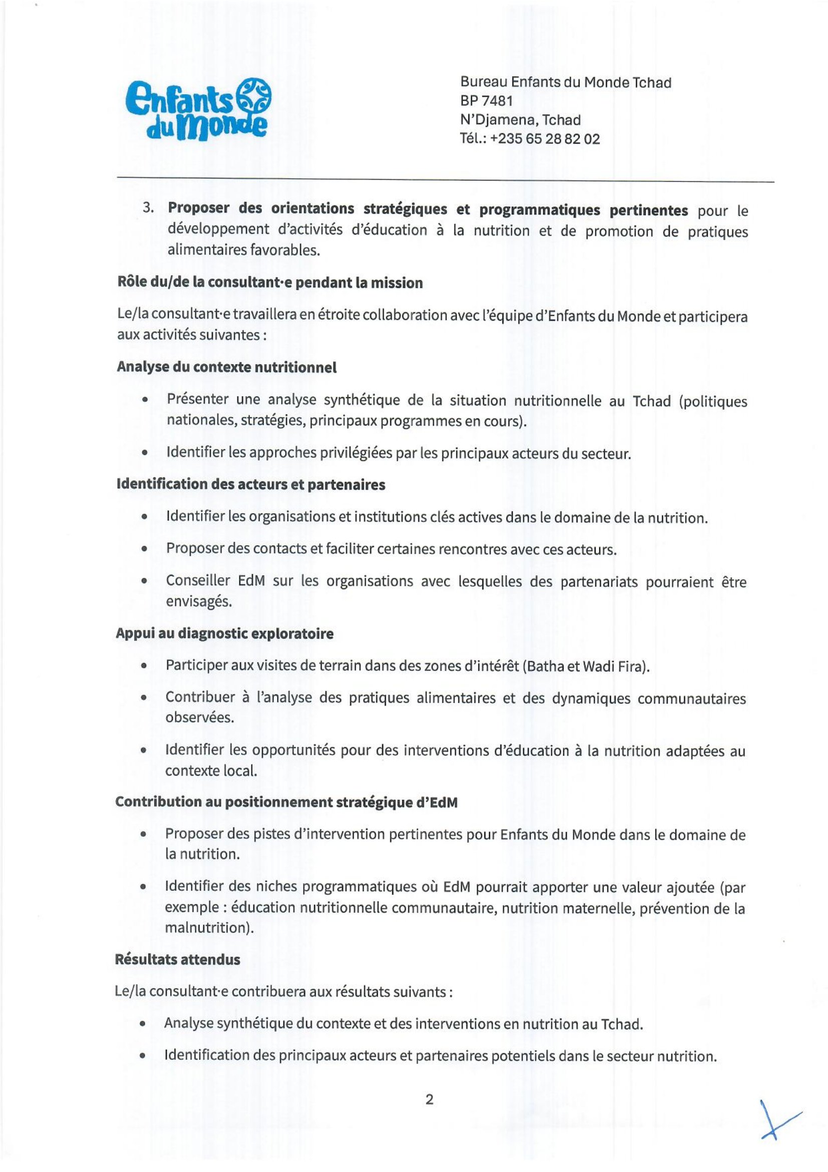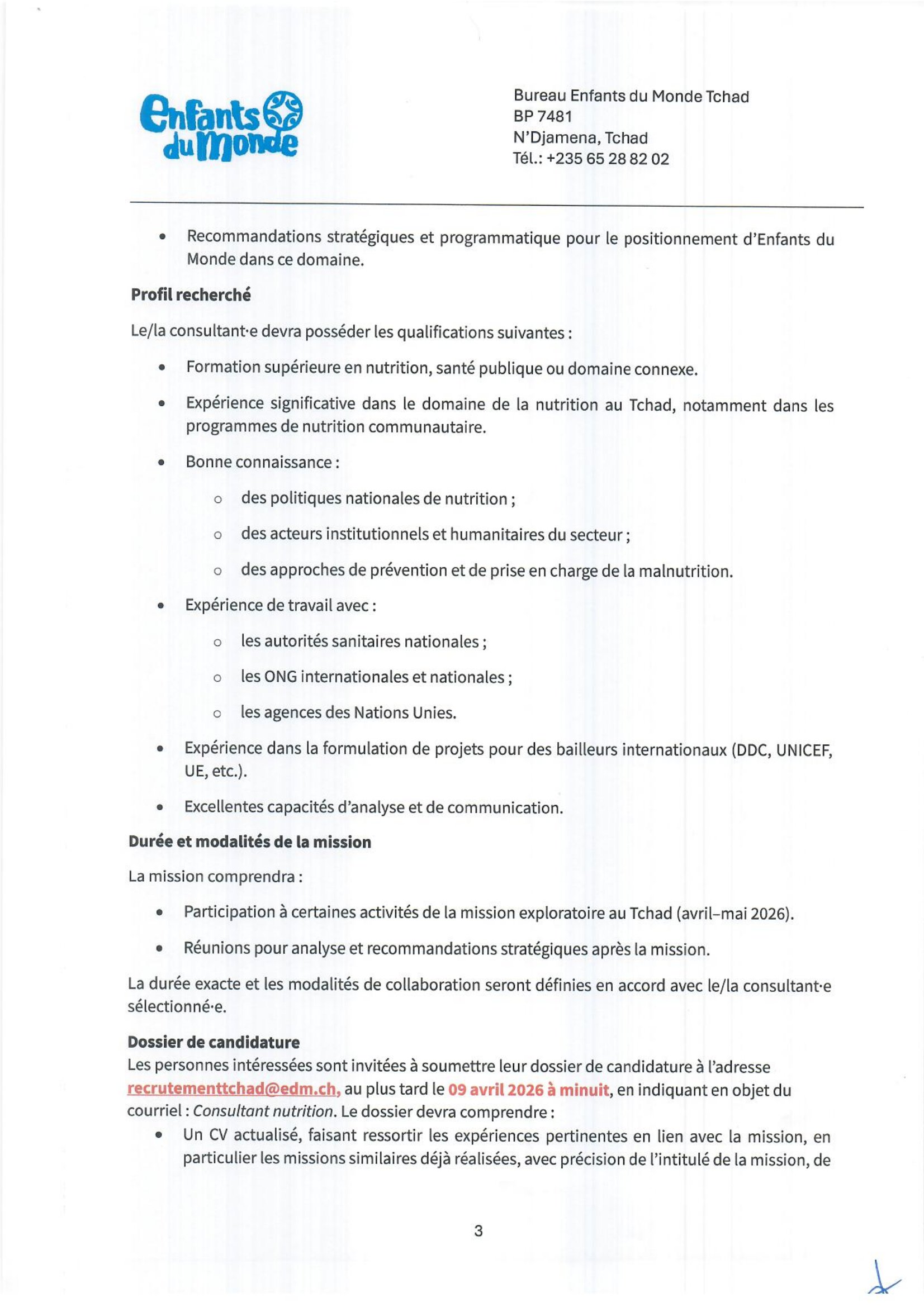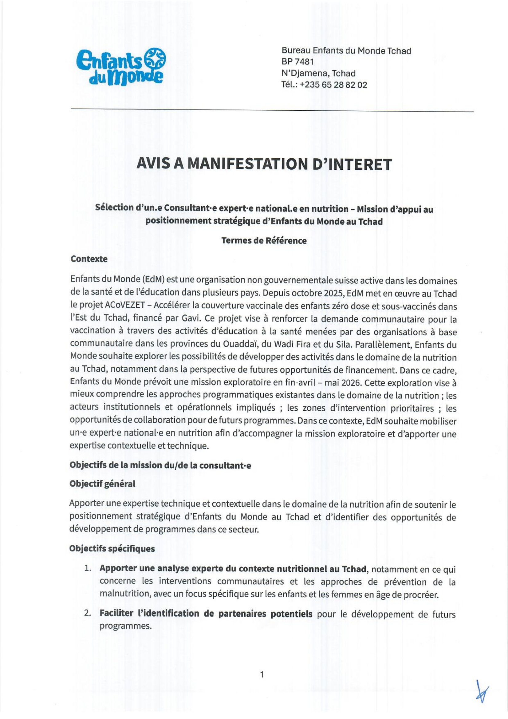 Enfants du Monde (EdM) Tchad lance un avis à manifestation d’intérêt pour la sélection d’un Consultant Expert National en Nutrition (H/F) Mar 25, 2026 Enfants du Monde (EdM) Tchad lance un avis à manifestation d’intérêt pour la sélection d’un Consultant Expert National en Nutrition (H/F) Share on FacebookTweetFollow usSaveL’ONG Enfant Du Monde un(e) chargé(e) pédagogique, Ouaddai, Moyen-Chari, TchadAppel à candidatures pour les bourses d’études de l’université Eastern Washington, USAProgramme des Nations Unies pour le développement (PNUD) recherche un Stagiaire Infographe & Analyste des données, Goma, République Démocratique du CongoAppel à candidatures pour les bourses d’études de la Fondation Heinrich Boll, Allemagne