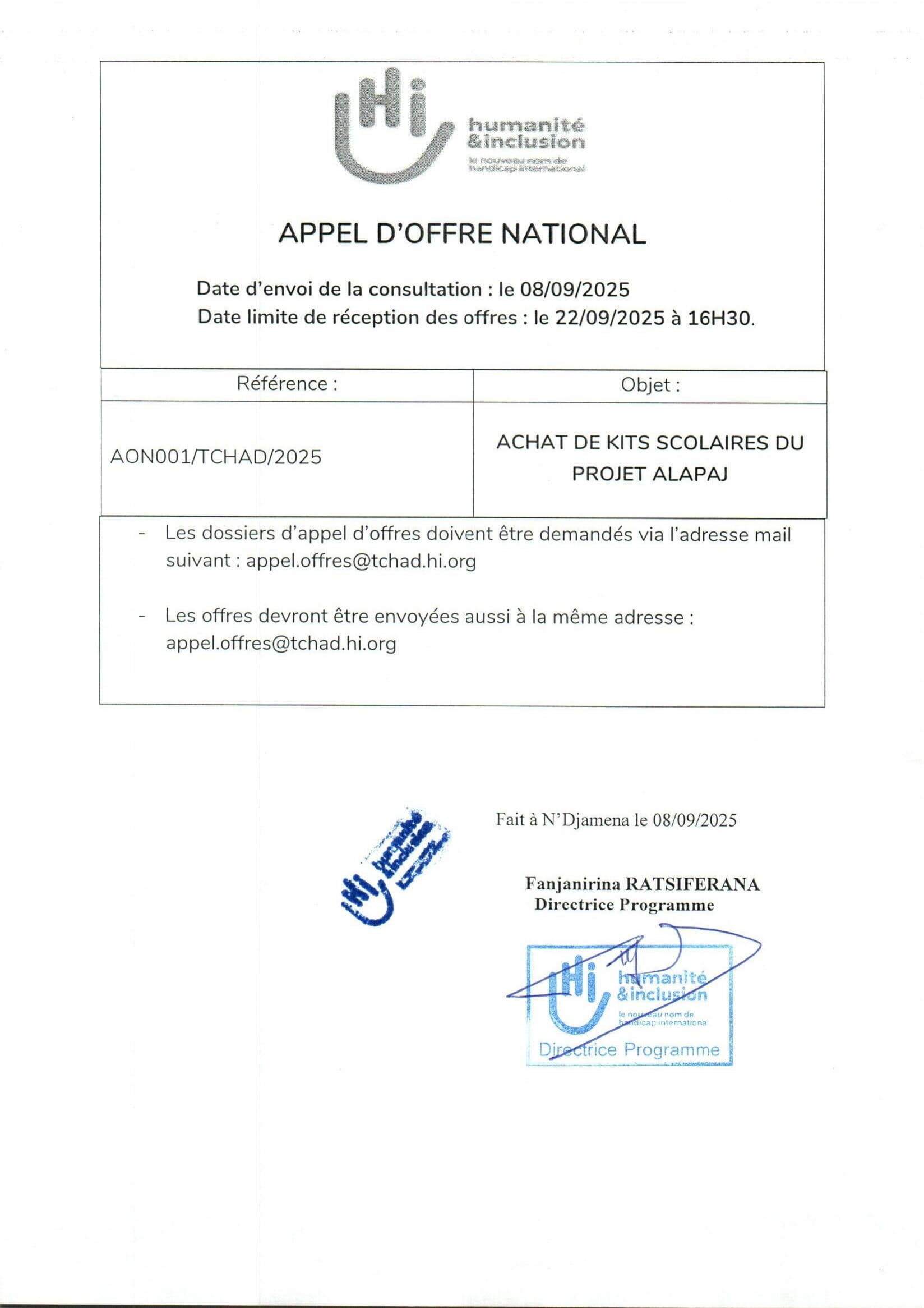 Humanité & Inclusion lance un appel d’offre pour l’achat de kits scolaire du projet ALAPAJ, N’Djamena, Tchad Sep 8, 2025 Humanité & Inclusion lance un appel d’offre pour l’achat de kits scolaire du projet ALAPAJ, N’Djamena, Tchad Share on FacebookTweetFollow usSaveAgriculteurs francais et développement Agriculteurs Français et développement international (Afdi) recrute un(e) Coordonnateur(trice) projet/Afdi Tchadinternational (Afdi) recrute un(e) Coordonnateur(trice) projet/Afdi TchadMISSION FRANCE – Stage : Assistant.e Logistique et Finance – Base NordAppel à candidatures pour les Bourses d’études partagées du Commonwealth de l’Université de Birmingham, Royaume-UniWCS recrute un coordinateur de la conservation et des sauvegardes communautaire (H/F), Pala, Tchad