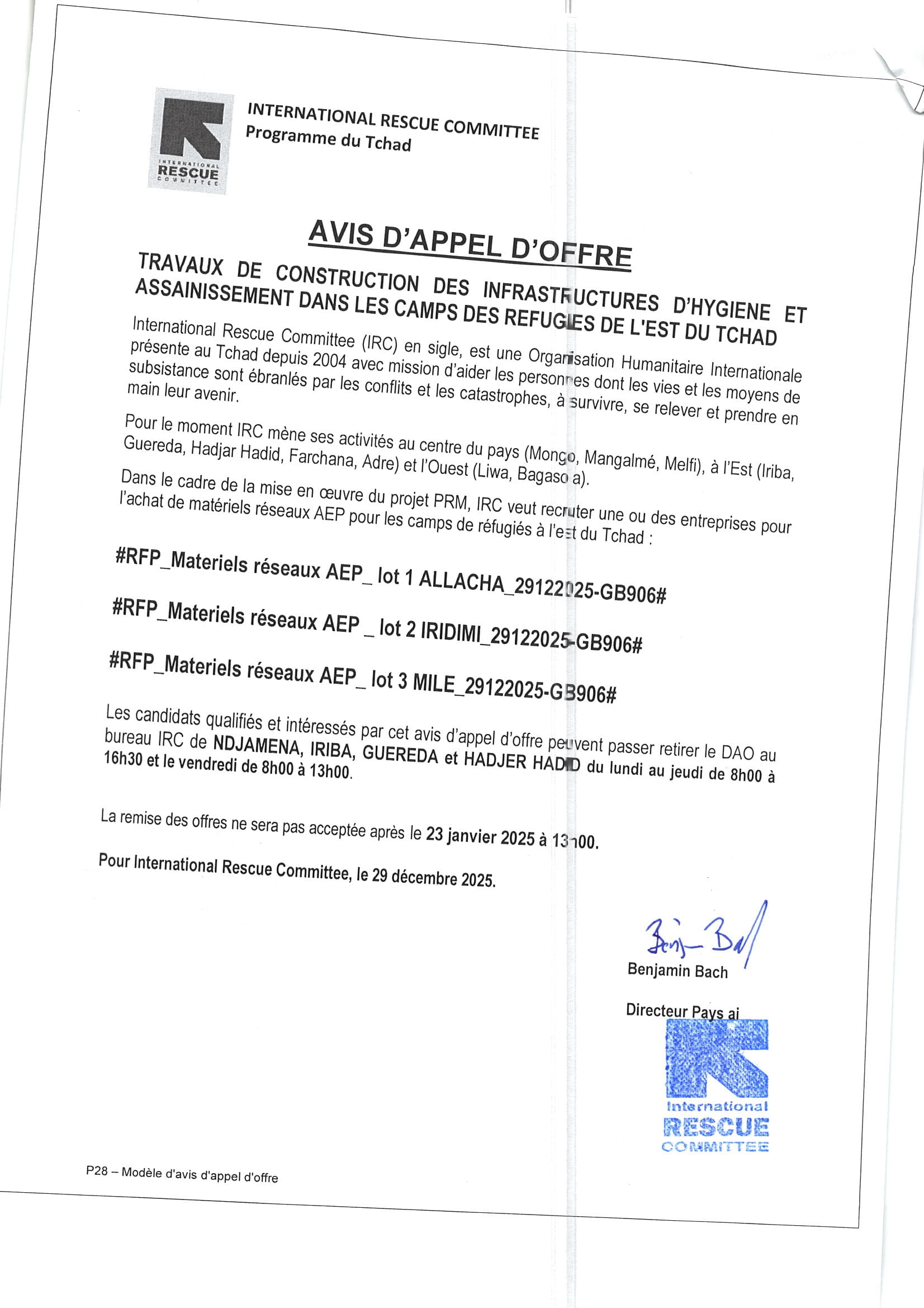 International Rescue Committee (IRC) lance un avis d’appel d’offre pour la fourniture des travaux de construction des infrastructures d’hygiène et assainissement dans lez camps des refugiés, Allacha, Iridimi, Mile, Tchad