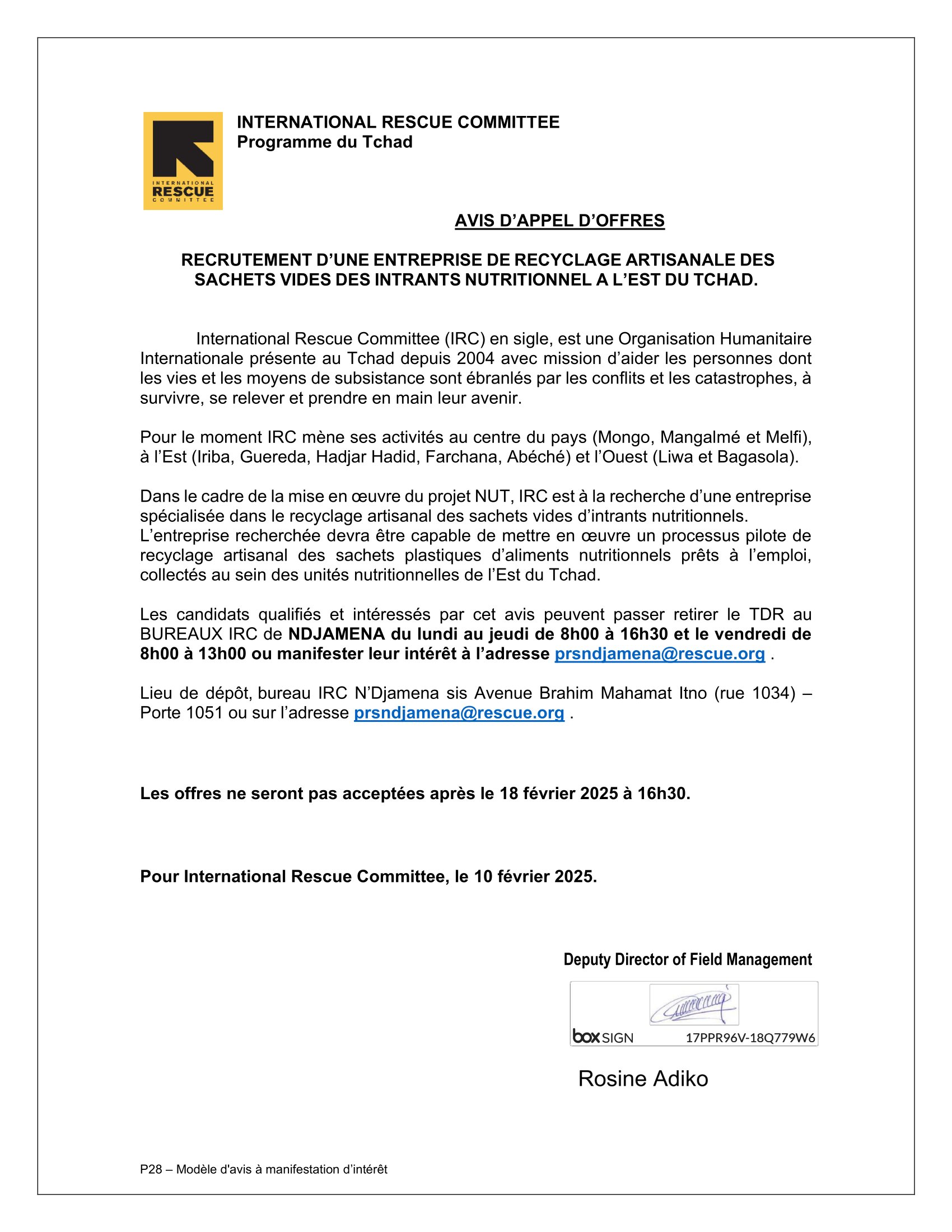 International Rescue Committee (IRC) lance un avis d’appel d’offres pour le recrutement d’une entreprise de recyclage artisanale des sachets vides des intrants nutritionnels à l’Est du Tchad
