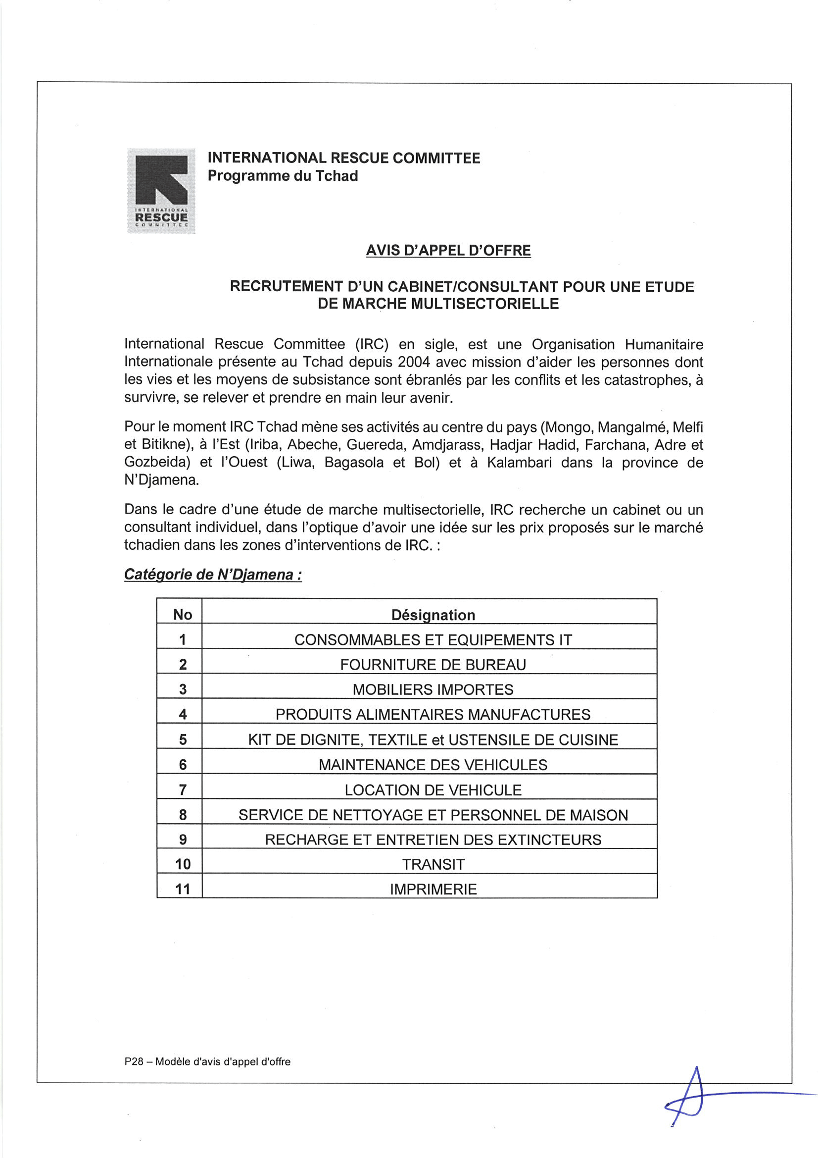 International Rescue Committee lance un appel d’offres pour le recrutement d’un cabinet/consultant pour une étude de marche multisectorielle, Tchad
