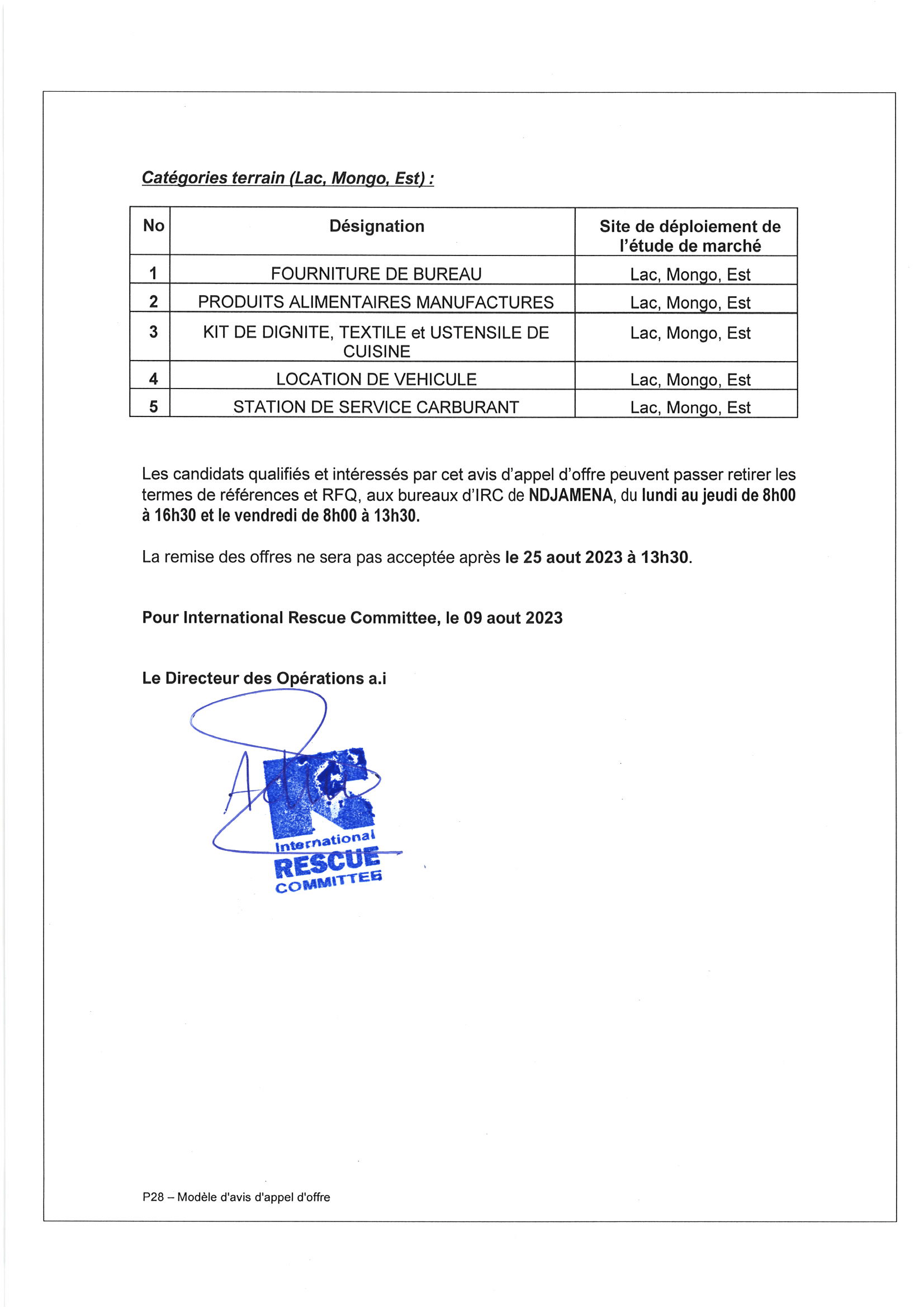 - Le Fonds International de Développement Agricole (FIDA) lance un avis d’appel d’offres pour la réalisation desdits travaux repartis en trois (03) lots comme suit : Lot 1 : Travaux de traitement de linéaires critiques des tronçons de pistes rurales d’une longueur totale de 23,936km dans le département d’Aboudeia, province du Salamat Lot 2 : Travaux de traitement de linéaires critiques de tronçon de la piste rurale d’une longueur totale de 19,876km dans le département d’Aboudeia, province du Salamat Lot 3 : Travaux de réalisation des ouvrages de franchissement sur le tronçon de piste rurale d’une longueur totale de 43,811km dans le departement d’Aboudeia, province du Salamat