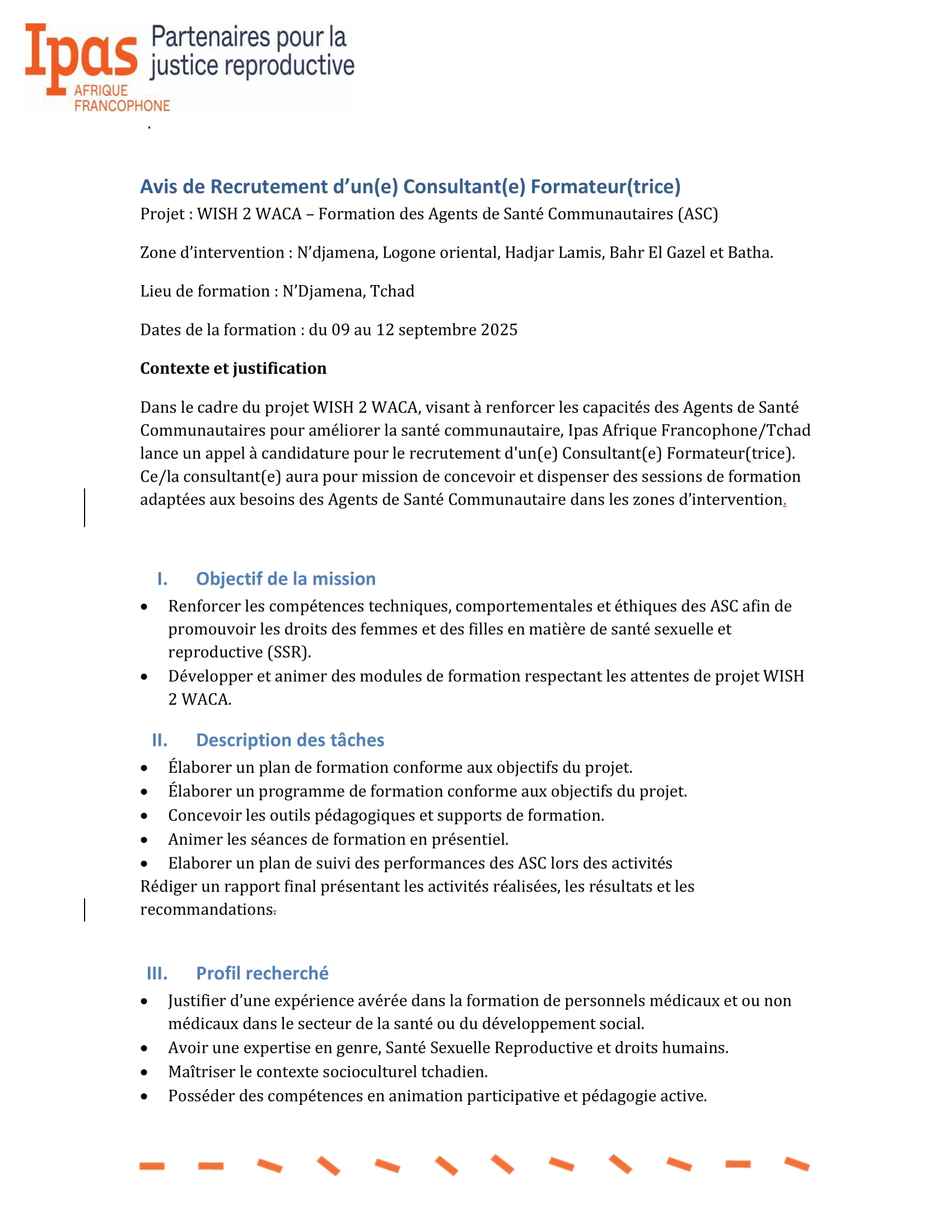 IPAS Afrique Francophone lance le recrutement d’un consultant formateur des agents de santé (H/F), N’Djamena, Logone Oriental, Hadjar Lamis, Barh El Gazal, Batha, Tchad