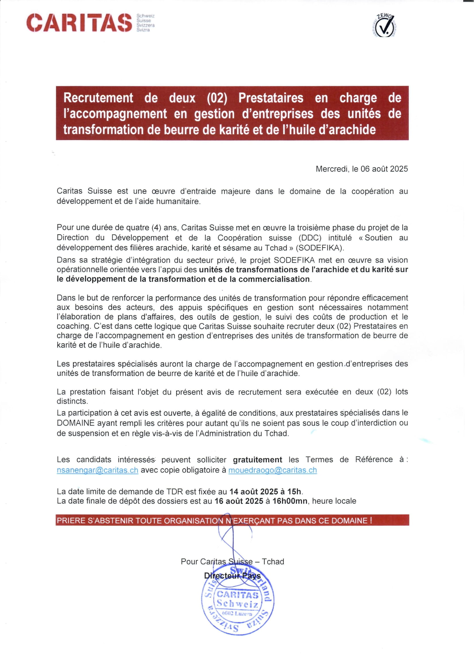 La Caritas Suisse lance un avis d’appel d’offre pour le recrutement de deux (02) prestataires en charge de l’accompagnement en gestion d’entreprises des unités de transformation de beurre de karité et de l’huile d’arachide, Tchad