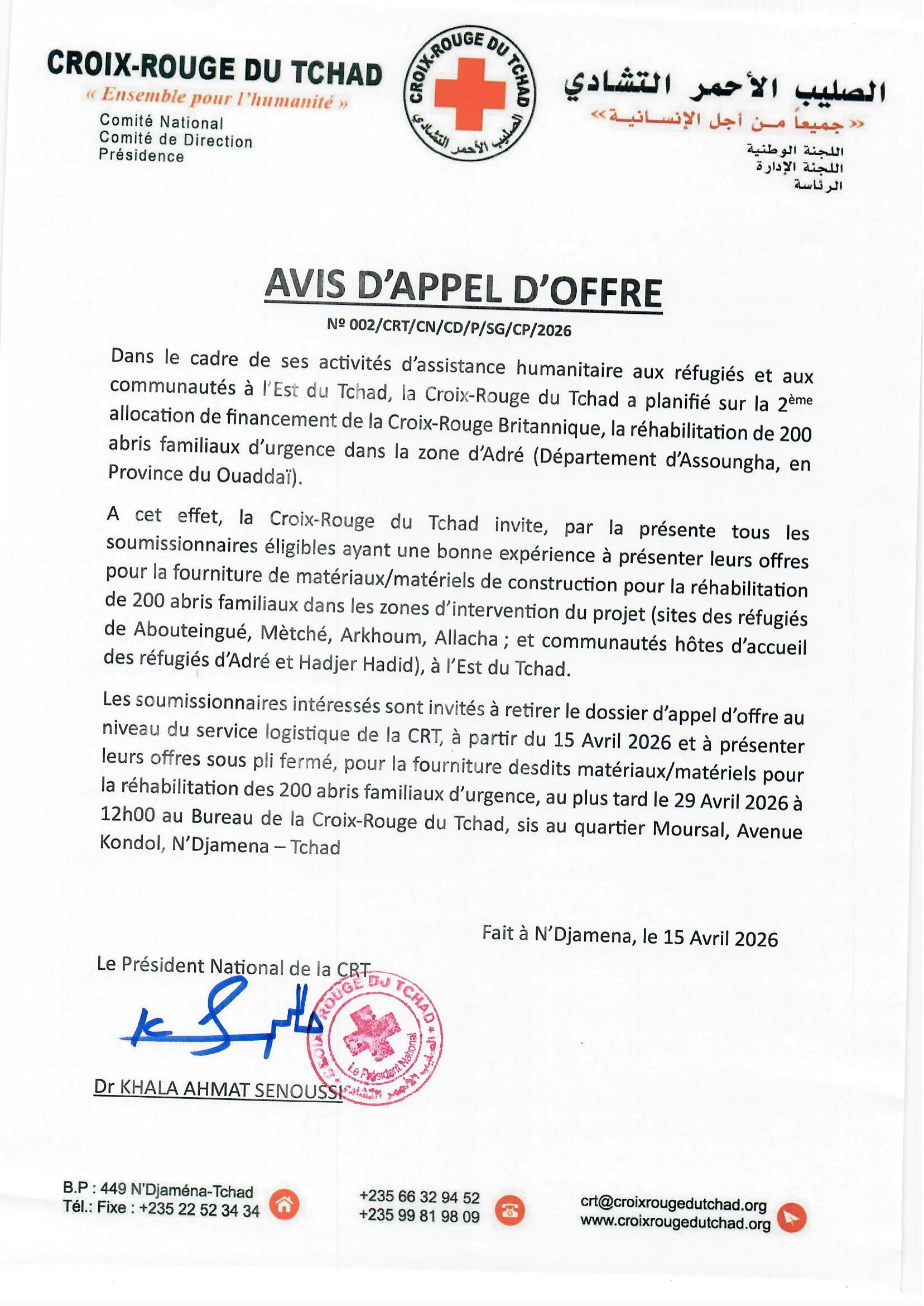 La Croix-Rouge du Tchad (CRT) lance un avis d’appel d’offre pour la fourniture de matériaux/matériels de construction pour la réhabilitation de 200 abris familiaux dans les Abouteingué, Mètché, Arkhoum, Allacha, Tchad