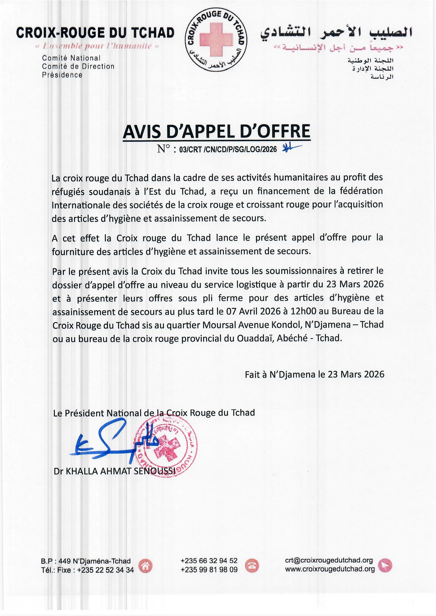 La Croix-Rouge du Tchad lance un avis d’appel d’offres pour la fourniture des articles d’hygiène et assainissement de secours Mar 24, 2026 La Croix-Rouge du Tchad lance un avis d’appel d’offres pour la fourniture des articles d’hygiène et assainissement de secours Share on FacebookTweetFollow usSaveSOCODEVI recrute un Spécialiste Suivi, évaluation et apprentissage, Mongo/Guera, TchadLa GIZ lance le recrutement interne/externe d’un(e) expert(e) en crises, conflits et catastrophes (cohésion sociale), Mao, TchadLe Développement International Desjardins (DID) lance un avis d’appel d’offre pour le recrutement d’un prestataire pour la fourniture de service de traduction et enregistrement de capsules audios, TchadWorld Vision lance un avis d’appel d’offres pour l’achat des groupes électrogènes, N’Djamena et Bol, Tchad