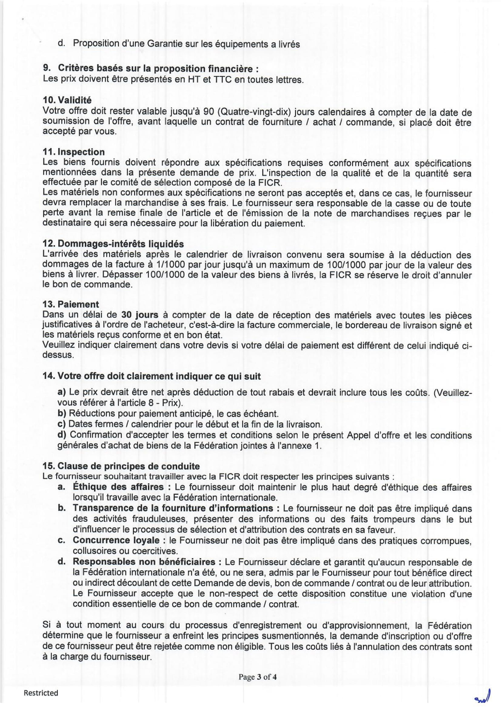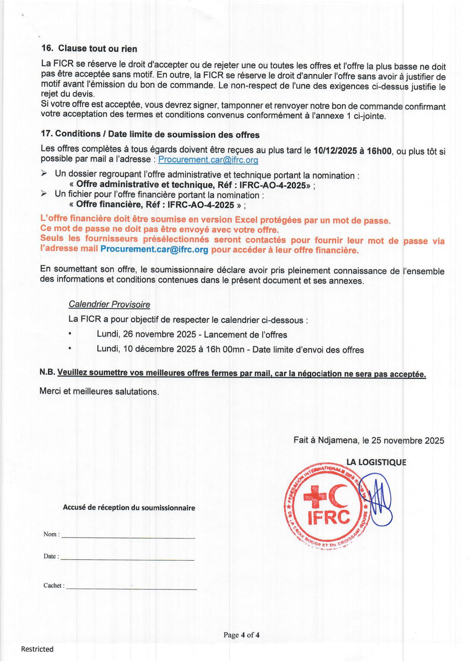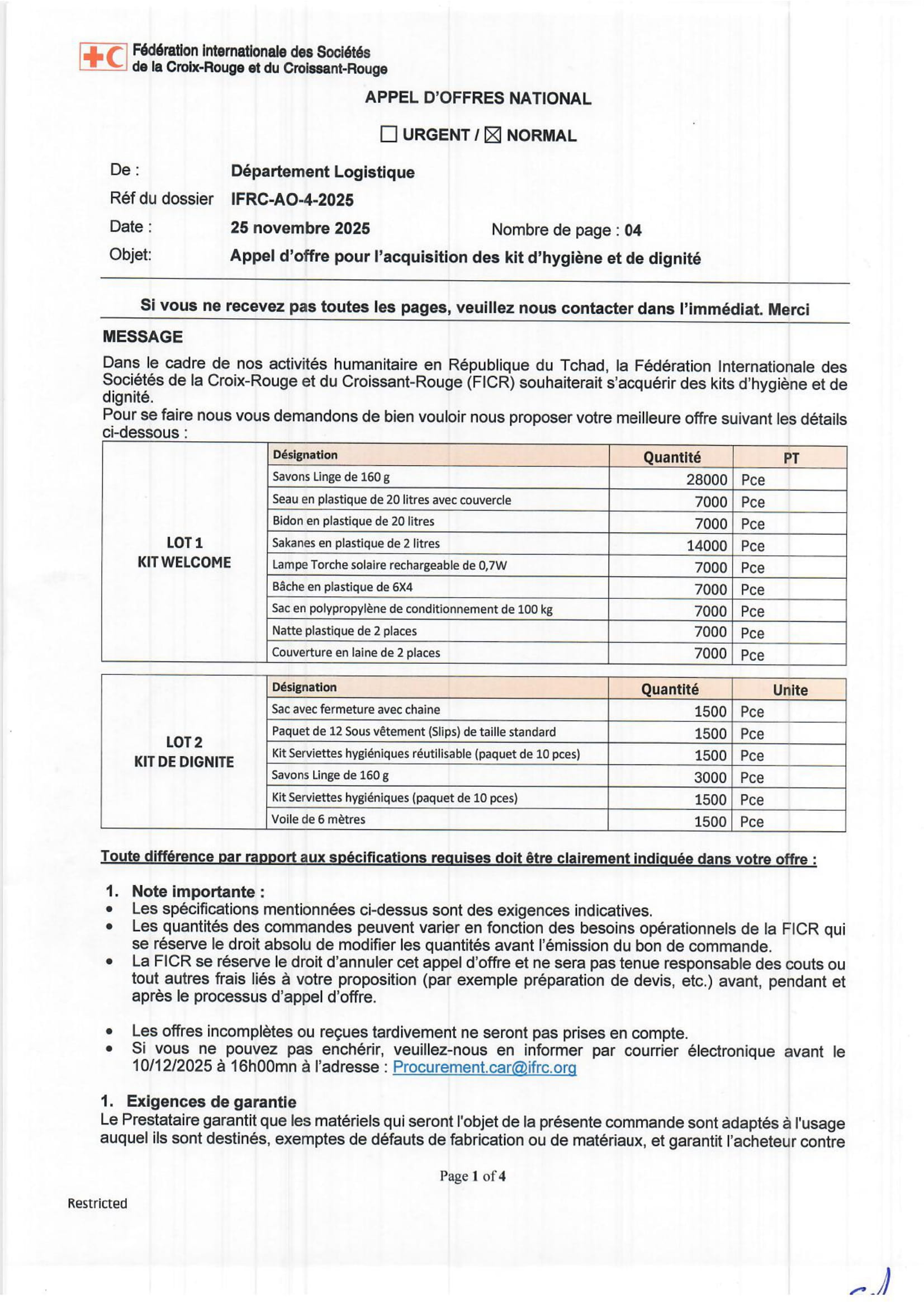 La Fédération Internationale des Sociétés de la Croix-Rouge et Croissant-Rouge lance un avis d’appel d’offre national pour l’acquisition des kits d’hygiène et de dignité, N’Djamena, Tchad