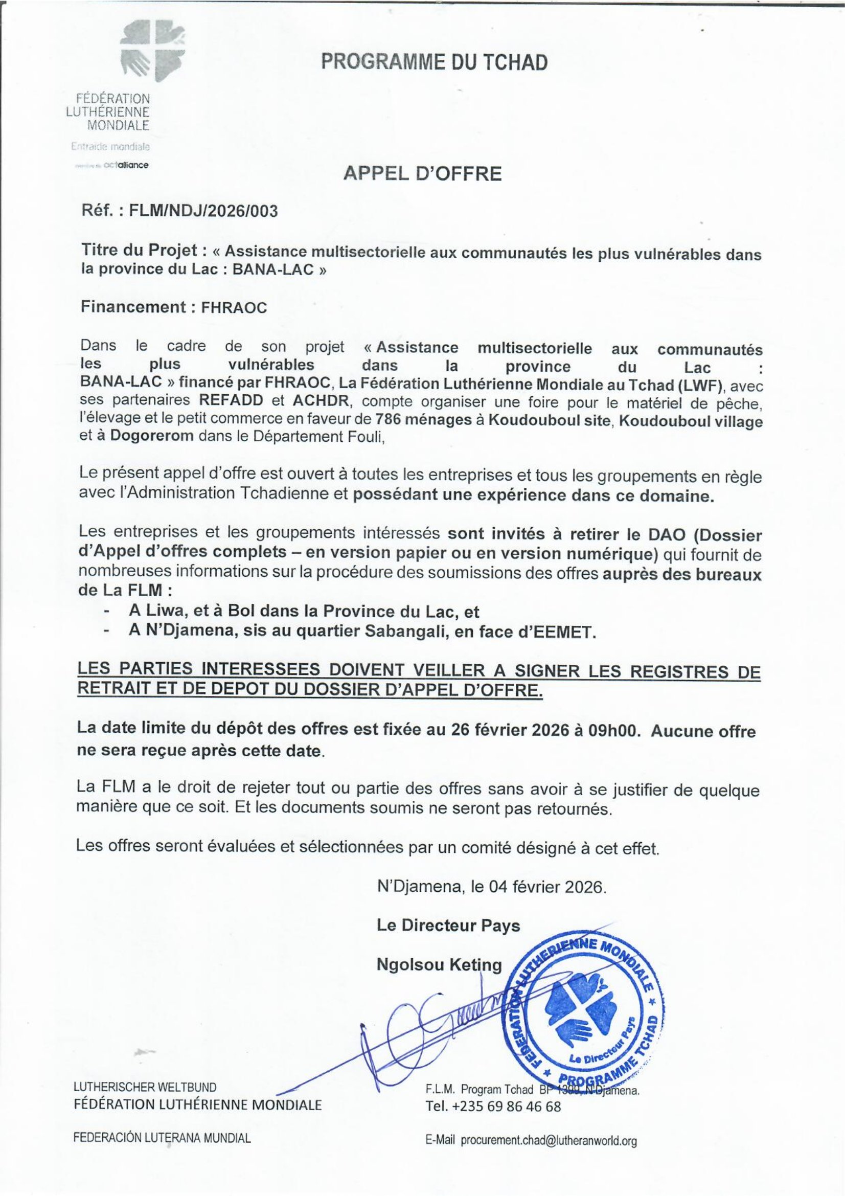 La Fédération Luthérienne Mondiale (FLM) lance un avis d’appel d’offres pour Assistance multisectorielle aux communautés les plus vulnérables dans la province du Lac, Tchad