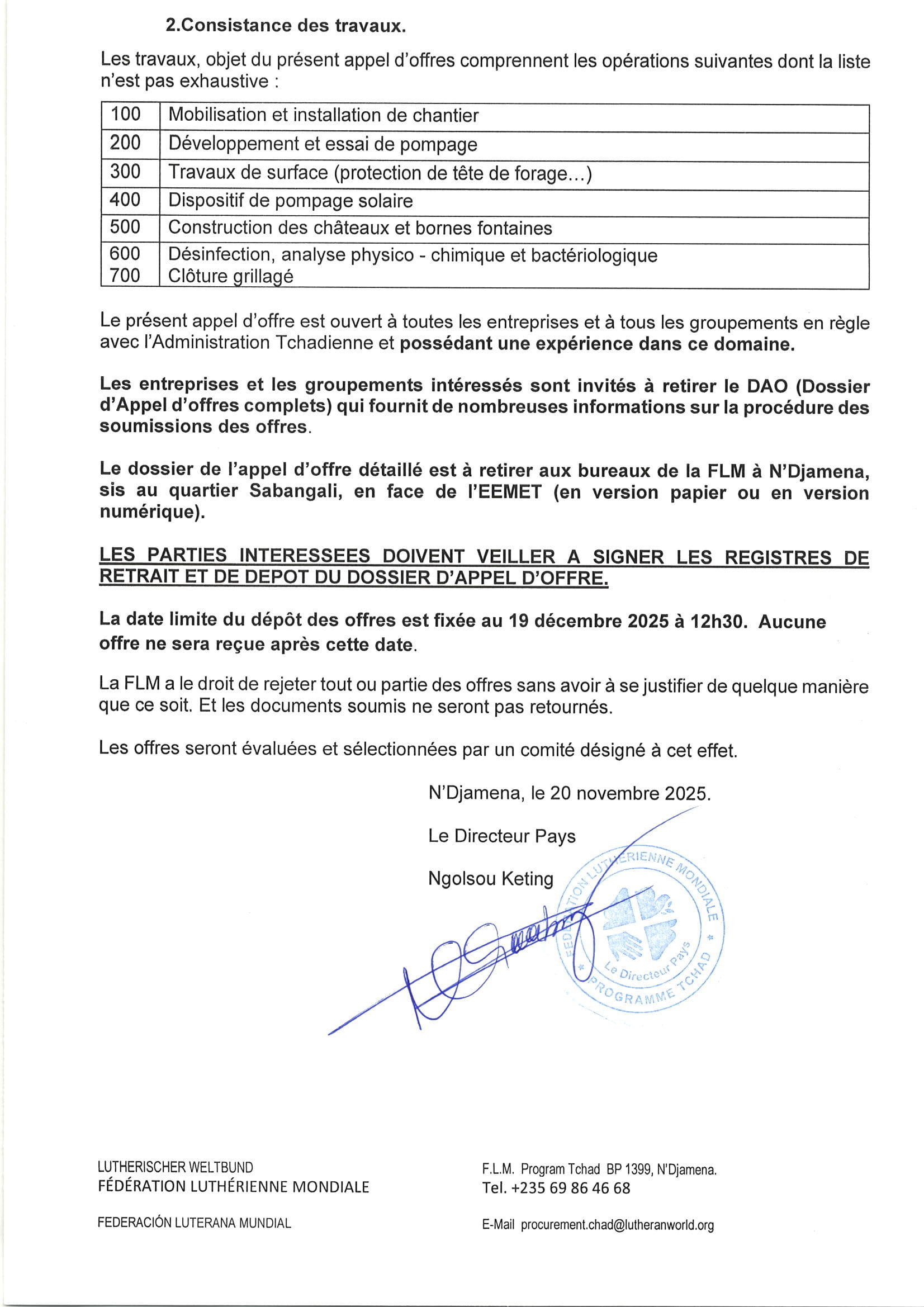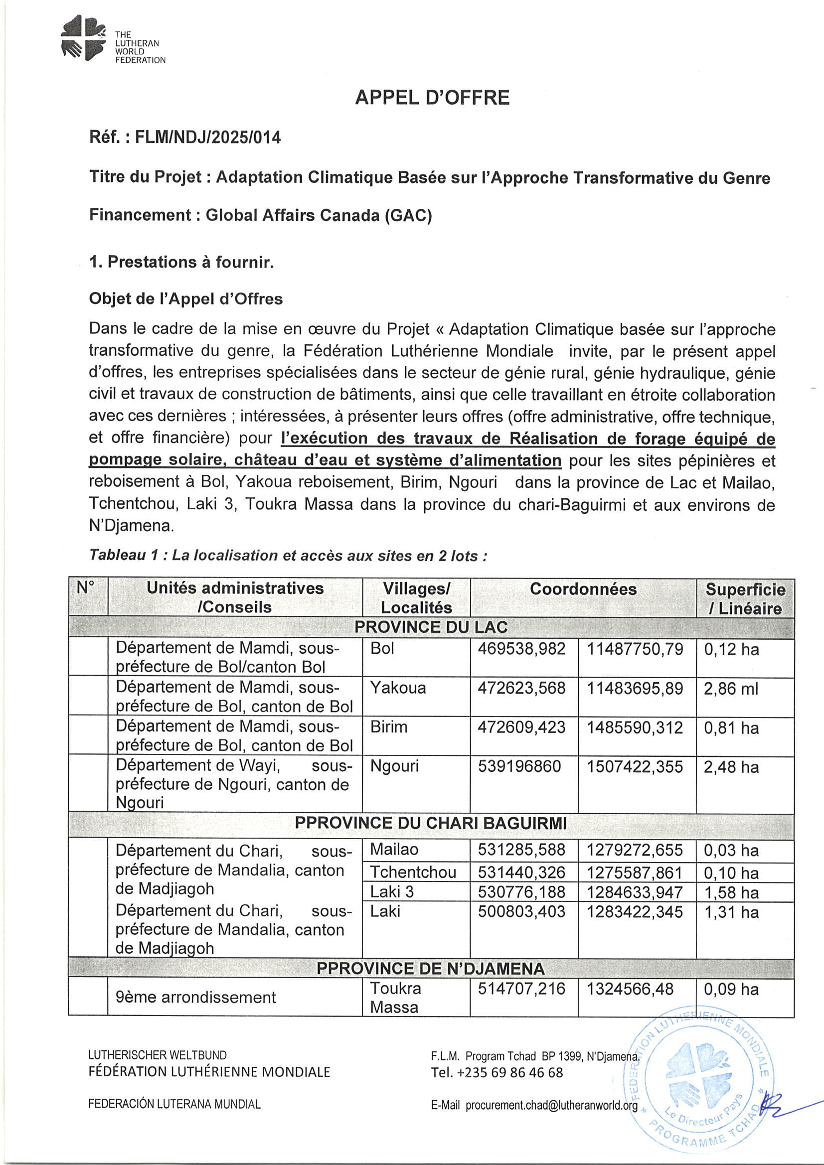 La Fédération Luthérienne Mondiale lance un avis d’appel d’offre pour l’exécution des travaux de réalisation de forage équipé de pompe solaire, château d’eau et système d’alimentation, Bol, Yakoua, Birim, , Ngouri, Mailao, Tchentchou, Laki 3, Chari Baguirmi, N’Djamena, Tchad