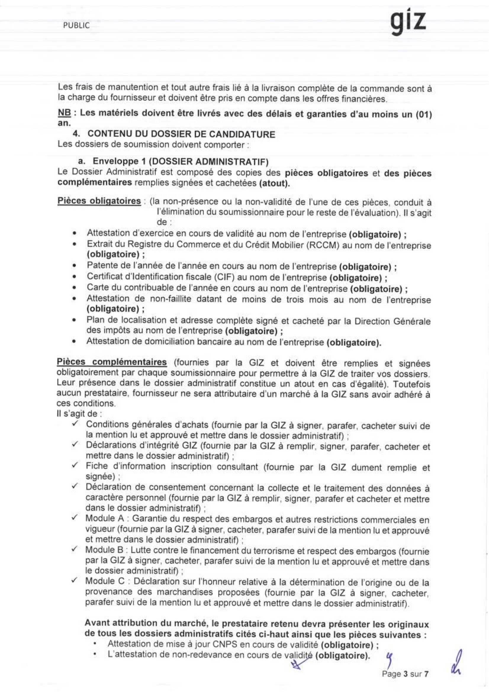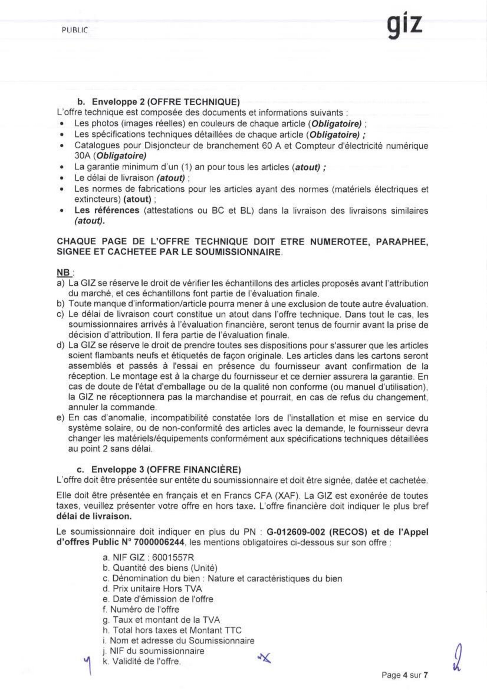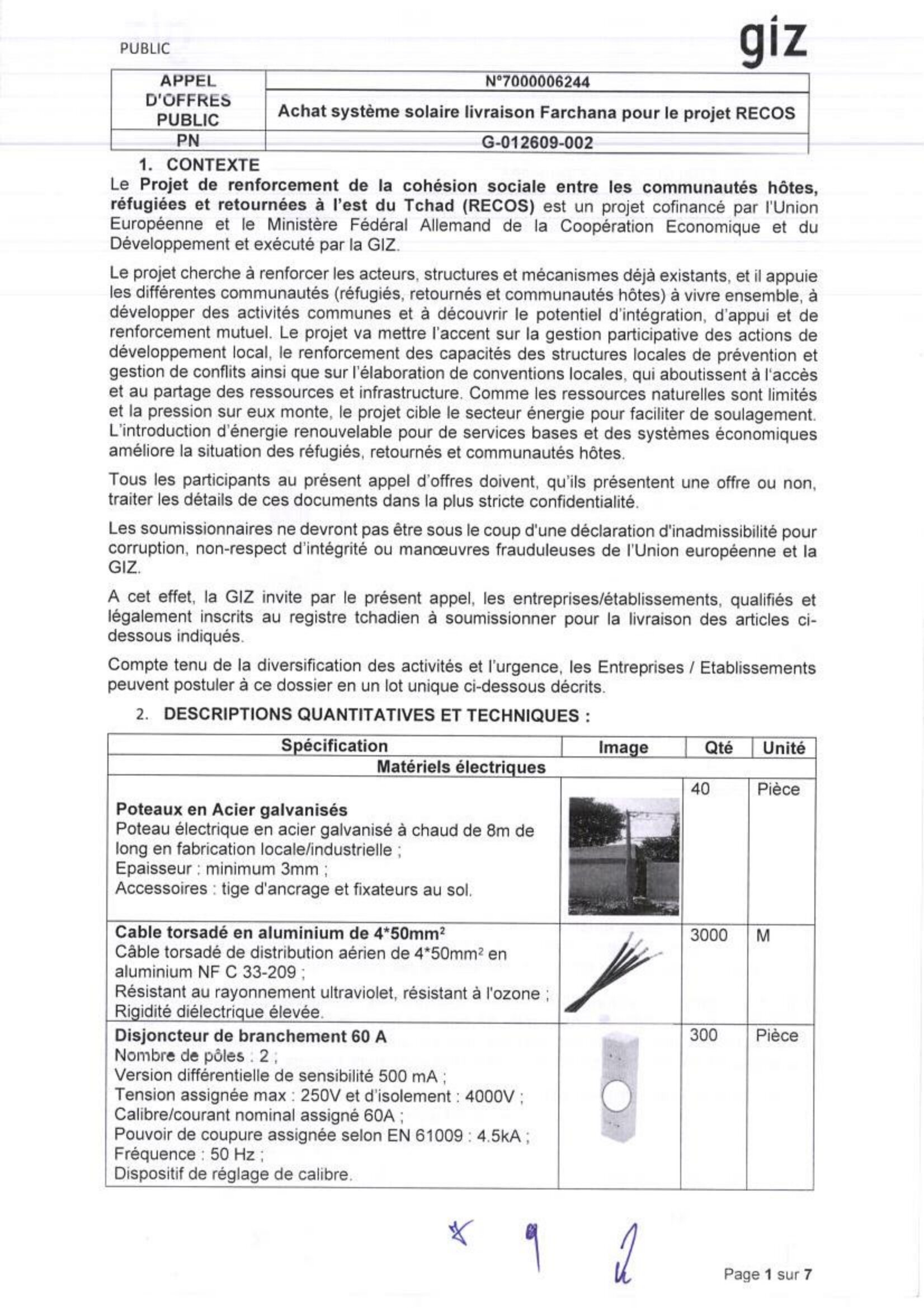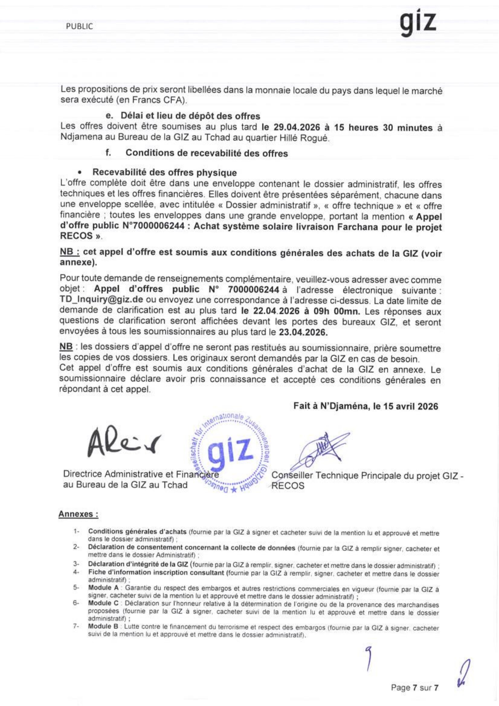 La GIZ lance un avis d’appel d’offre pour l’achat de système solaire, Farchana, Tchad Avr 16, 2026 La GIZ lance un avis d’appel d’offre pour l’achat de système solaire, Farchana, Tchad DAO_02_relatif_à_l achat_de_système_solaire_publication_tchad_ca Share on FacebookTweetFollow usSaveOXFAM lance un avis d’appel d’offres pour la fourniture de services de Maintenance et d’Entretien de Véhicules, la fourniture de pièces de rechanges mécaniques, N’Djamena, TchadAfrican Parks recrute un(e) responsable de la communication et des médias AP , N’Djamena, TchadJust do itUNICEF (Fonds des Nations Unies pour l’Enfance) recrute un stagiaire pôle communication corporate (F/H), Paris, France