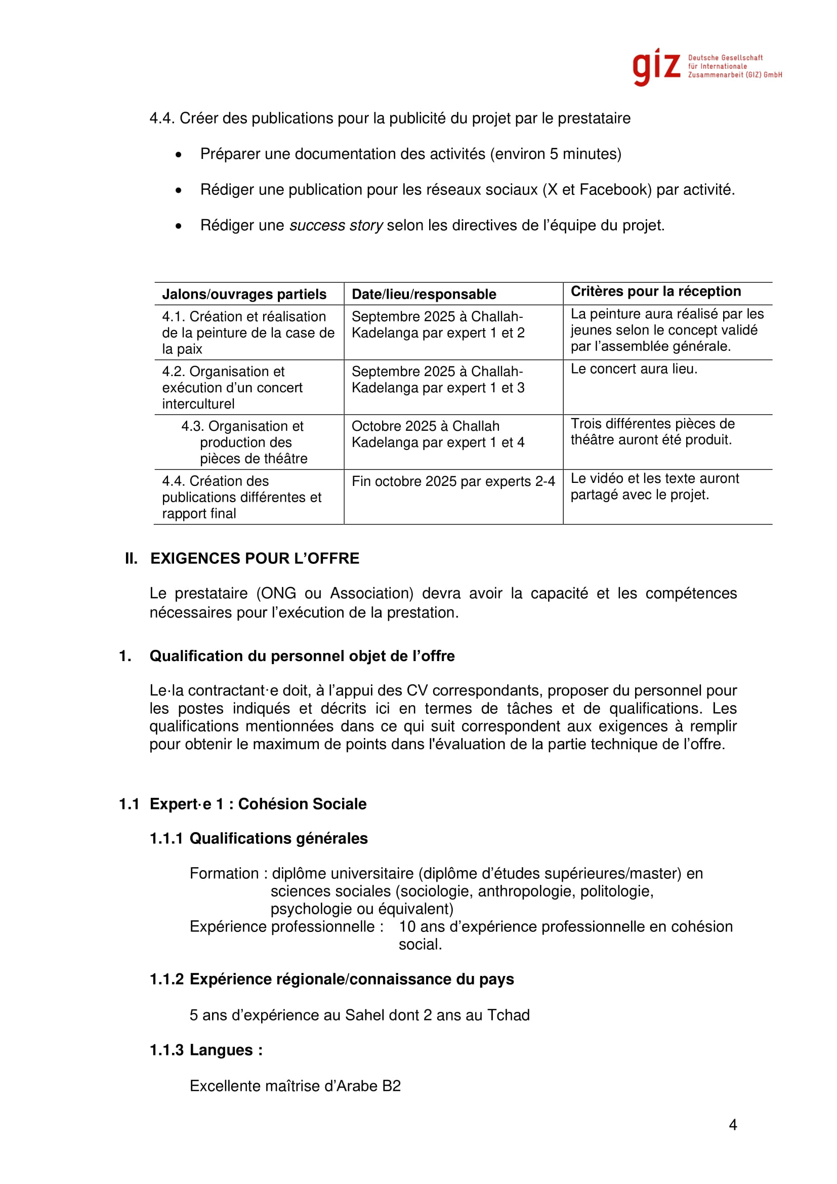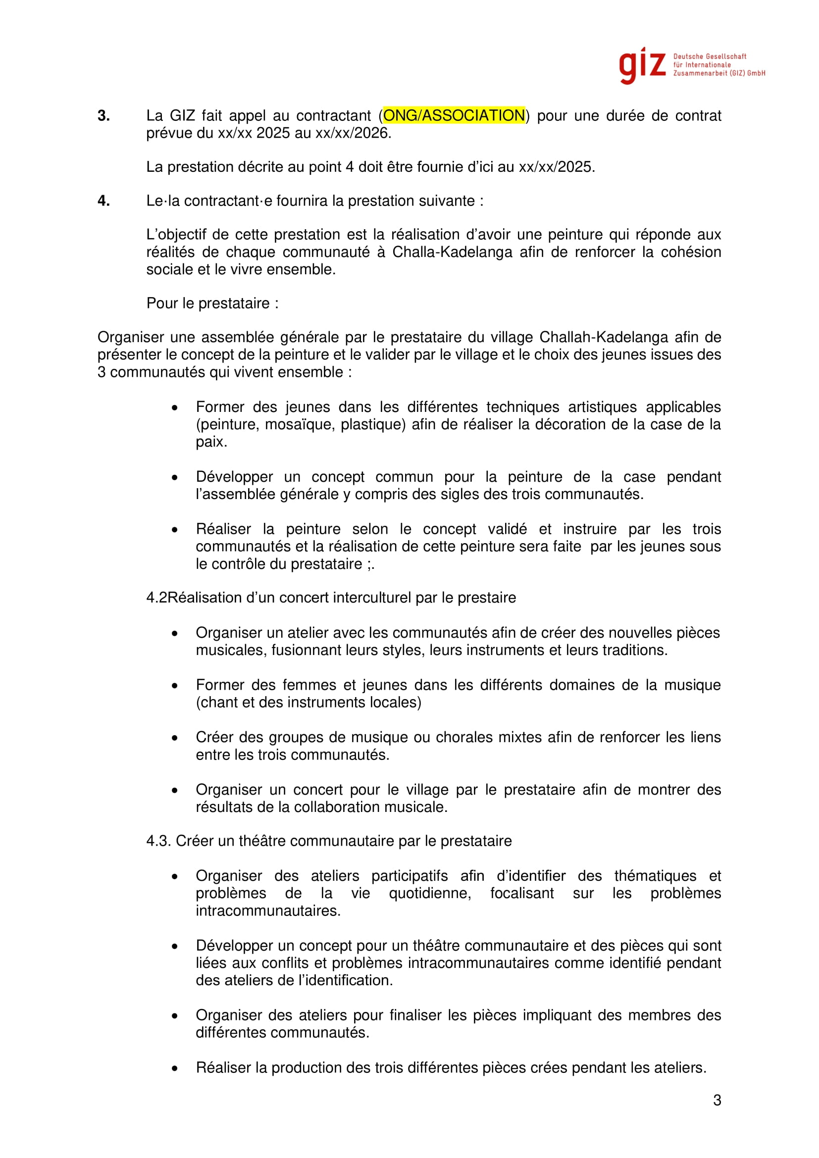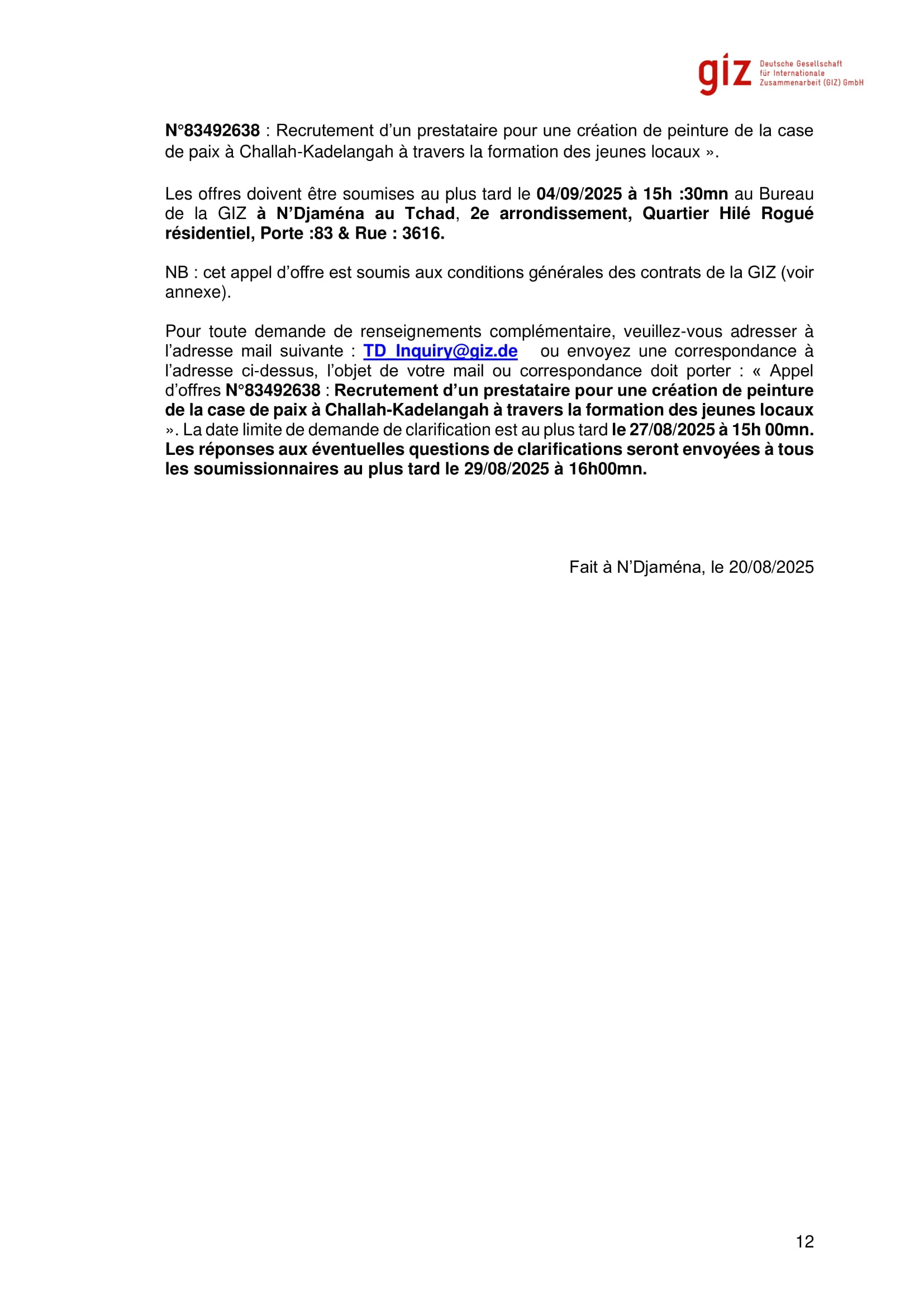 La GIZ lance un avis d’appel d’offres pour le recrutement d’un prestataire pour une création de peinture de la case de paix à Challah-Kadelangah à travers la formation des jeunes locaux, N’Djamena, Tchad