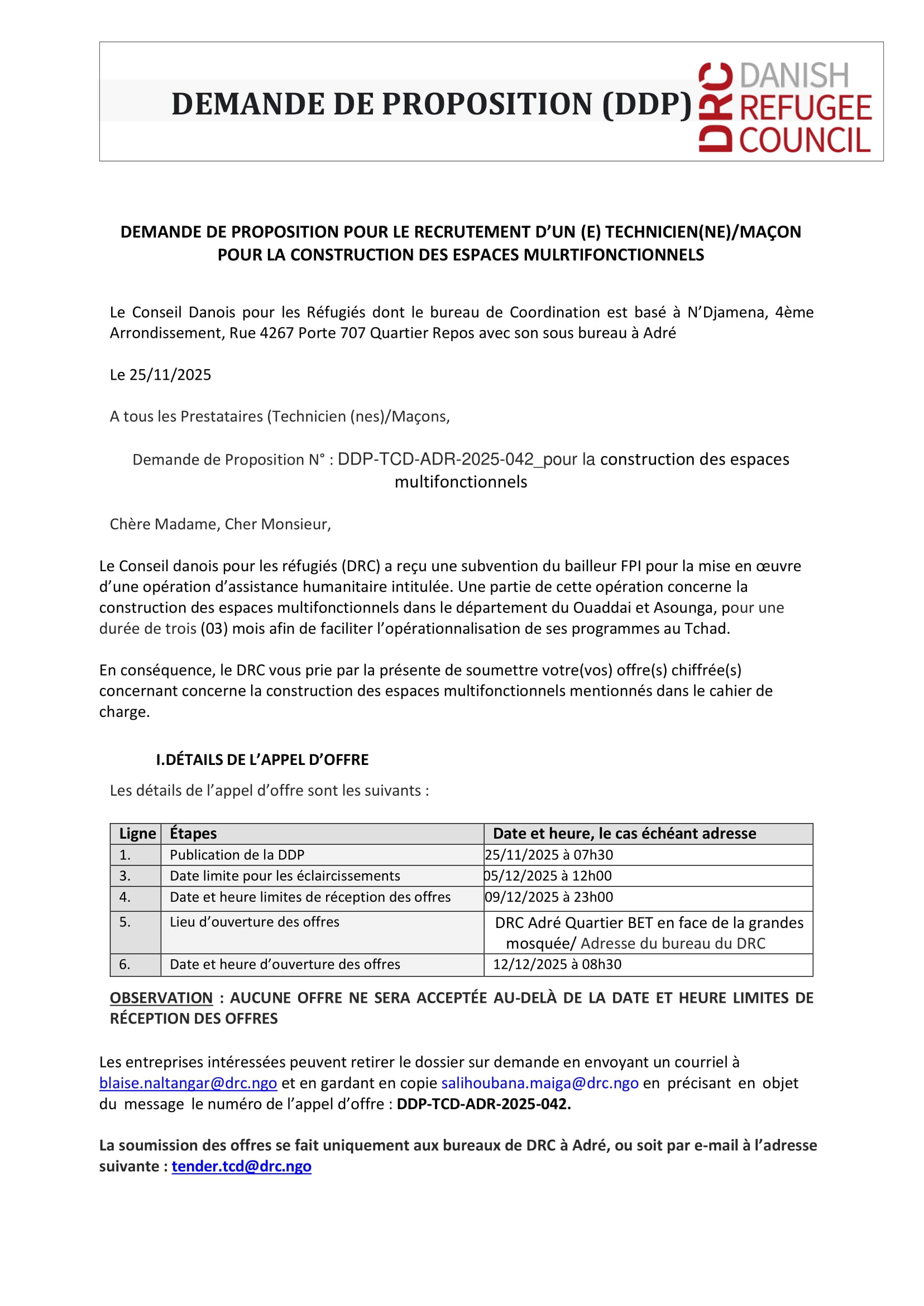 Le Conseil Danois pour les Refugiés (DRC) lance une demande de proposition pour le recrutement d’un technicien/maçon pour la construction des espaces multifonctionnels, N’Djamena, Tchad