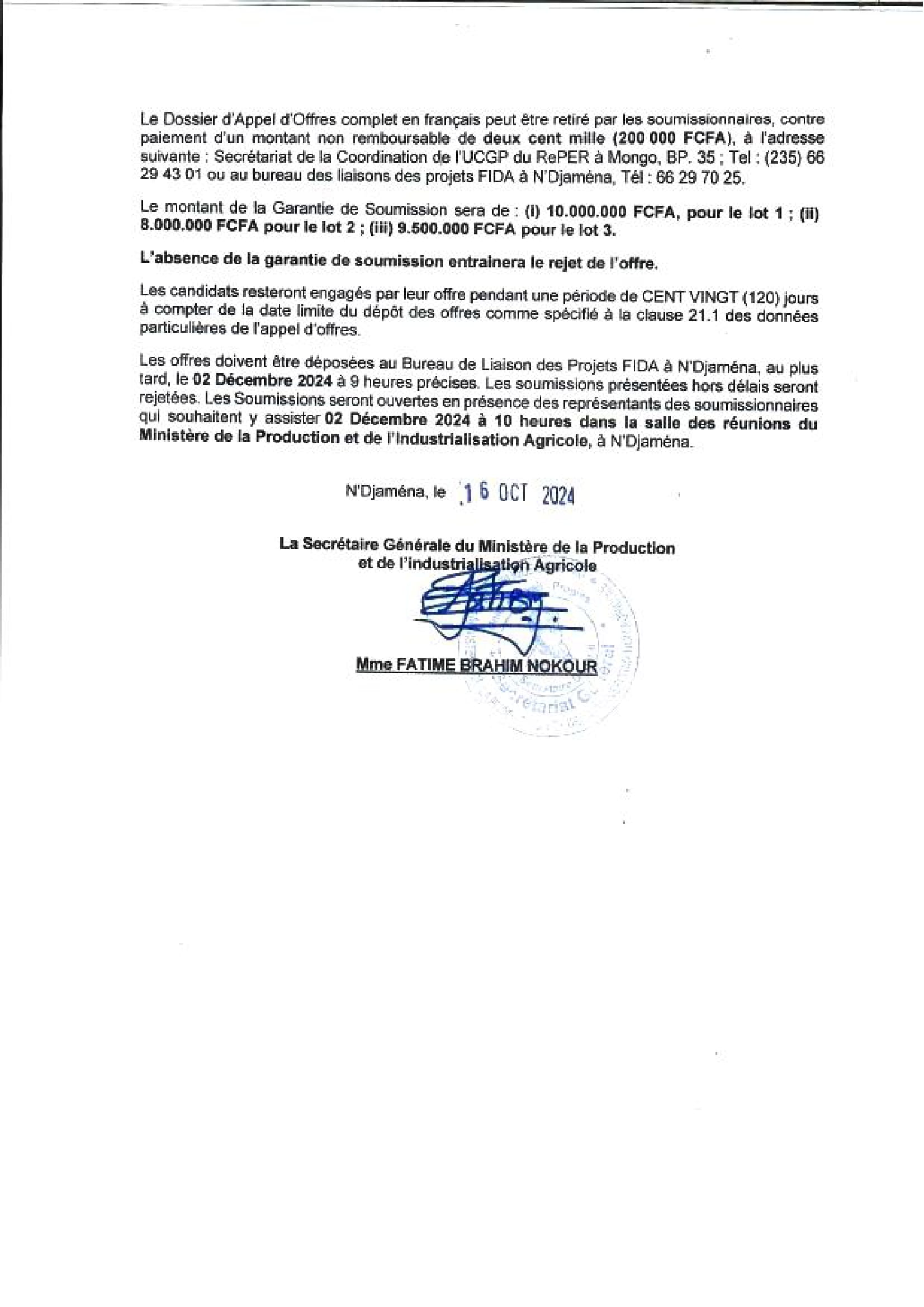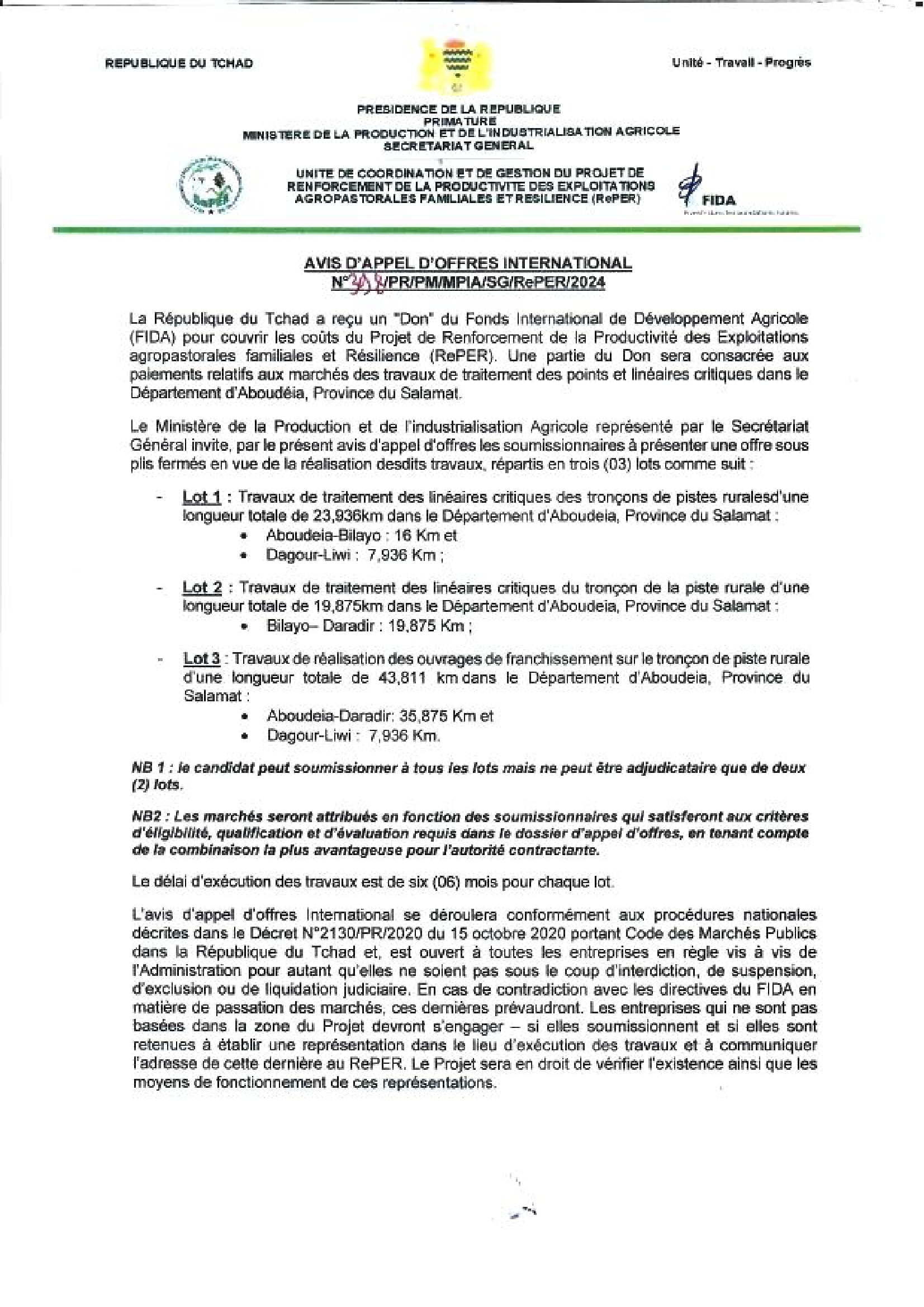 Le Fonds International de Développement Agricole (FIDA) lance un avis d’appel d’offres pour la réalisation desdits travaux repartis en trois (03) lots comme suit :