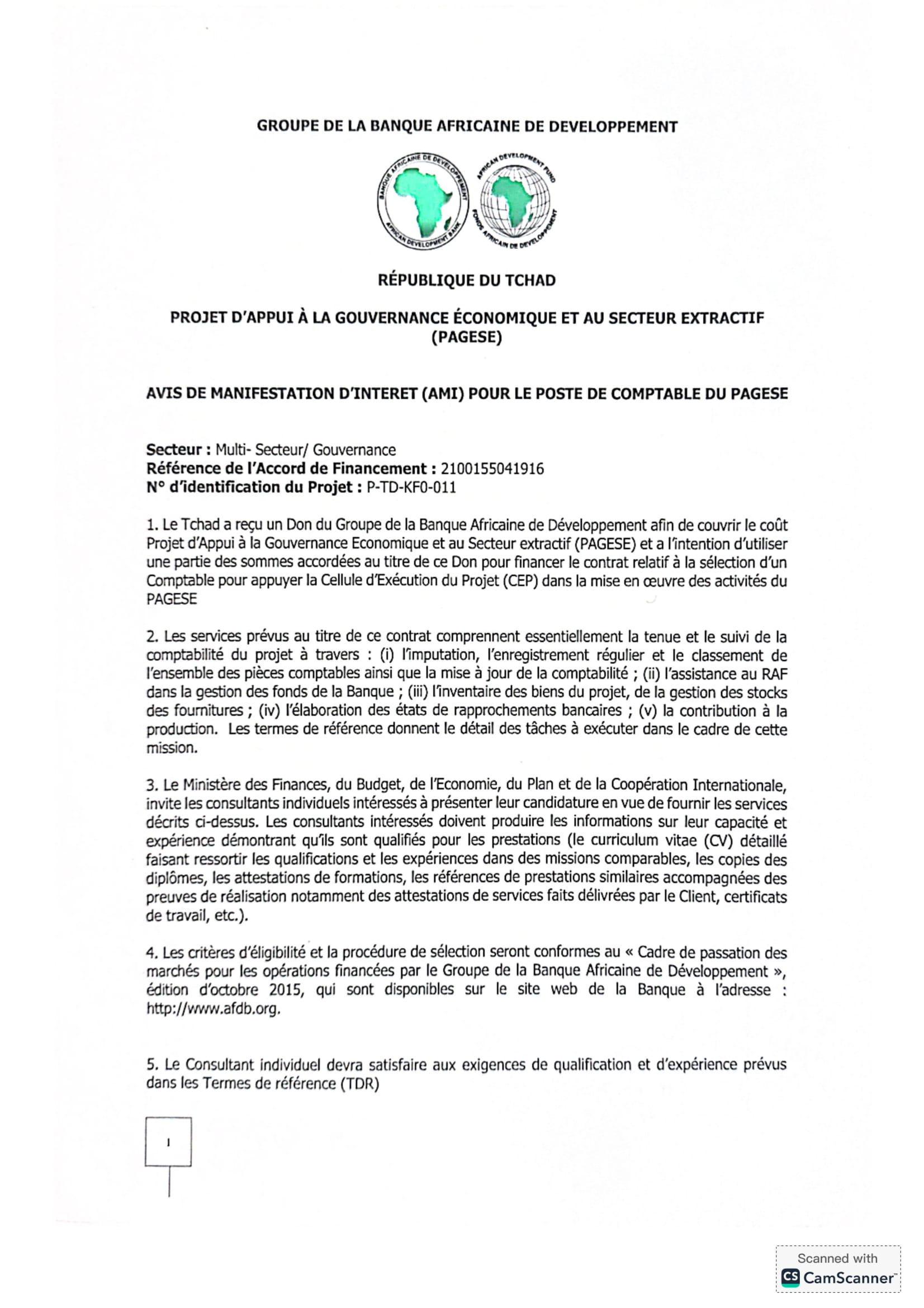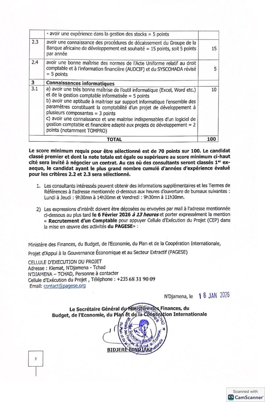 Le Groupe de la Banque Africaine de Développement lance un avis à manifestation d’intérêt (AMI) pour le poste de Comptable du PAGESE, Tchad Jan 16, 2026 Le Groupe de la Banque Africaine de Développement lance un avis à manifestation d’intérêt (AMI) pour le poste de Comptable du PAGESE, Tchad Share on FacebookTweetFollow usSaveLe Groupe accueil et solidarité (GAS) recrute un stagiaire accompagnement juridique des réfugiés et demandeurs d’asile vers le logement, Villejuif, FranceOXFAM recrute un coordinateur influence, campagnes et engagement citoyen (H/F), N’Djamena, TchadInternational Rescue Committee lance un avis d’appel d’offre pour la sélection d’un cabinet d’étude pour réaliser une étude d’évaluation de GAPS de couverture des besoins dans la zone d’intervention du programme respect, N’Djamena, Tchad Avis de formation pour l’obtention de la certification en techniques bancaires et financières : 100% en ligne