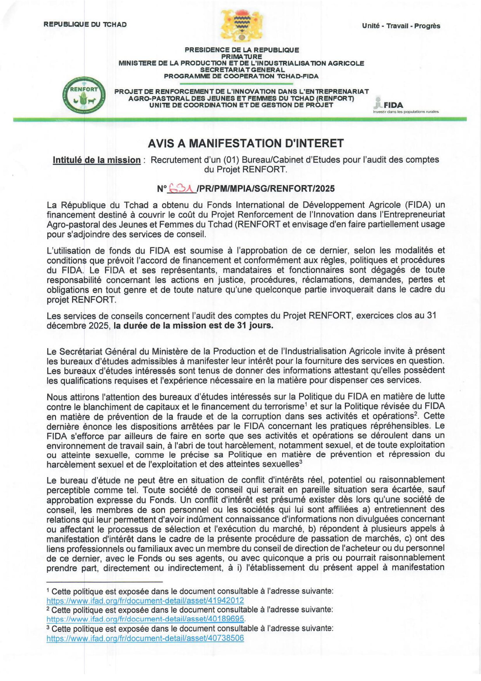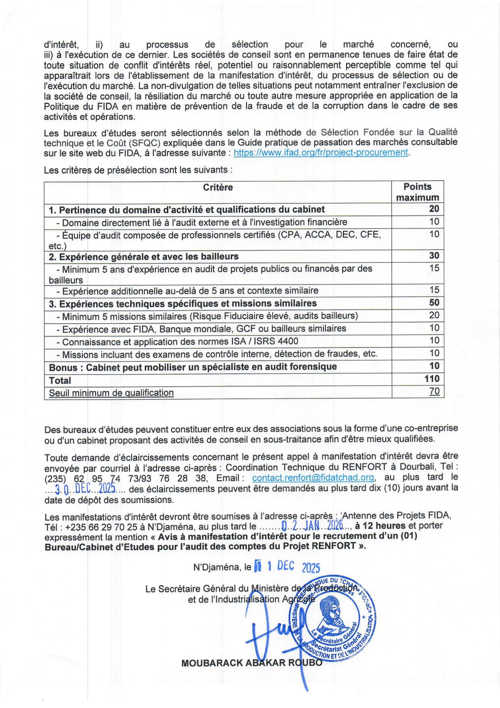 Le Ministère de la Production et de l’Industrialisation Agricole lance un avis à manifestation d’intérêt pour le recrutement d’un bureau/cabinet d’études pour l’audit des comptes du projet RENFORT, N’Djamena, Tchad