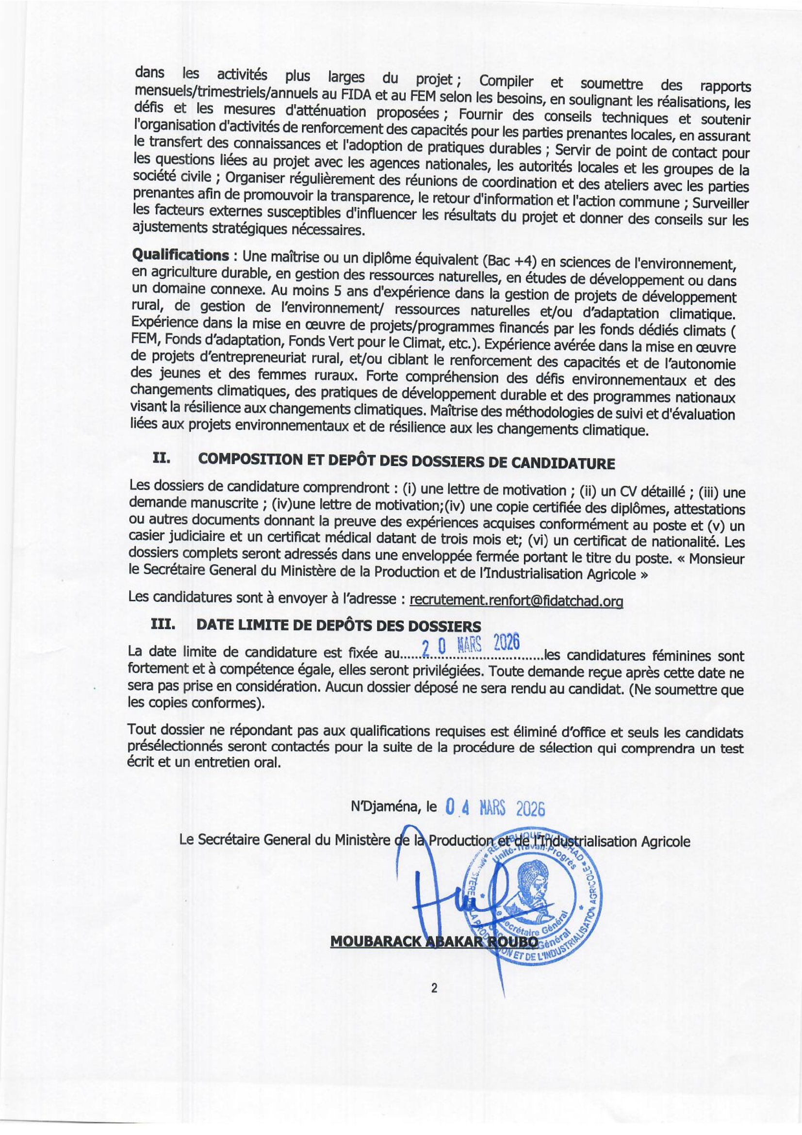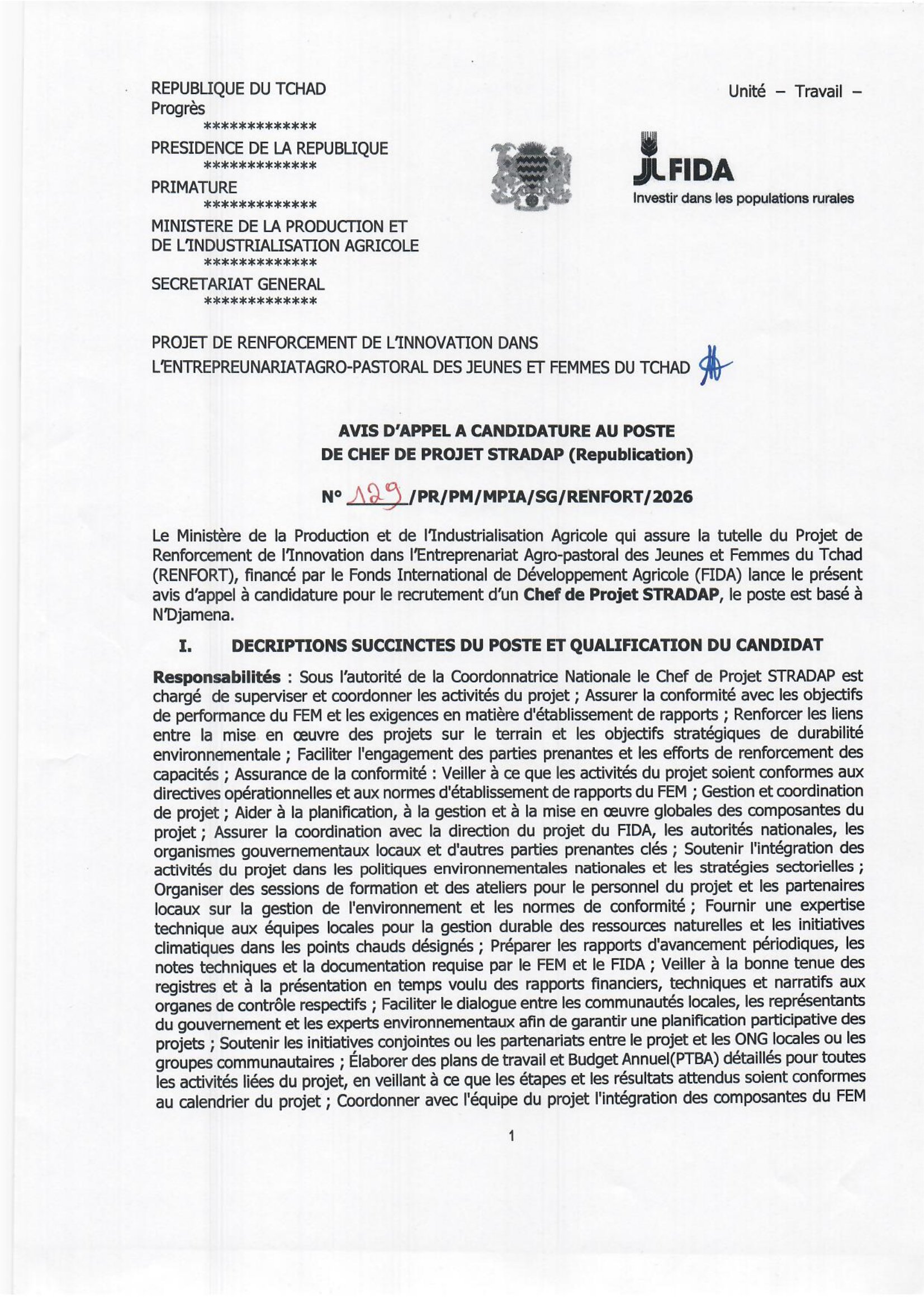 Le Ministère de la Production et de l’Industrialisation Agricole lance un avis d’appel à candidatures pour le recrutement d’un Chef de Projet STRADAP, N’Djamena, Tchad
