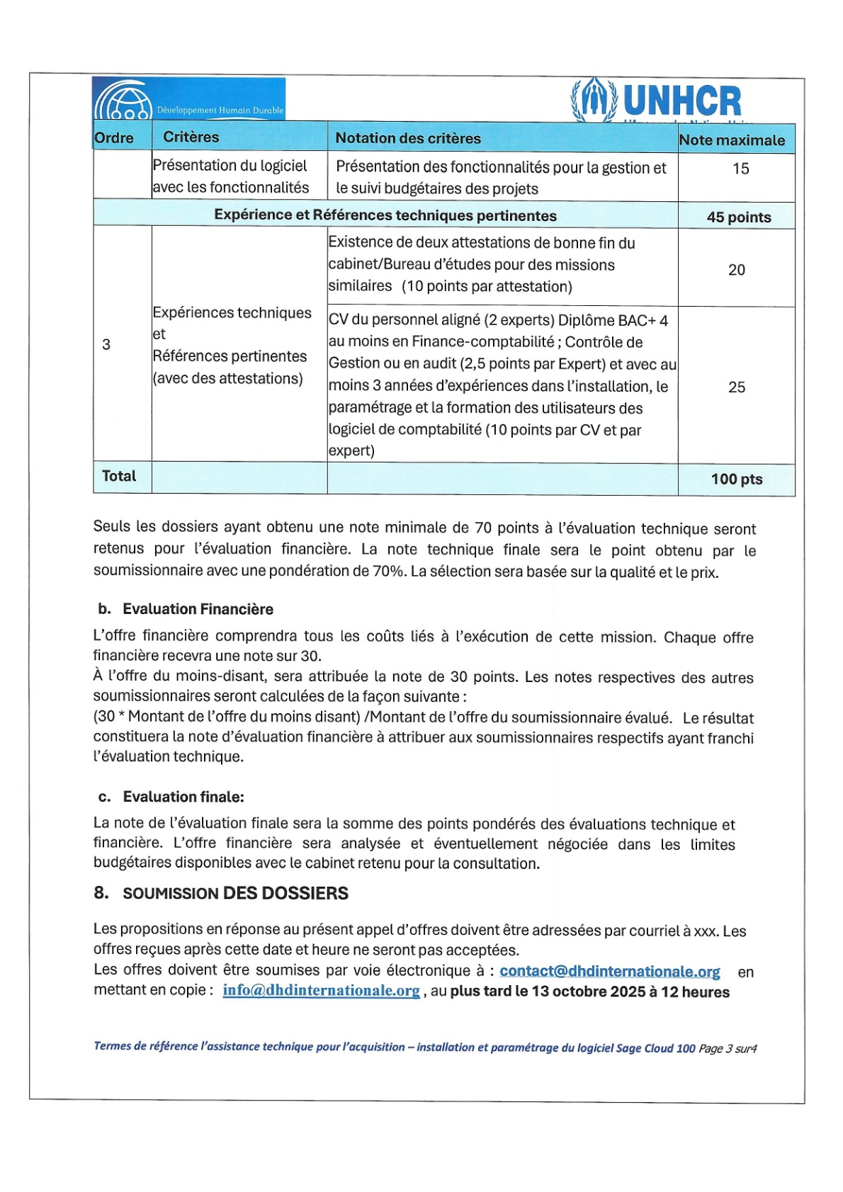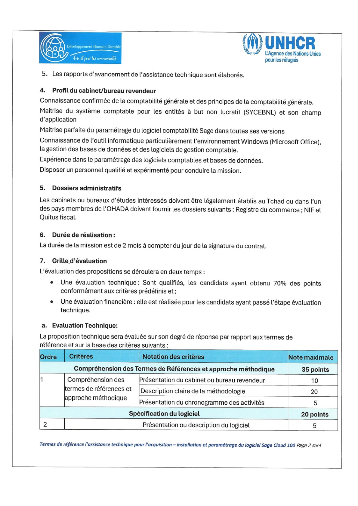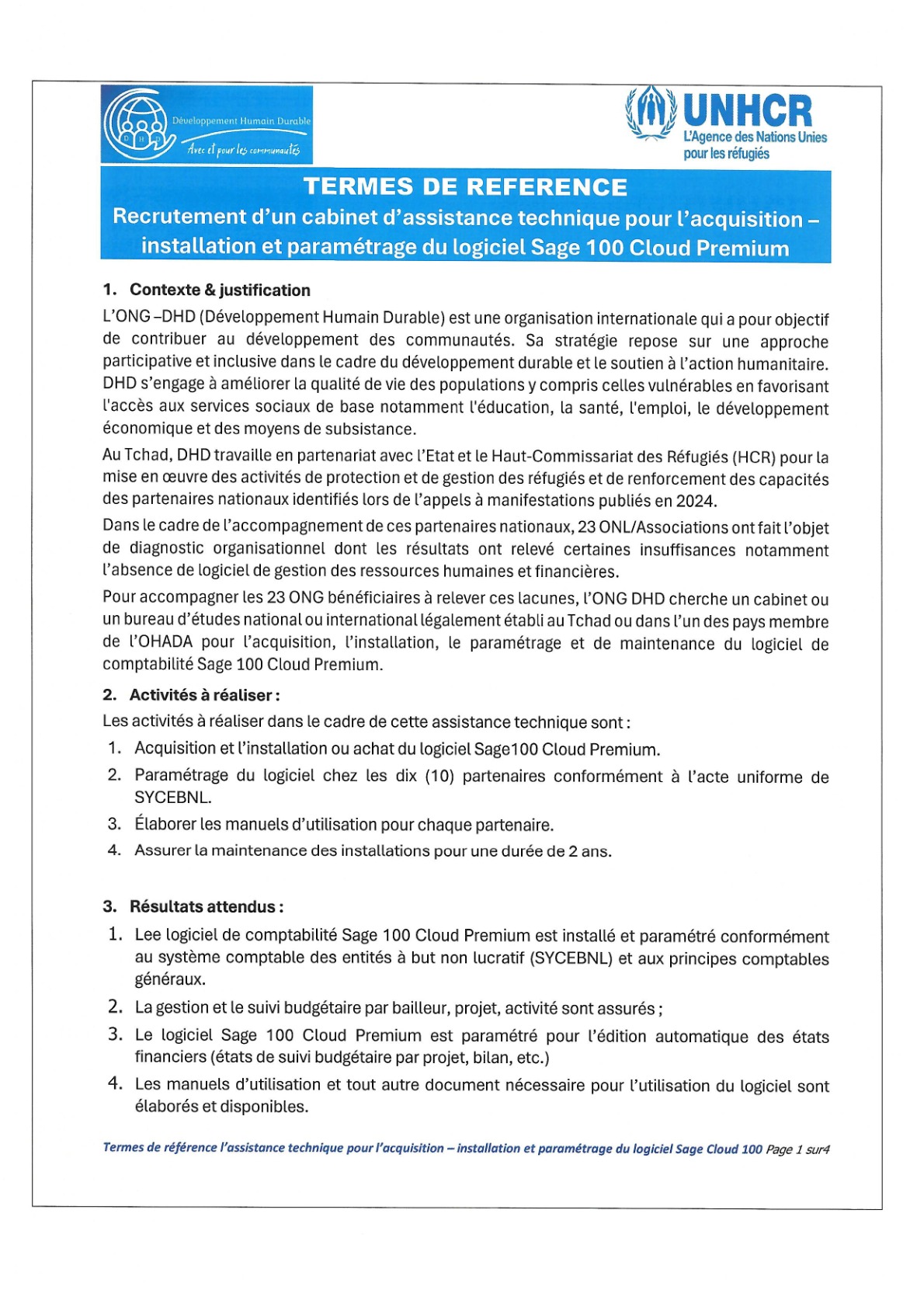 L’ONG Développement Humain Durable (DHD) en partenariat avec l’Agence des Nations Unies pour les Refugiés (UNHCR) lance un appel d’offre pour le recrutement d’un cabinet d’assistance technique pour l’acquisition, installation et paramétrage du logiciel Sage 100 Cloud Premium, N’Djamena, Tchad