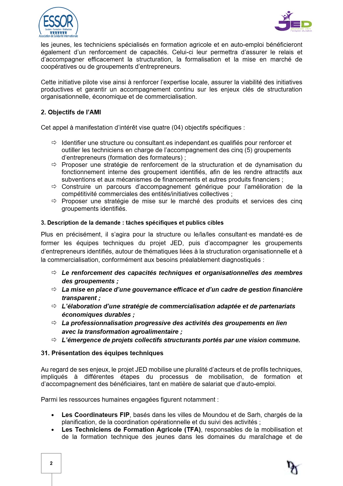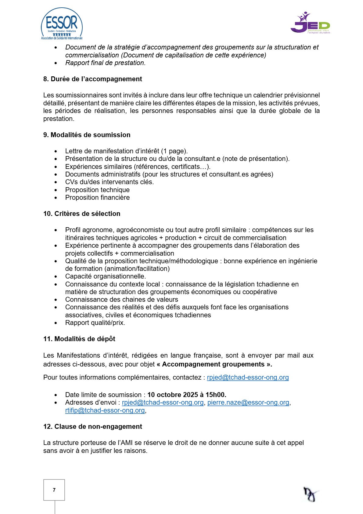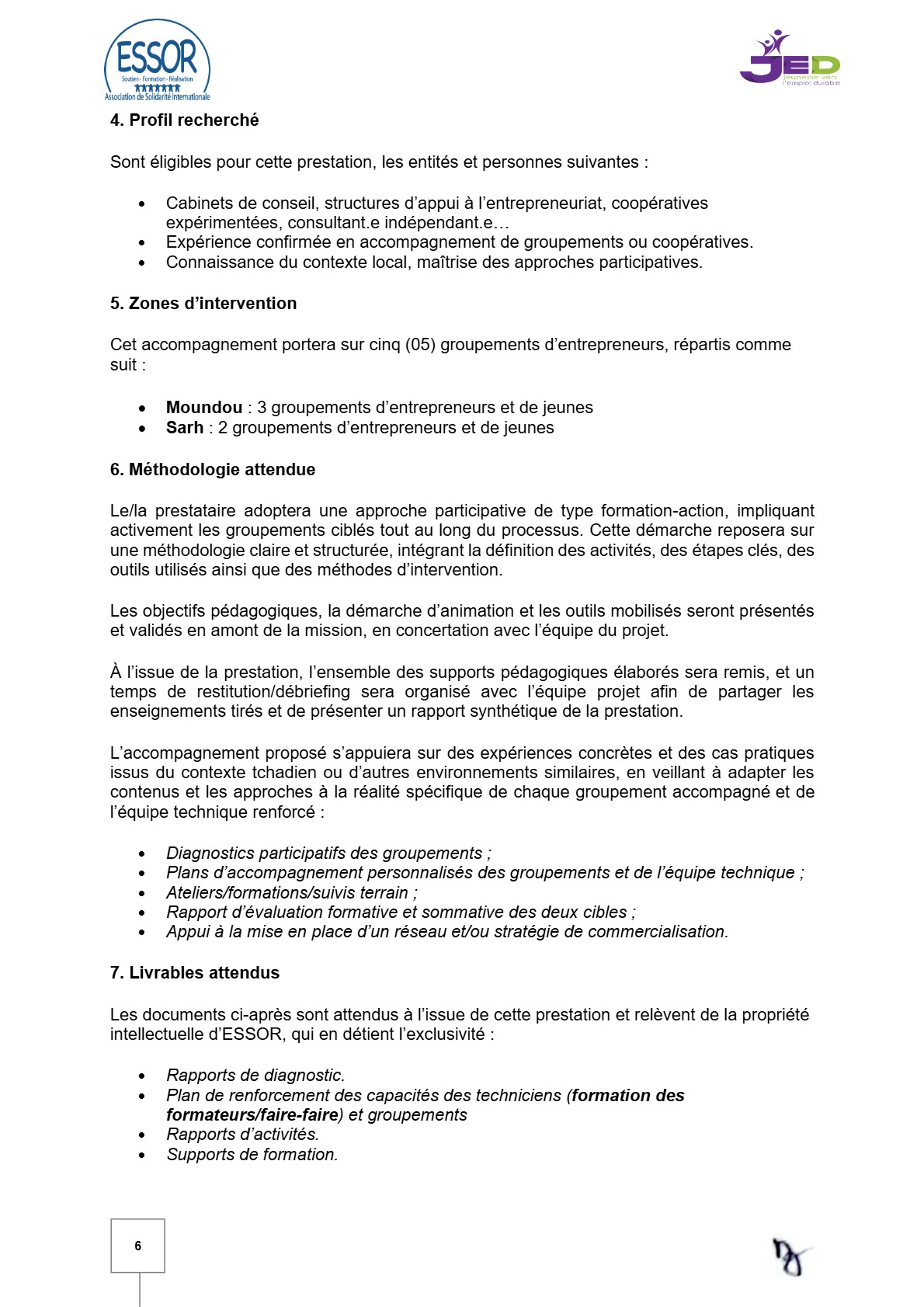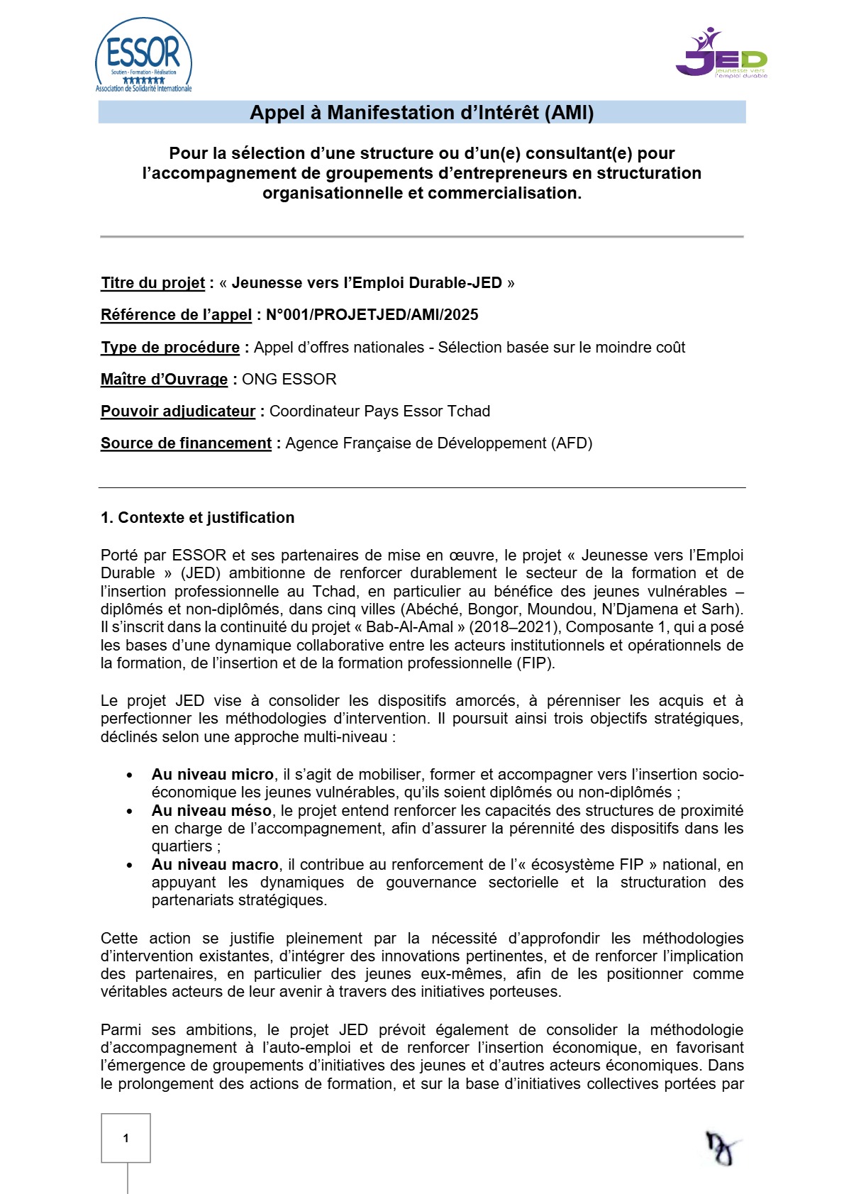 L’ONG ESSOR lance un avis d’appel à manifestation pour la sélection d’une structure ou d’un(e) consultant(e) pour l’accompagnement de groupements d’entrepreneurs en structuration organisationnelle et commercialisation, Tchad