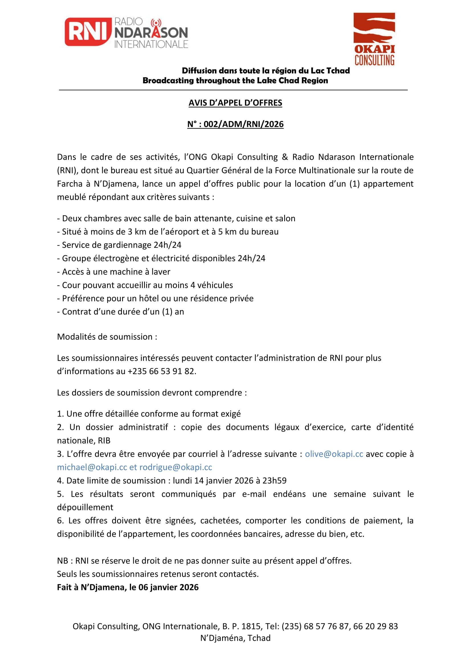 L’ONG Okapi Consulting & Radio Ndarason Internationale (RNI) lance un avis d’appel d’offre pour la location d’un appartement meublé, N’Djamena, Tchad Jan 7, 2026 L’ONG Okapi Consulting & Radio Ndarason Internationale (RNI) lance un avis d’appel d’offre pour la location d’un appartement meublé, N’Djamena, Tchad Share on FacebookTweetFollow usSaveLe Groupe accueil et solidarité (GAS) recrute un stagiaire accompagnement juridique des réfugiés et demandeurs d’asile vers le logement, Villejuif, FranceOXFAM recrute un coordinateur influence, campagnes et engagement citoyen (H/F), N’Djamena, TchadInternational Rescue Committee lance un avis d’appel d’offre pour la sélection d’un cabinet d’étude pour réaliser une étude d’évaluation de GAPS de couverture des besoins dans la zone d’intervention du programme respect, N’Djamena, Tchad Avis de formation pour l’obtention de la certification en techniques bancaires et financières : 100% en ligne