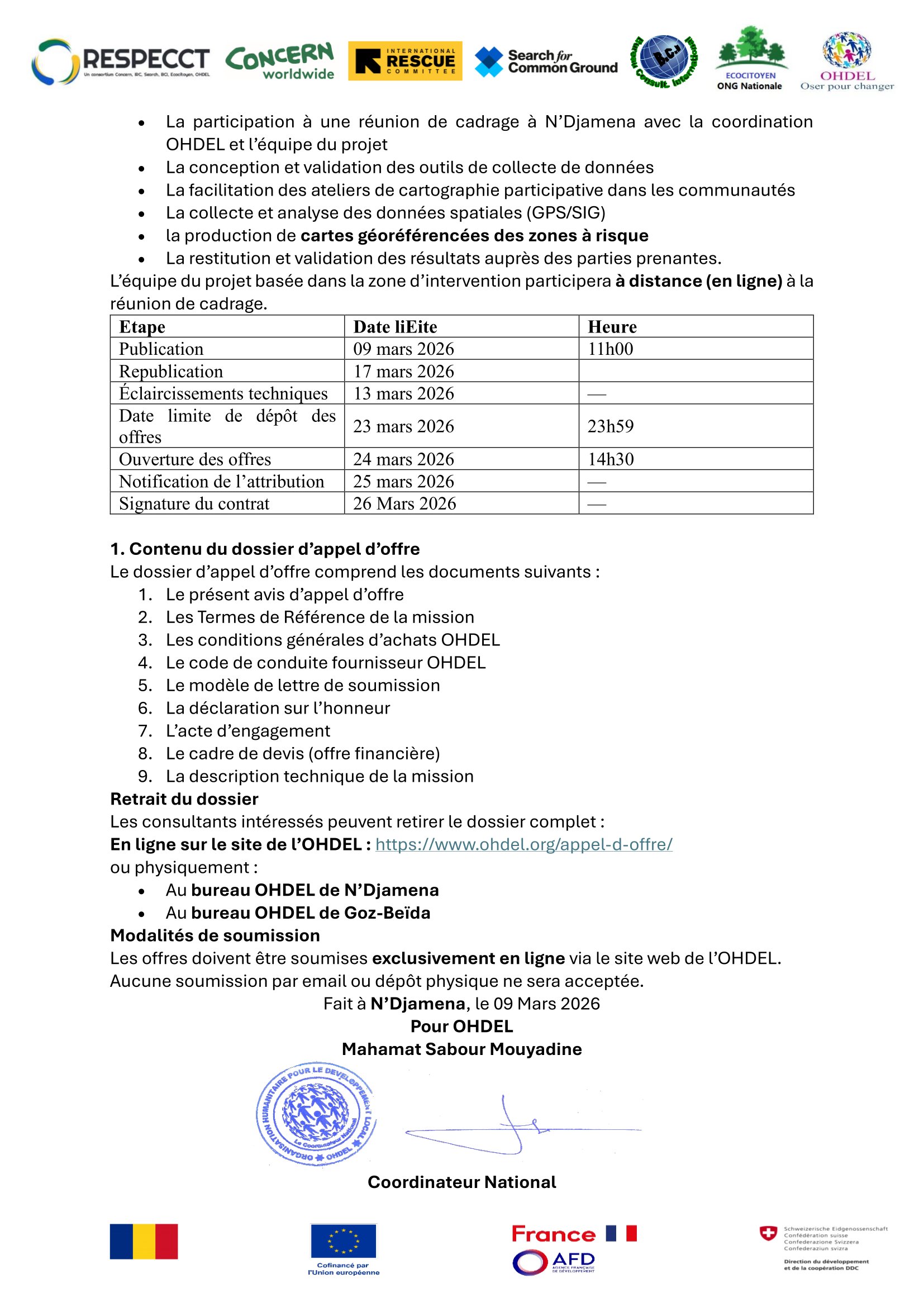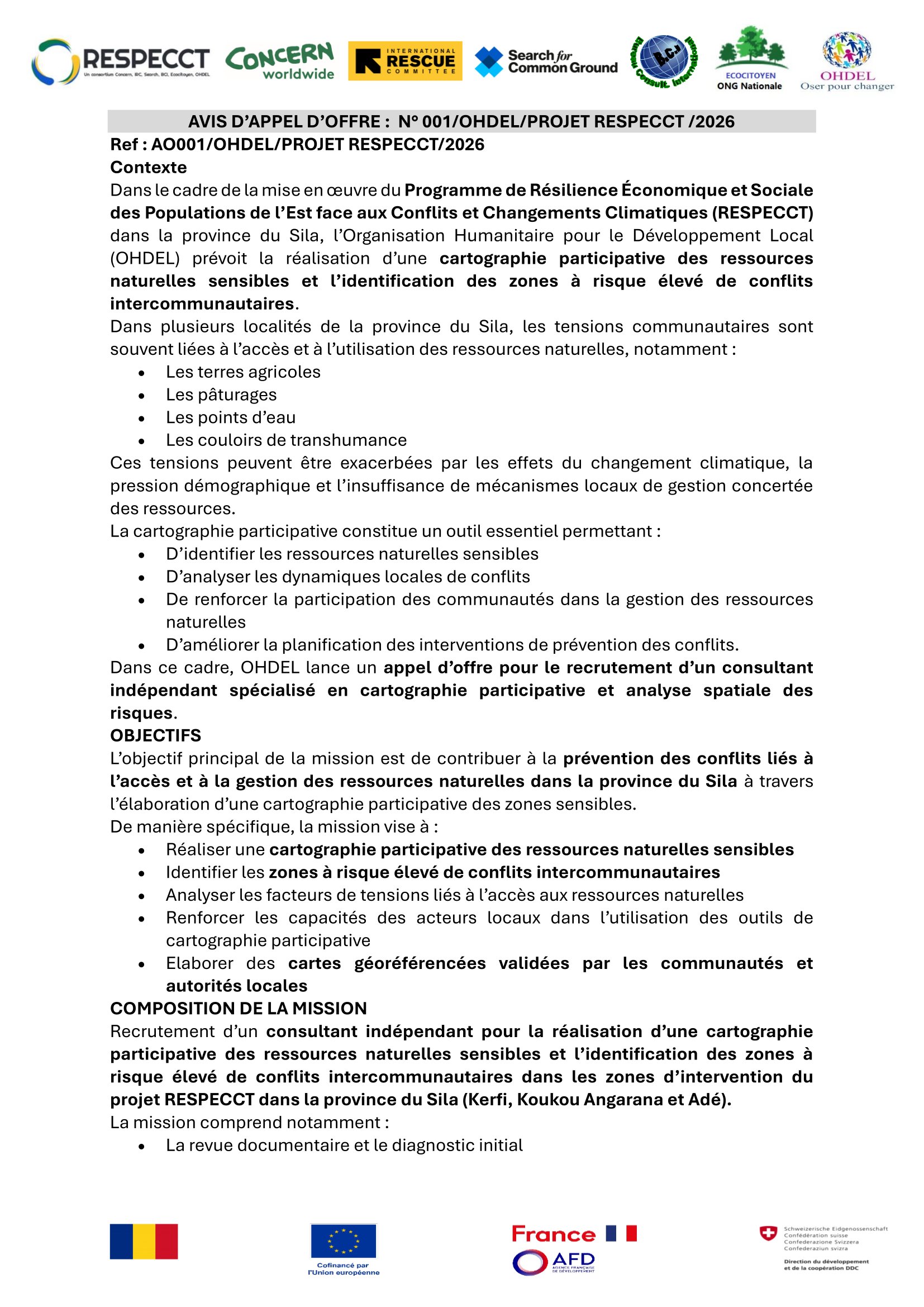 L’Organisation Humanitaire pour le Développement Local (OHDEL) lance un appel d’offre pour le recrutement d’un consultant indépendant spécialisé en cartographie participative et analyse spatiale des risques N’Djamena, Goz-Beïda, Tchad
